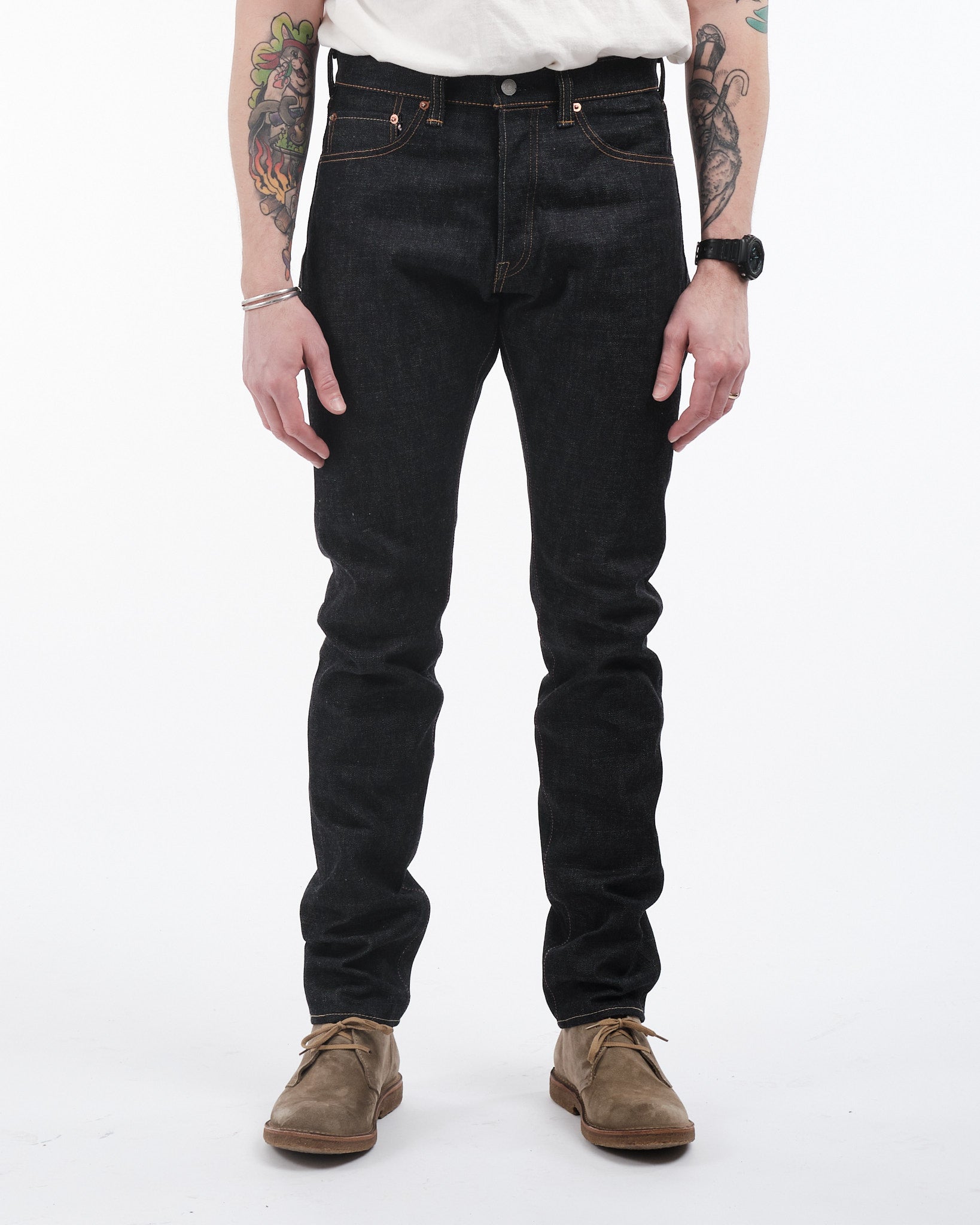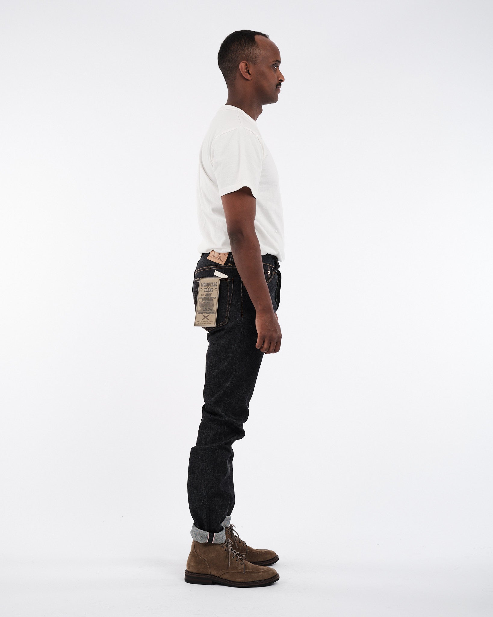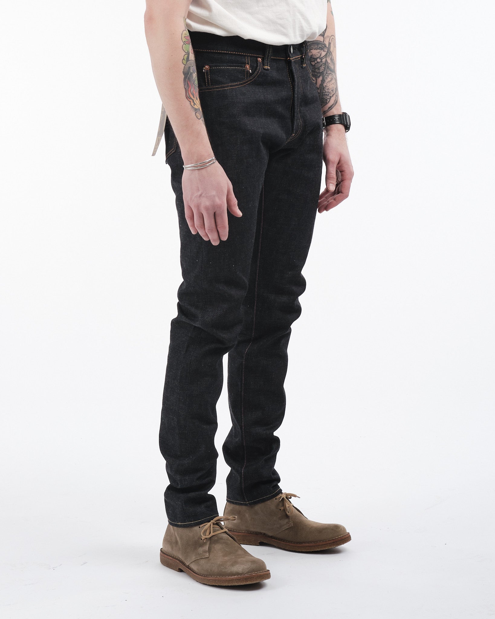 De 0405 "High Tapered" pasvorm is een broertje van de natuurlijke taper, en biedt een slanker profiel over zijn kenmerken. Met een minder hoge taille en meer aansluitende dij, versmallen de jeans agressief naar een aansluitende beenopening, wat tegemoetkomt aan degenen die de voorkeur geven aan "skinny jeans" styling. De stof met lage spanning en slubby textuur evolueert met dragen, en belooft een individuele look naarmate de indigo kleurstof vervaagt.