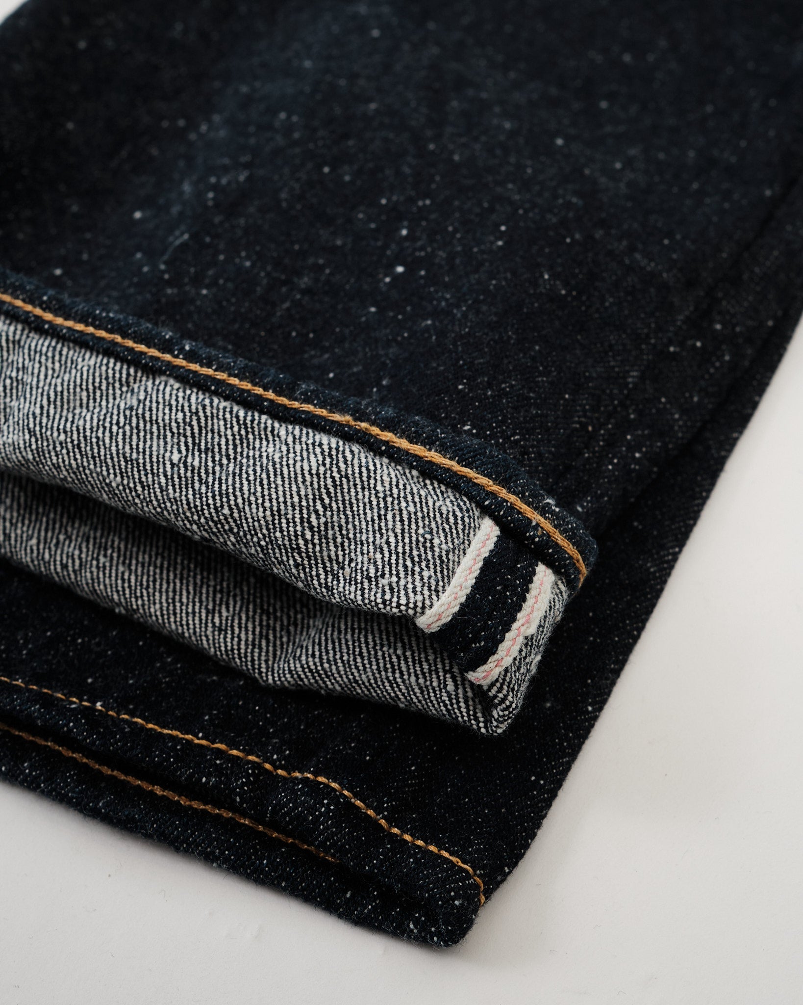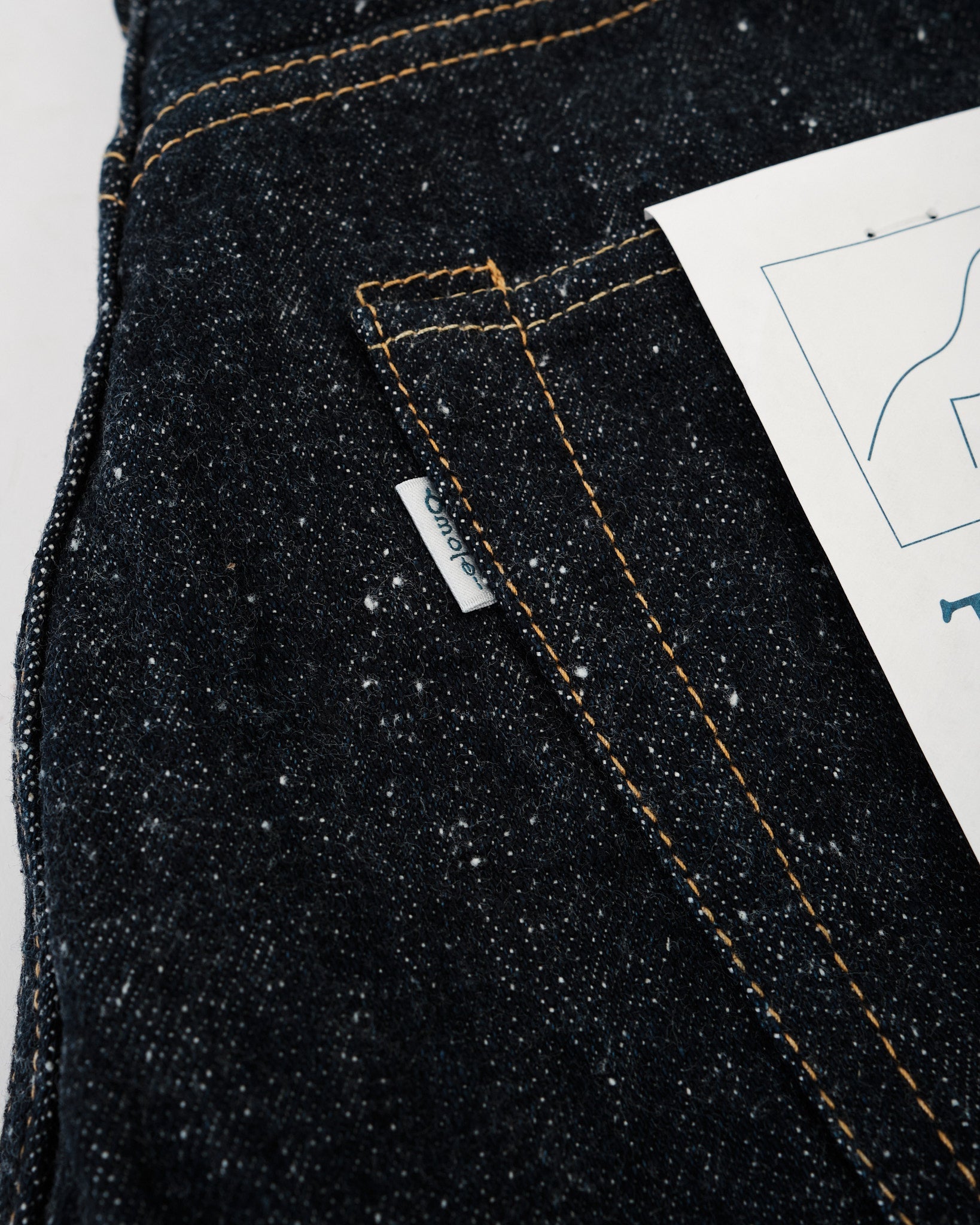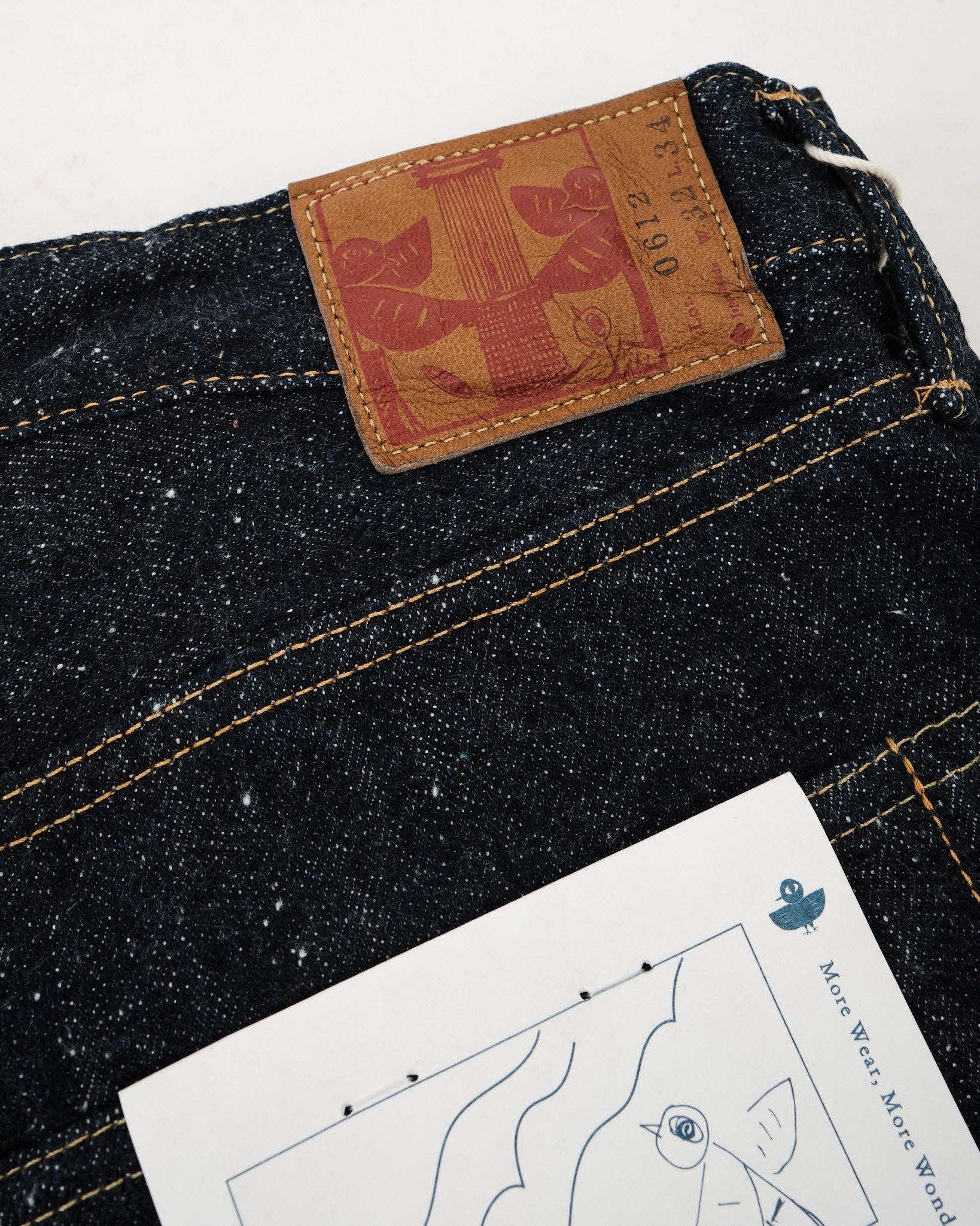 De OMOTO 0612 Relax Jeans bieden een perfecte balans tussen comfort en vakmanschap, gemaakt van 16oz nep denim met een kenmerkende getextureerde afwerking. De inslagdraden mengen korte katoenvezels (27mm of minder) voor een onregelmatige, ruige look, terwijl de kettingdraden zijn gesponnen met de traditionele “gara-bo” techniek, wat zorgt voor een rustieke, handgesponnen textuur met een luchtig, ademend gevoel.