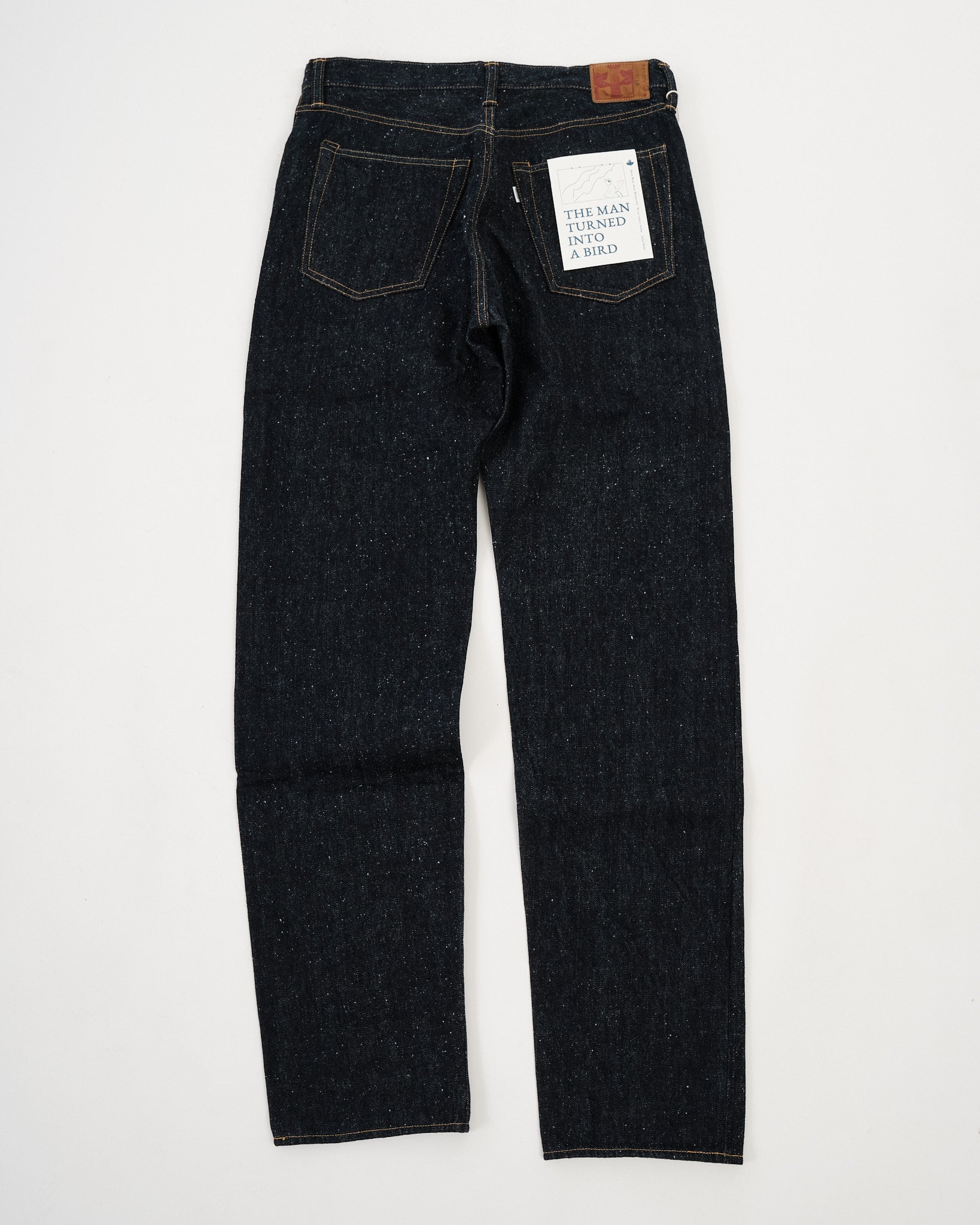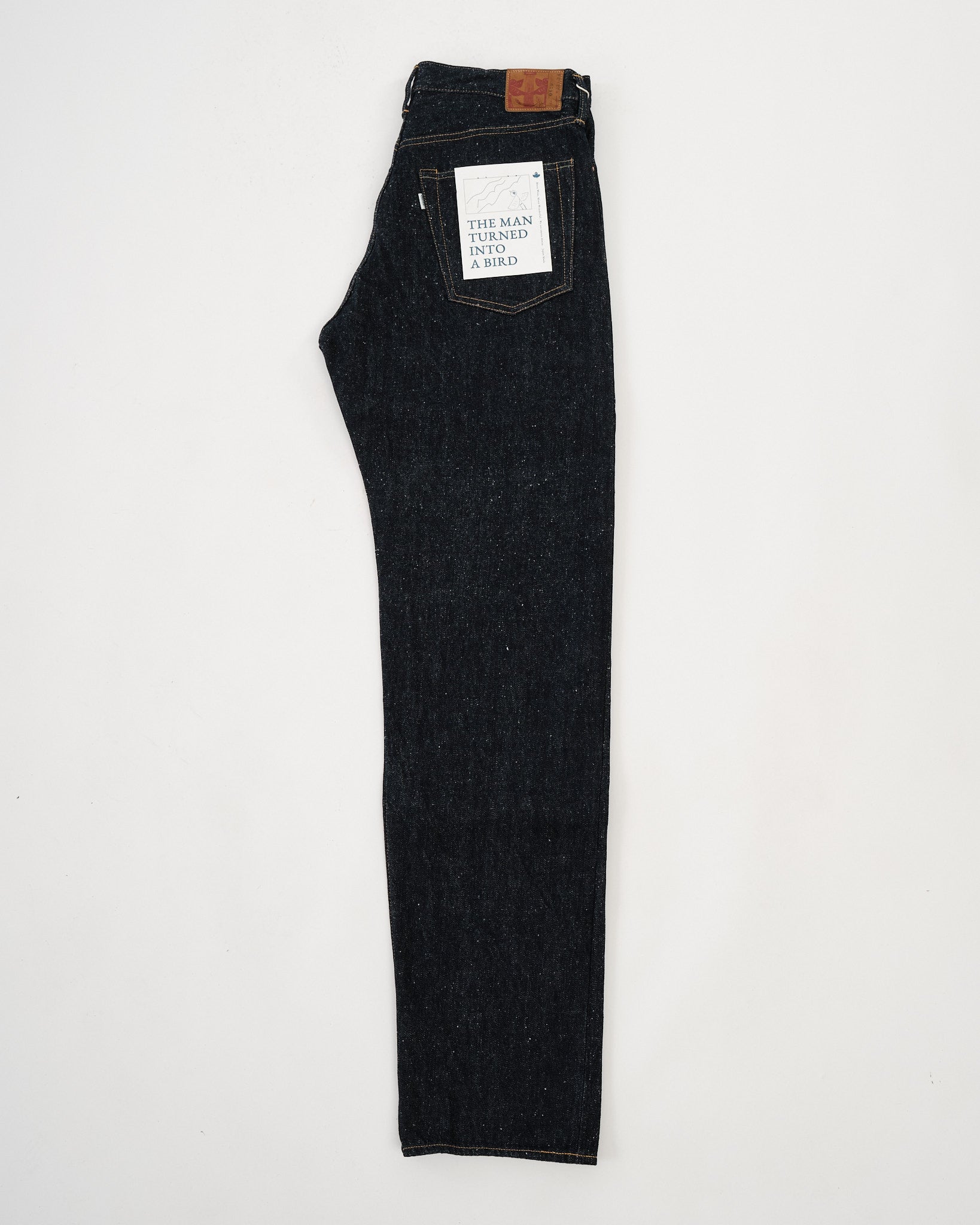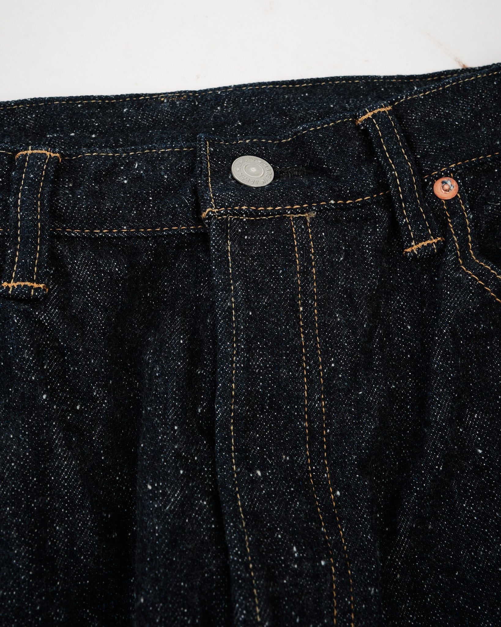 De OMOTO 0612 Relax Jeans bieden een perfecte balans tussen comfort en vakmanschap, gemaakt van 16oz nep denim met een kenmerkende getextureerde afwerking. De inslagdraden mengen korte katoenvezels (27mm of minder) voor een onregelmatige, ruige look, terwijl de kettingdraden zijn gesponnen met de traditionele “gara-bo” techniek, wat zorgt voor een rustieke, handgesponnen textuur met een luchtig, ademend gevoel.