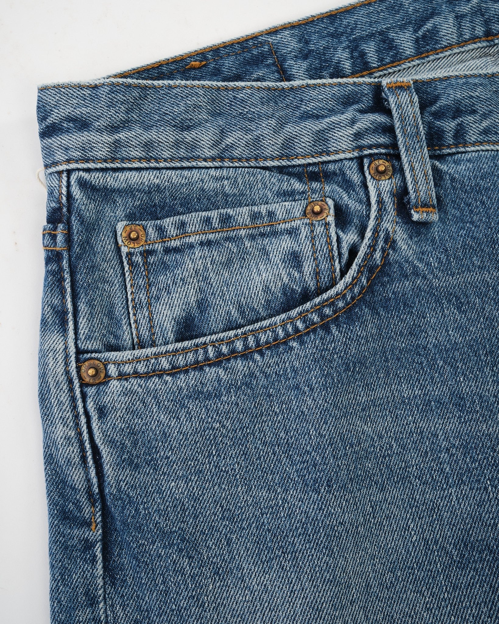 • Details: Knoopsluiting, vijf zakken, goudkleurig stiksel, geoxideerde koperen klinknagels en papieren taillelabel