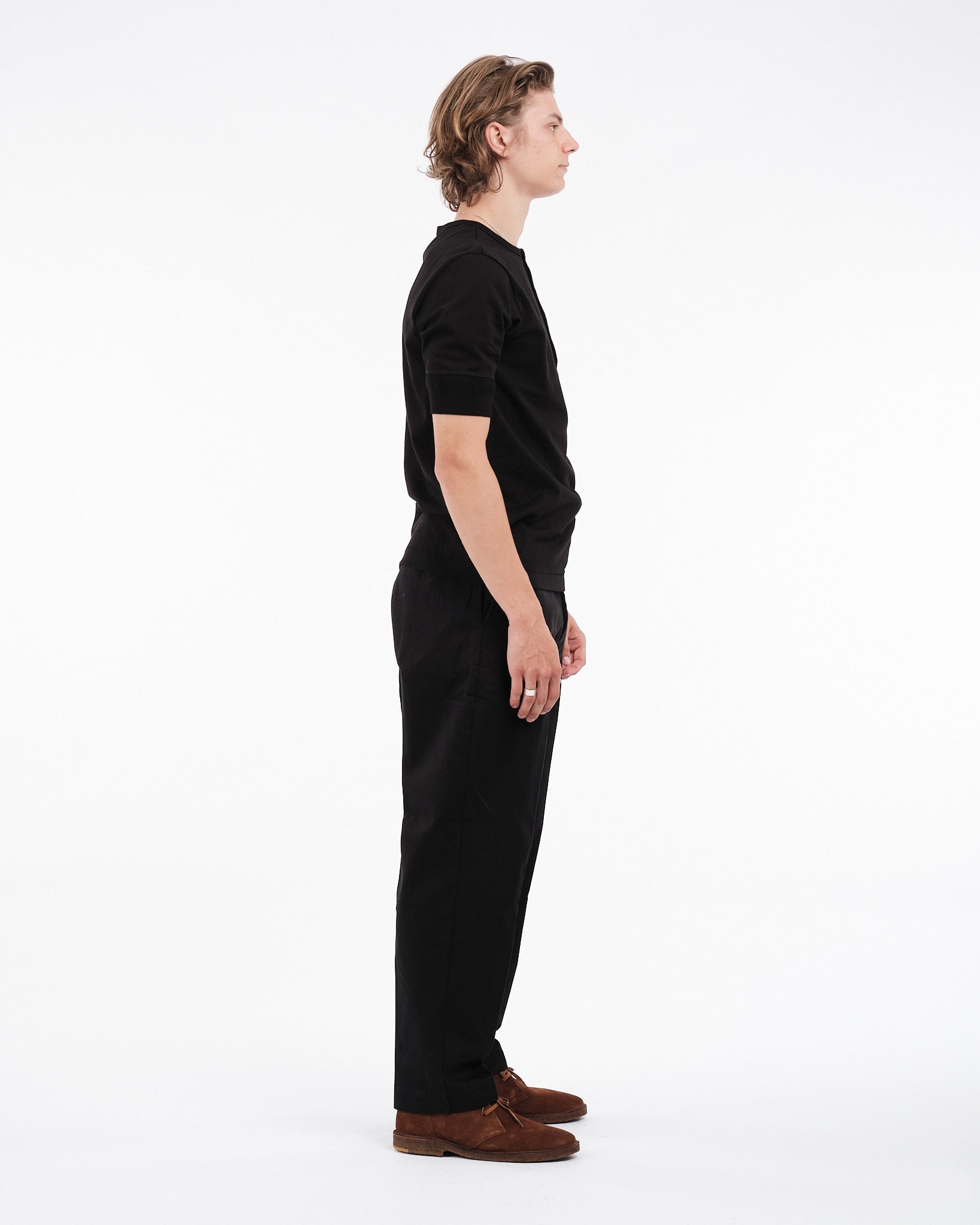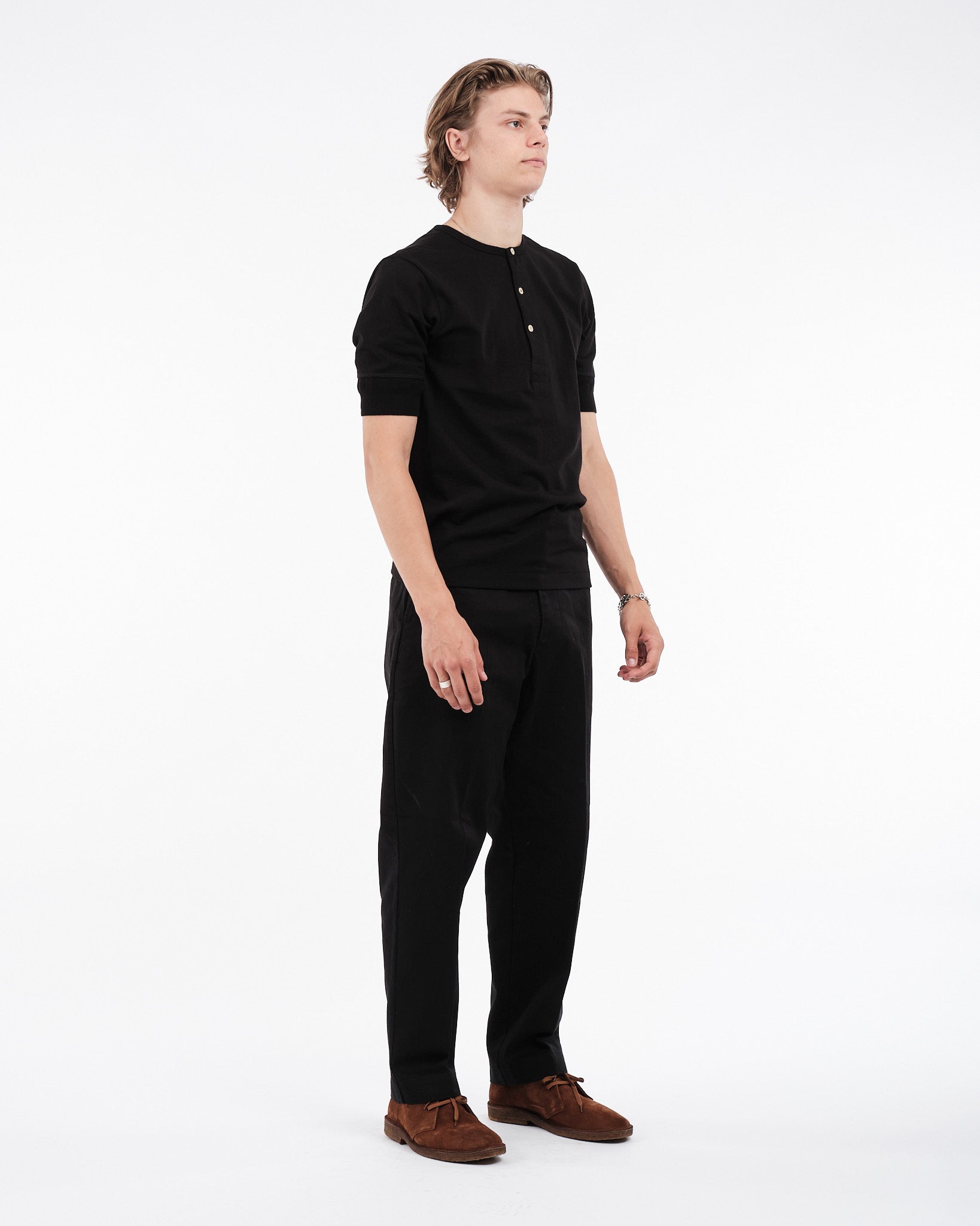 De Merz B Schwanen 207 Mens Loopwheeled Henley in Diep Zwart combineert vakmanschap met hedendaagse gezelligheid feilloos. Het is vervaardigd uit biologisch katoen met gebruik van authentieke loopwieltechnieken voor duurzaamheid en een luxueus gevoel. Met zijn 2-draads stof en tijdloos passend ontwerp, vult het moeiteloos elke outfit aan. Bovendien verhoogt de toevoeging van parelmoeren knopen en een geweven onderlaag langs de knopenrij zijn elegantie. Dit Henley shirt is gemaakt voor comfort zonder zij naden en heeft een rechte zoomlijn—een absolute must-have voor je garderobe! Houd er rekening mee dat dit shirt klein uitvalt; het is raadzaam om een maat groter te bestellen dan je gebruikelijke pasvorm.