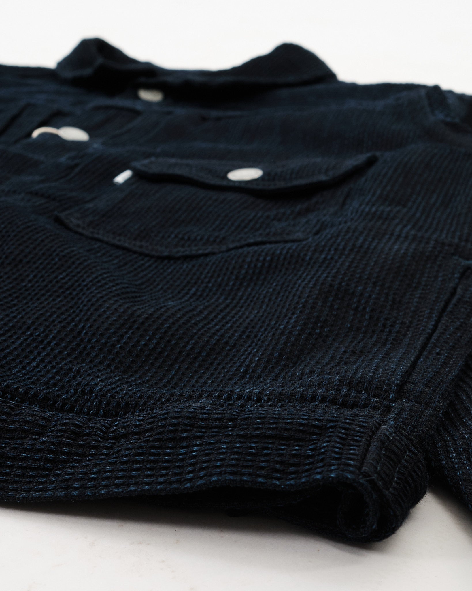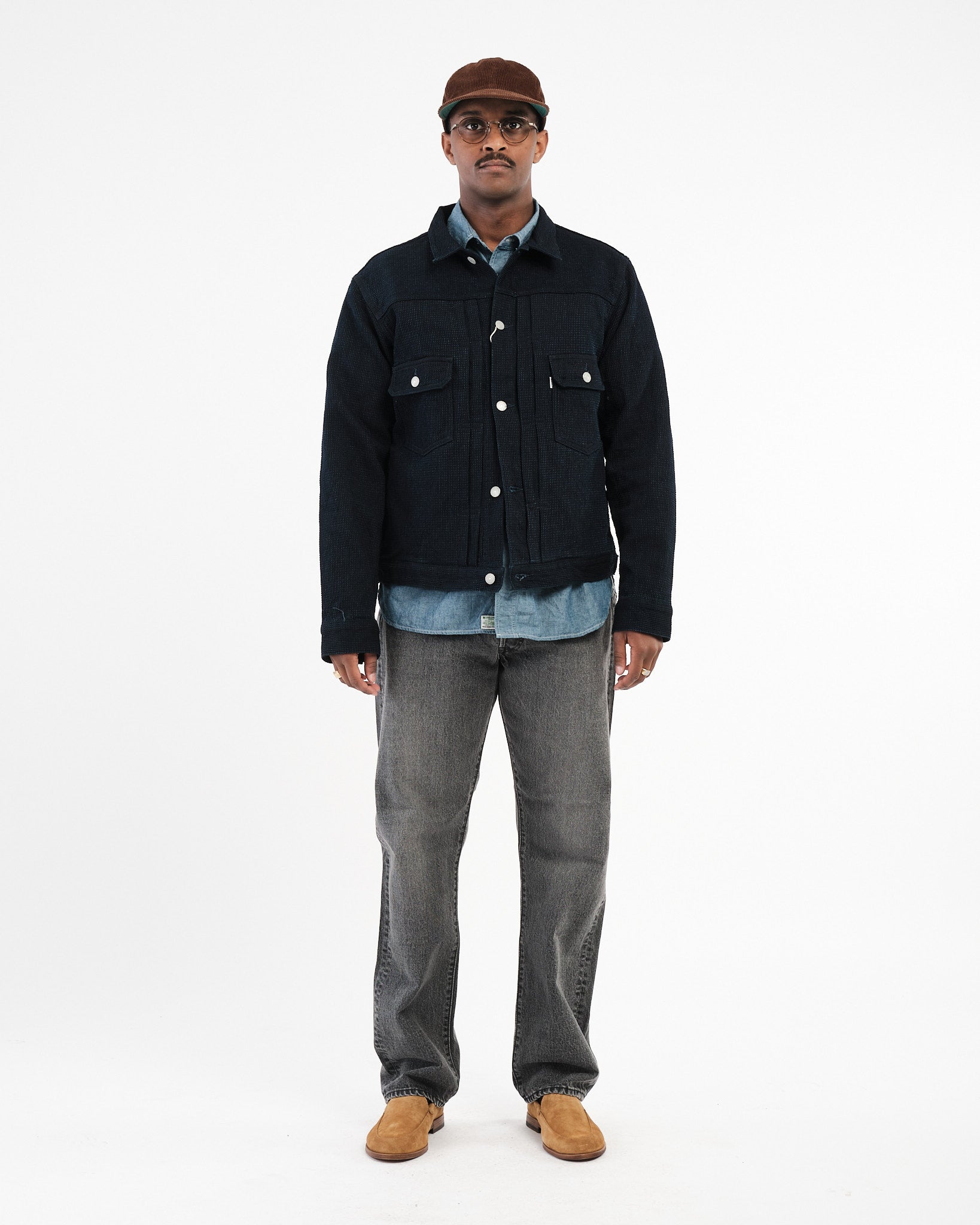 Afwerkingsdetails omvatten OMOTO's kenmerkende blauw-groene “MIMI” selvedge, een op maat gemaakt merk schapenleren label, en versterkte stiksels voor levensduur. Functionele borstzakken, originele metalen knopen, en precieze sashiko textuur details maken deze jas een tijdloze toevoeging aan elke garderobe.
