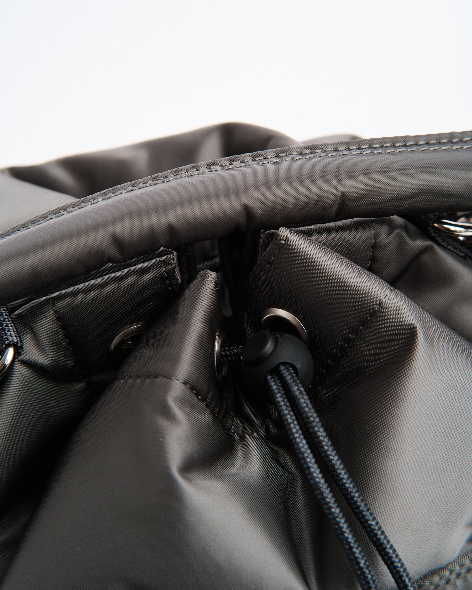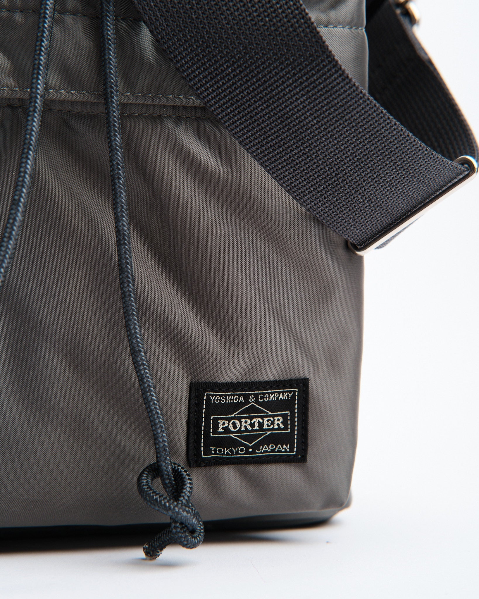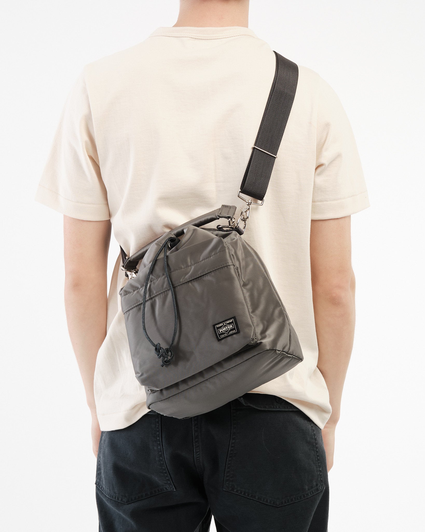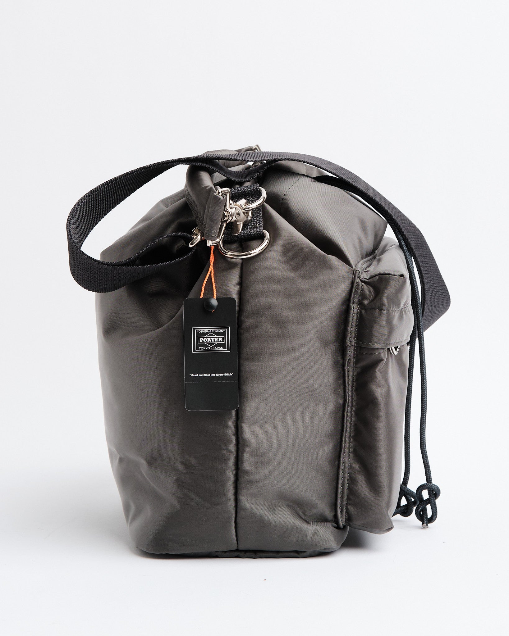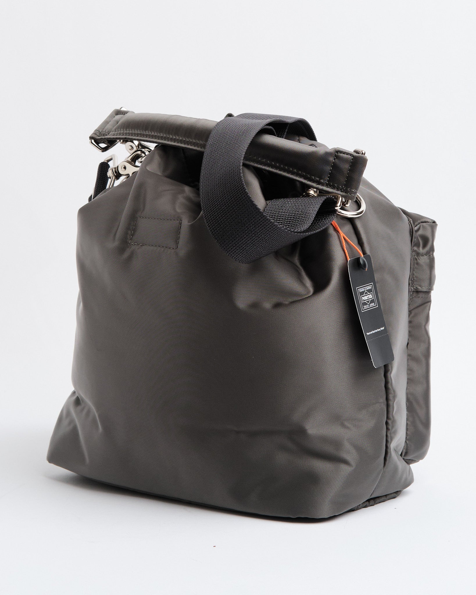 Introductie van de PORTER YOSHIDA 381 16853 11 BALLOON BAG (Groot) in ZILVERGRIJS. Deze unieke trekkoordtas is geïnspireerd op zakjes die gebruikt worden om kleine items te dragen en pronkt met een stijlvolle afgeronde vorm. Vervaardigd uit nylon twill stof met een katoen verbindingsproces straalt het een glans uit en heeft het een zachte textuur. De tas kan gesloten worden met het trekkoord aan de bovenkant, waardoor de silhouet verstelbaar is door de koordstopper op verschillende punten vast te zetten. Het komt met handvatten en een schouderriem die flexibiliteit biedt voor het dragen in de hand of over de schouder. Het veelzijdige ontwerp bevat twee soorten trekkoorden; een zwart en oranje koord, evenals een bijpassend effen kleur koord voor de tas. Binnenin vind je een voering die toevoegt aan zijn charme. Met afmetingen van B; 220mm, H; 290mm, D; 130mm (B; 8,7in, H; 11,4in, D; 5,1in) en een gewicht van 432g (15,2oz) kan deze ruime tas gemakkelijk een 500ml waterfles of tablet bevatten.