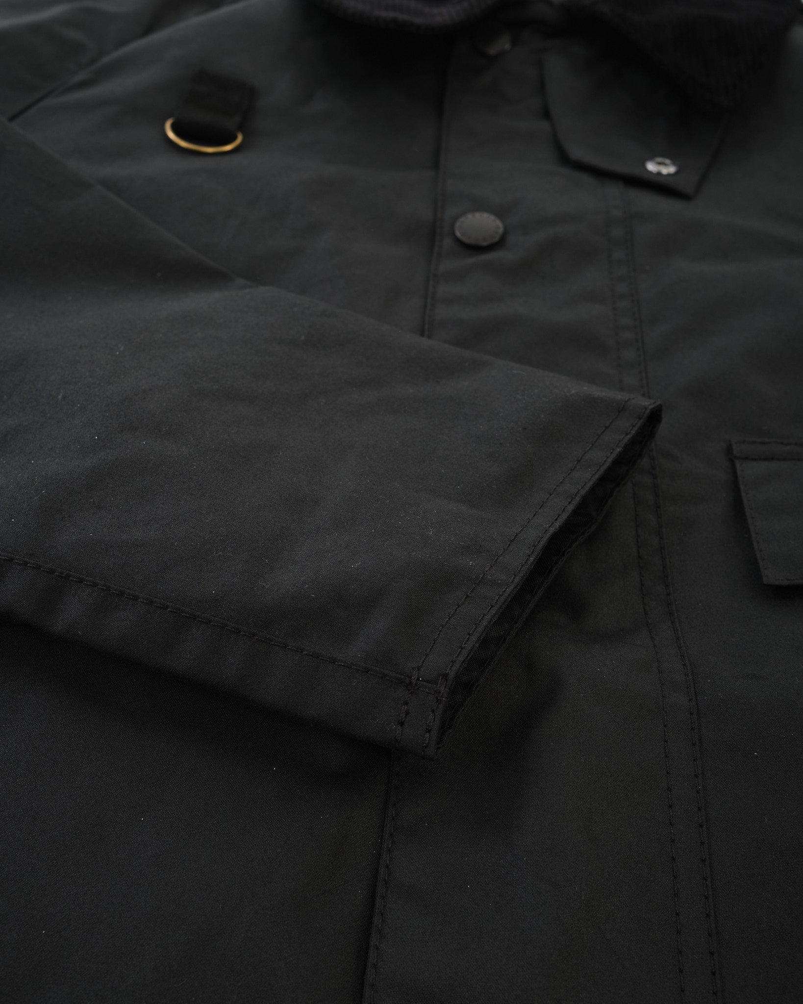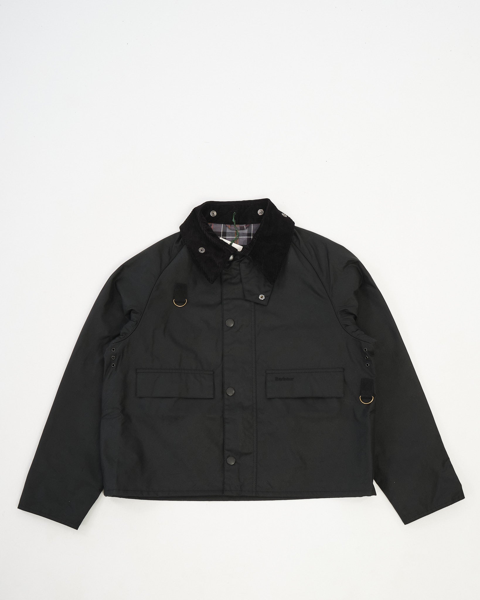 The Barbour Spey Wax Jacket in Black is a true icon of British outerwear, originally designed for fly-fishing in the Scottish Highlands. Its signature cropped fit, raglan sleeves, and boxy silhouette offer freedom of movement and timeless functionality. Made from 6oz Sylkoil waxed cotton, it provides dependable weather resistance with a slightly worn-in matte finish. Details like the corduroy collar with throat strap, storm flap over the brass zip, and two press-stud bellows pockets stay true to its heritage, while Barbour’s classic tartan lining adds a refined touch. Durable, practical, and unmistakably Barbour — a jacket built to last through seasons of use.