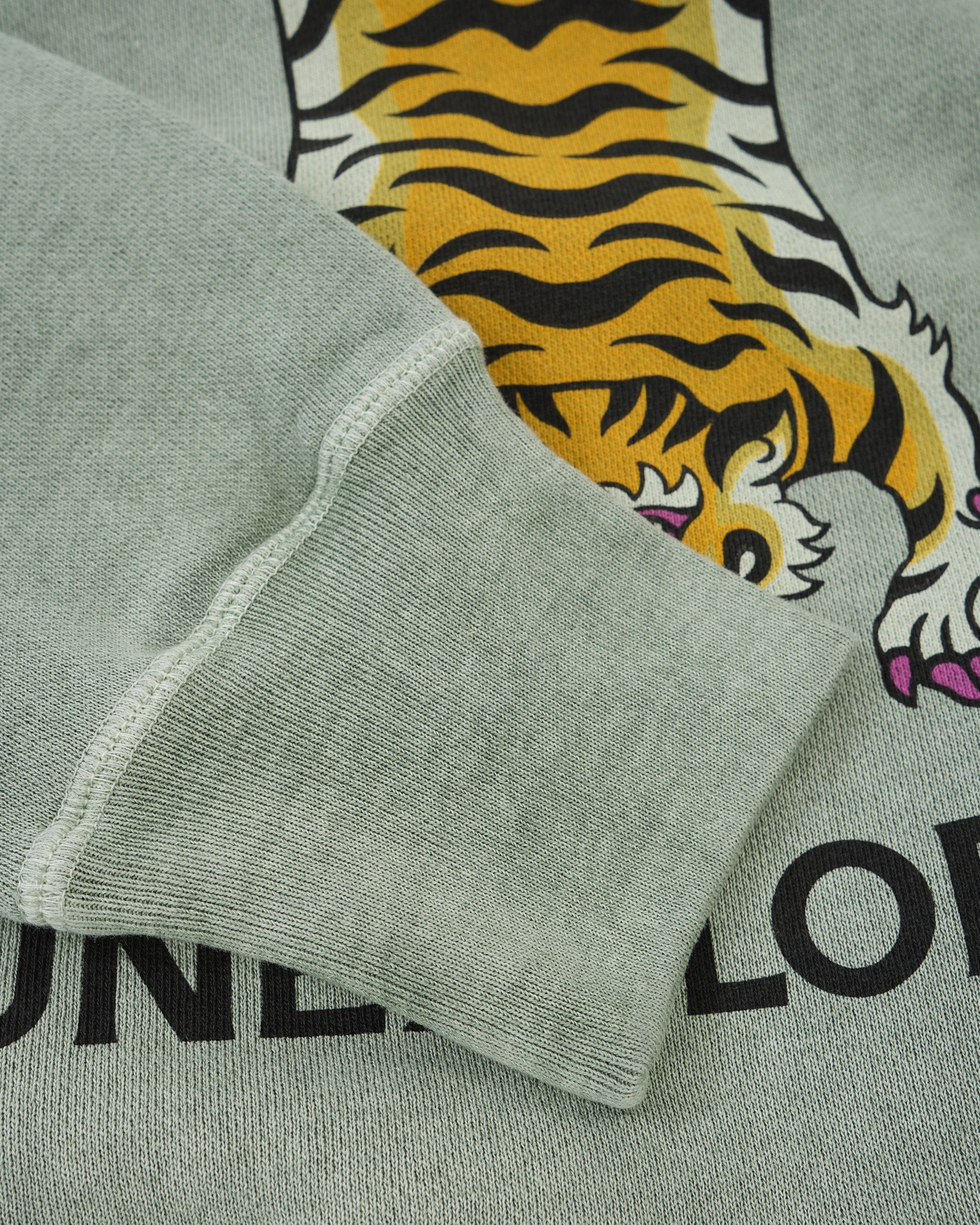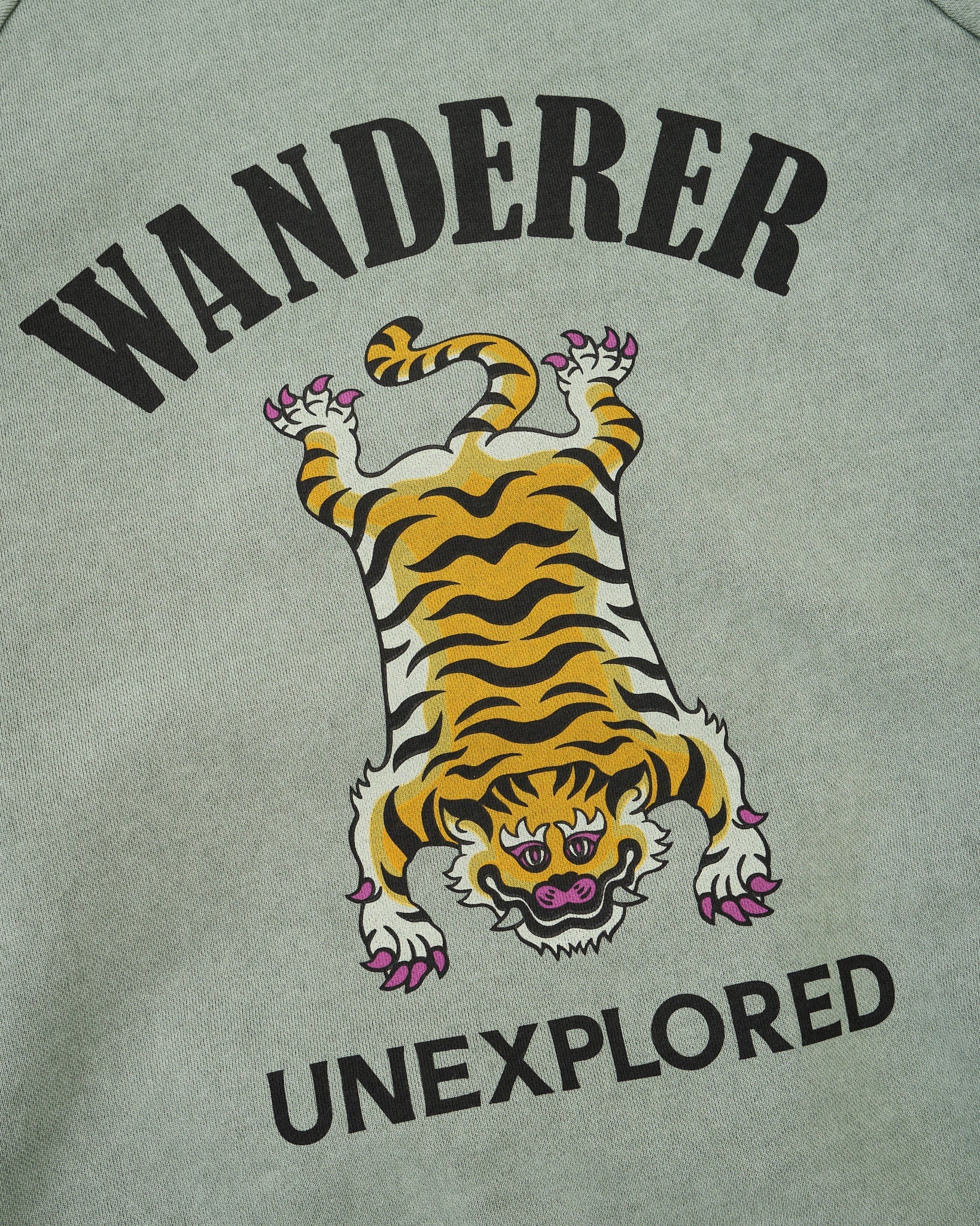Met raglanmouwen, geribbelde manchetten en zoom, en een pasvorm verfijnd voor laagjes, is het functioneel en expressief. Het opvallende detail? Een gedurfde Tibetaanse tijgerprint, geïnspireerd door traditionele tapijten - vereerd als symbolen van bescherming en macht in de Tibetaanse cultuur en zeer gewild op de vintage markt.