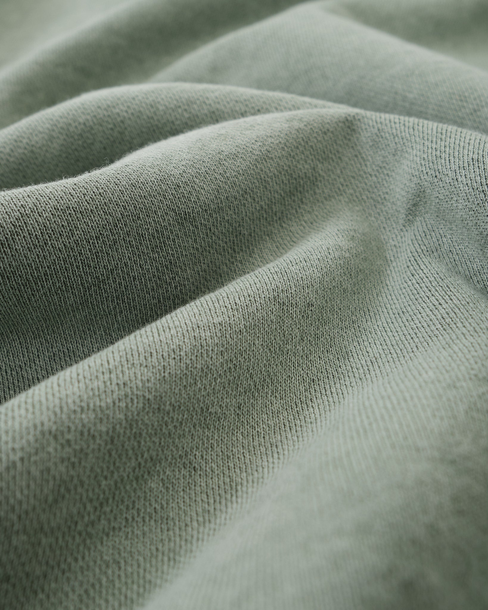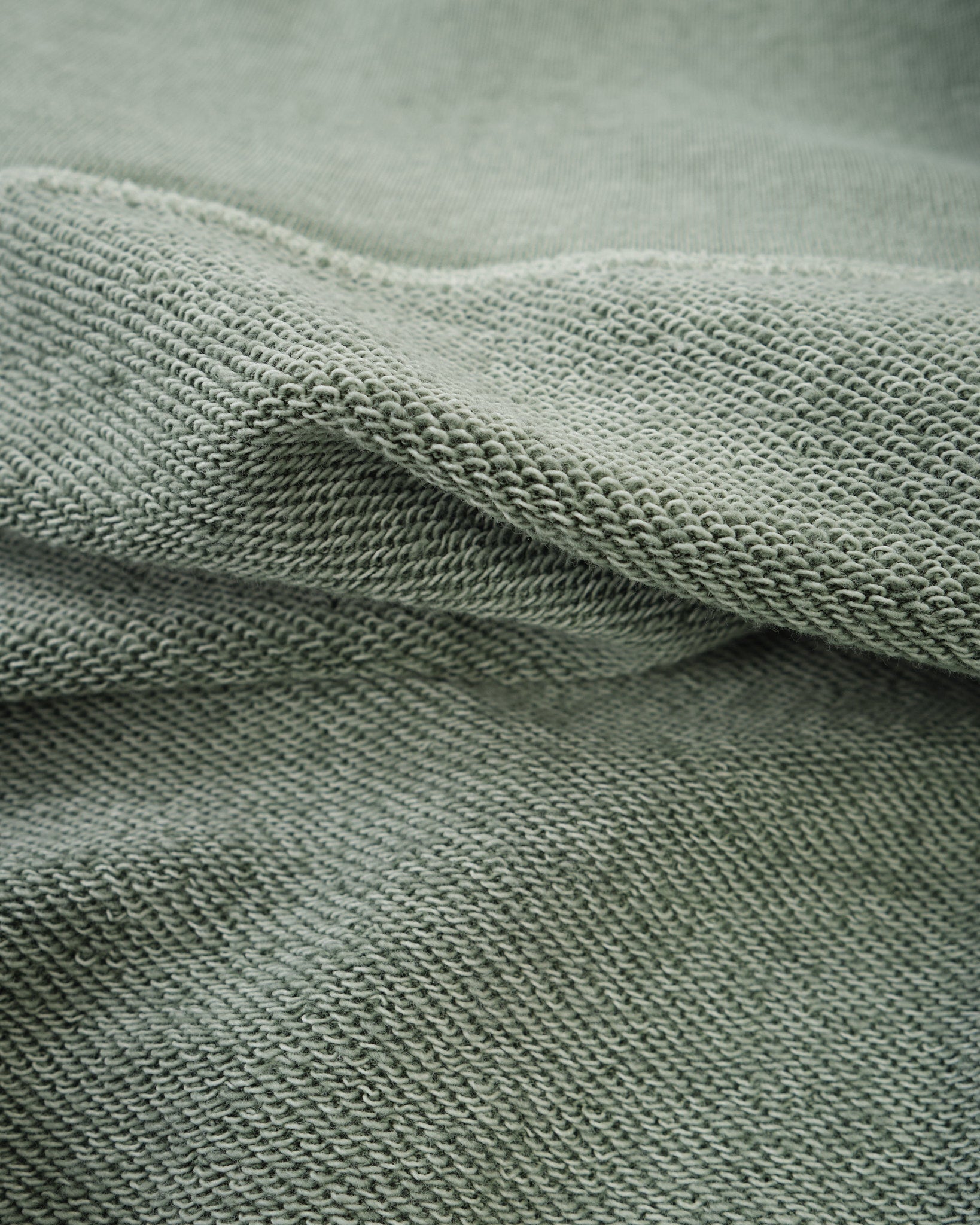 De stof combineert loopback breiwerk met slubgaren om subtiele visuele textuur en een vintage gevoel te geven. Een pigmentverf afwerking verbetert verder die ingedragen uitstraling terwijl het elk stuk een unieke toon geeft.