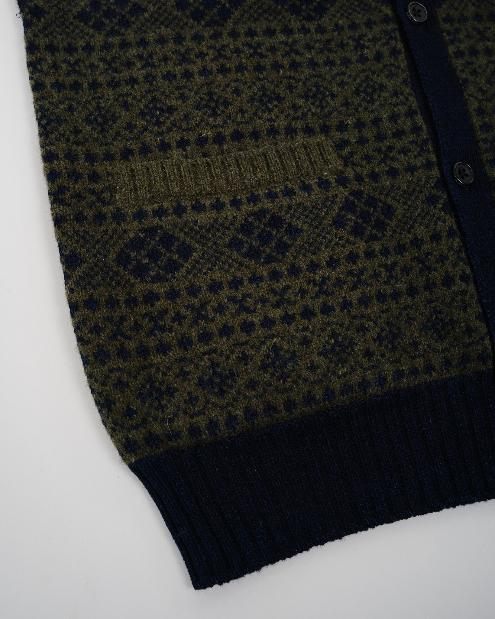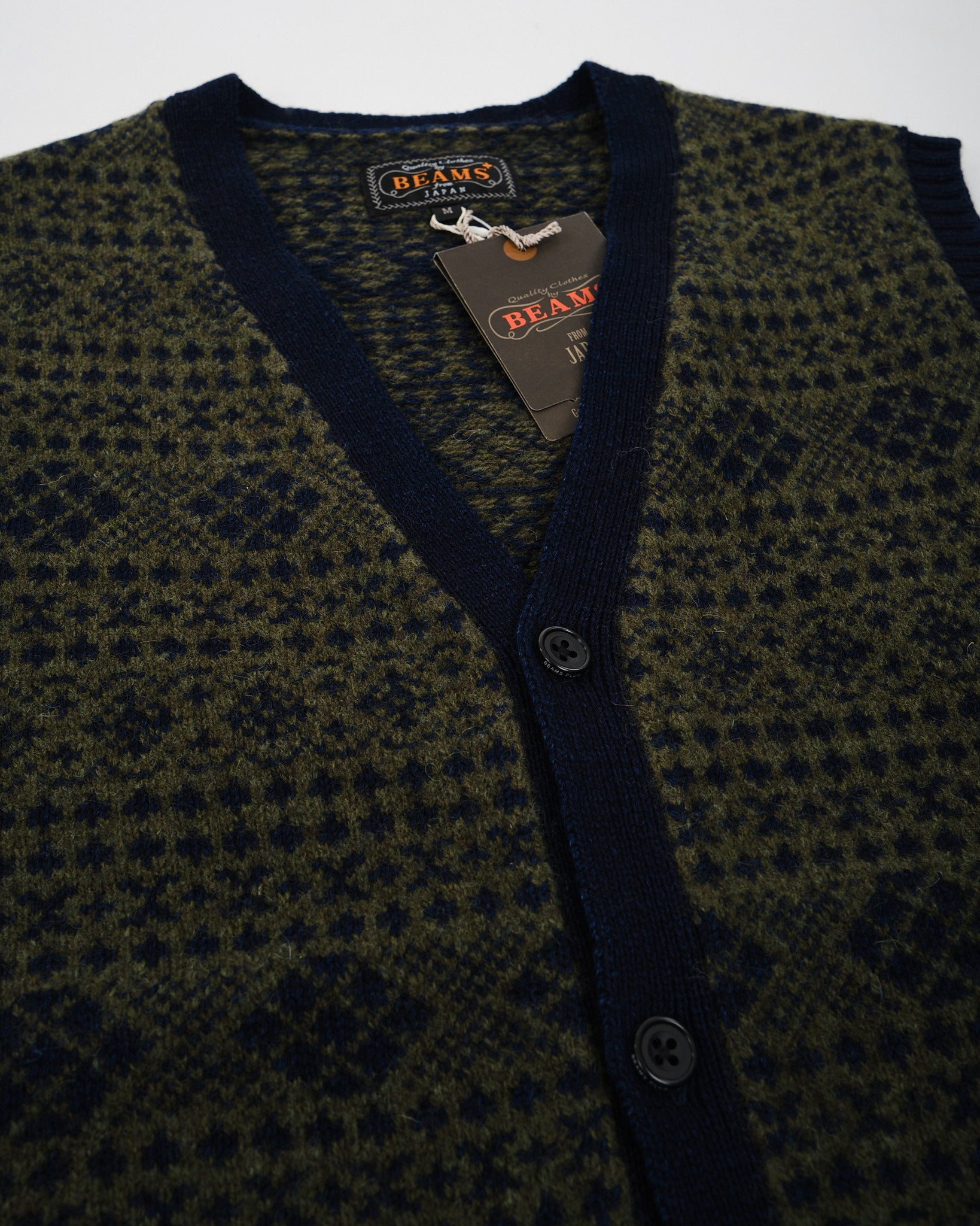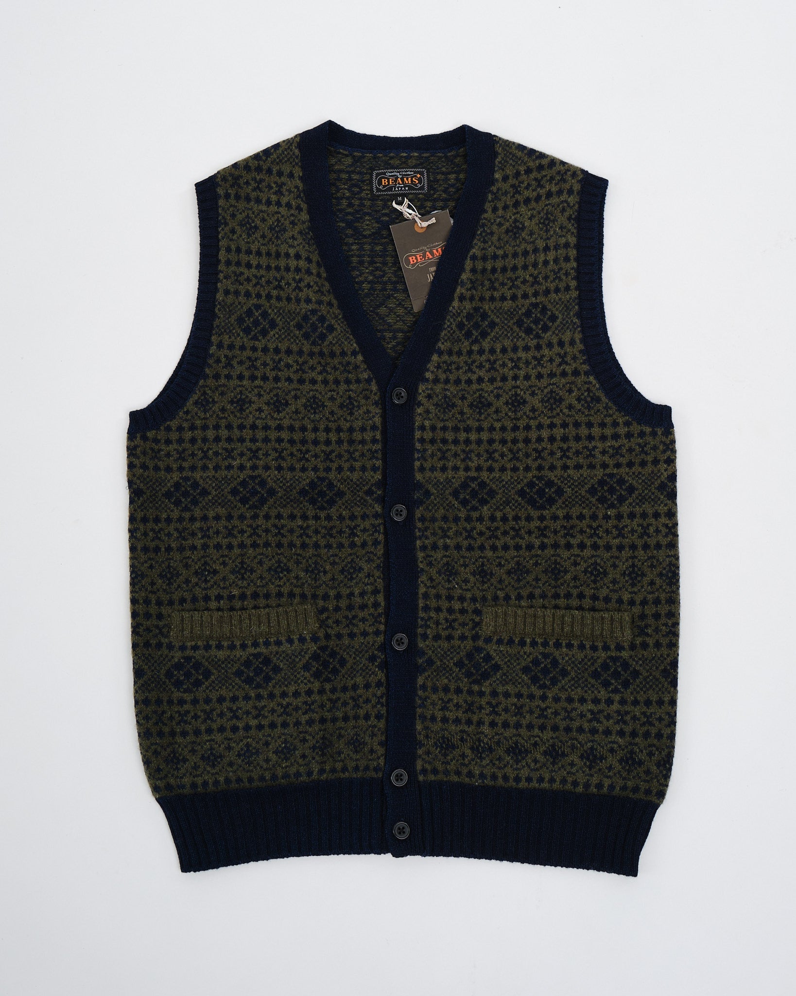 Verken de BEAMS+ Button Knit Vest, in Indigo Fair Isle Green bij Meadow. Een vlekkeloze mix van gezelligheid en tijdloze stijl. Deze vest verwerkt prachtig het Fair Isle patroon in een rustgevend groen kleurenschema dat een eeuwige charme uitstraalt. Zorgvuldig vervaardigd in Japan met 55% wol, 44% katoen en 1% acryl toont dit kledingstuk deskundige breitechnieken. Met zijn ontwerp en praktische V-hals kraag, aangevuld met handige dubbele zijzakken, dient het als een ideaal laagjesstuk.