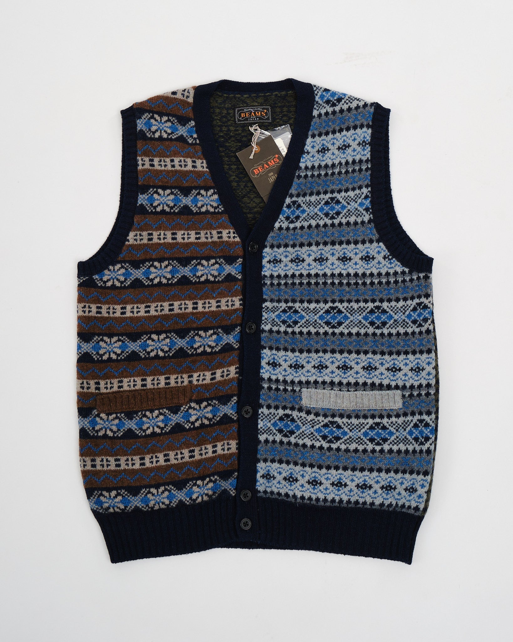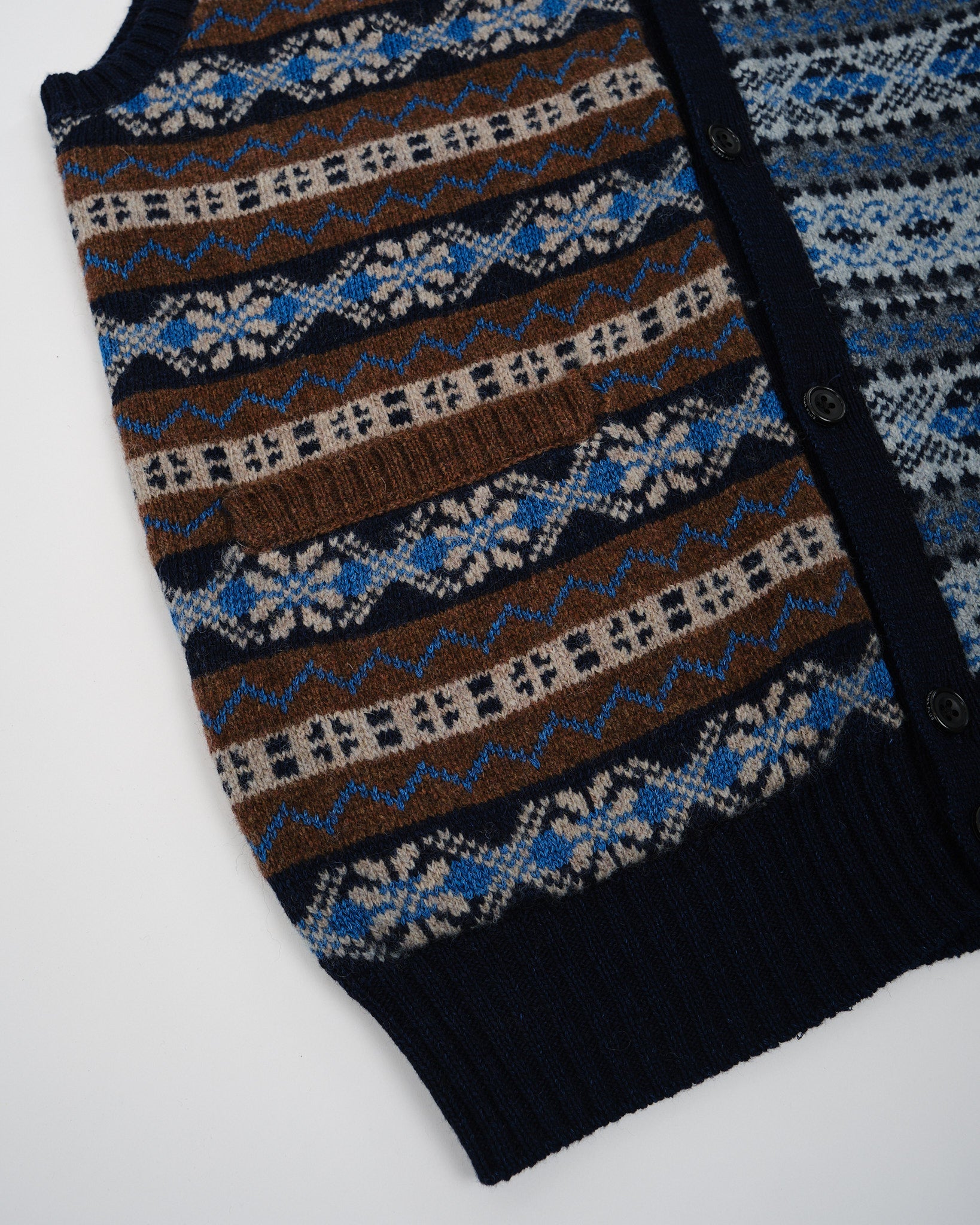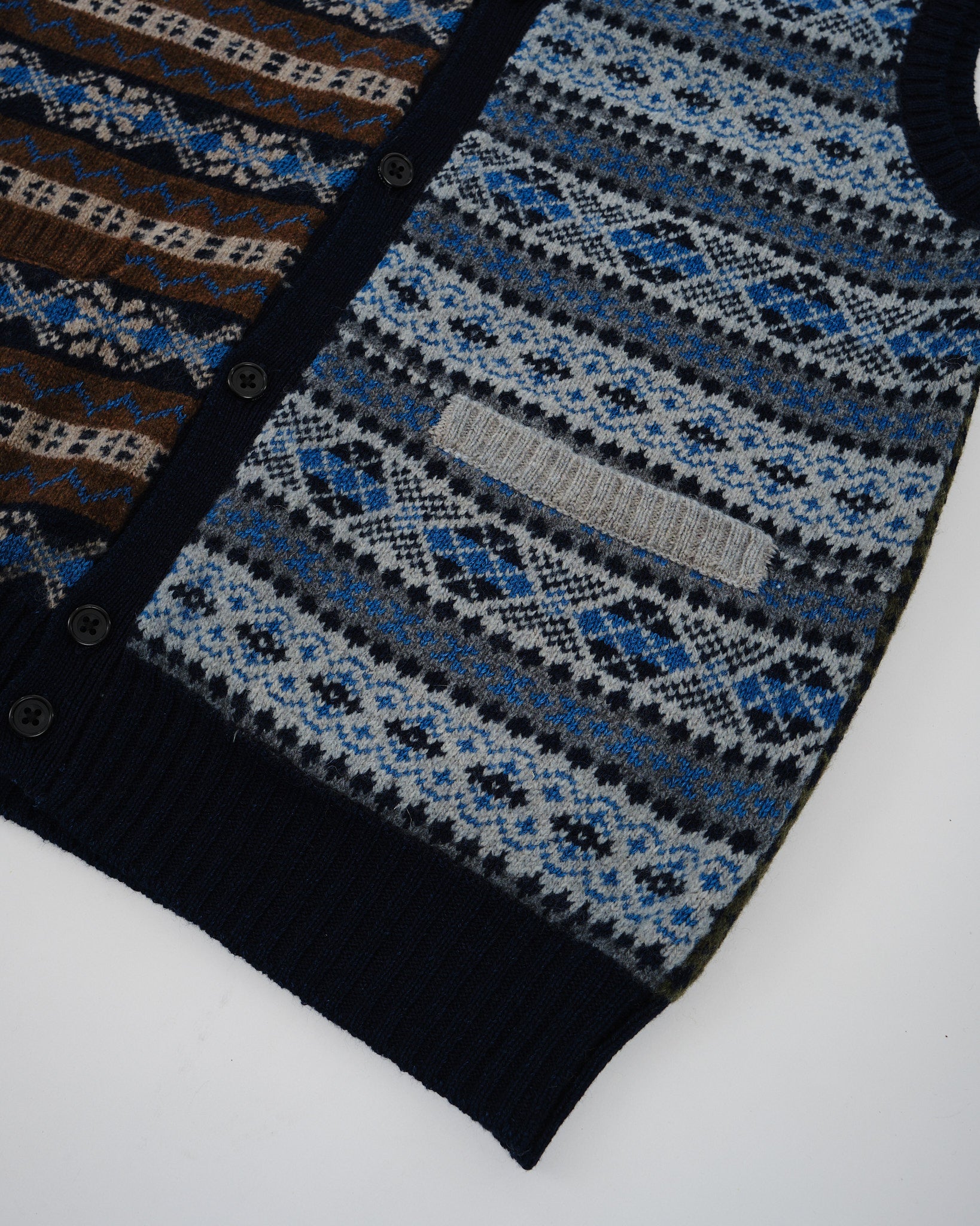 Verken de BEAMS+ Button Knit Vest, in Indigo Fair Isle Panel bij Meadow. Een vlekkeloze mix van gezelligheid en tijdloze stijl. Deze vest verwerkt prachtig het Fair Isle patroon in een rustgevend groen kleurenschema dat een eeuwige charme uitstraalt. Zorgvuldig vervaardigd in Japan met 55% wol, 44% katoen en 1% acryl toont dit kledingstuk deskundige breitechnieken. Met zijn ontwerp en praktische V-hals kraag, aangevuld met handige dubbele zijzakken, dient het als een ideaal laagjesstuk.