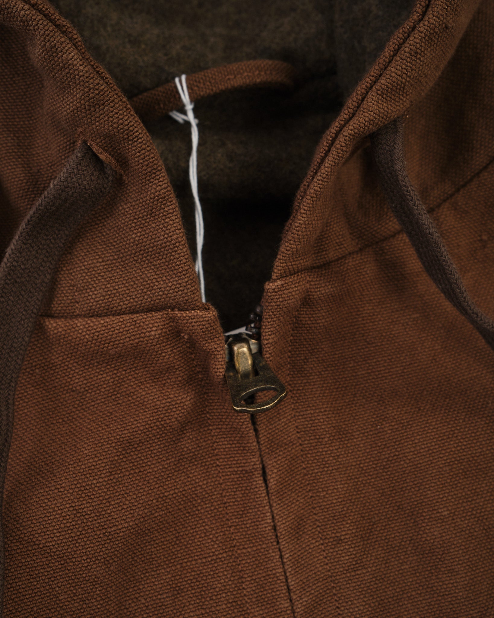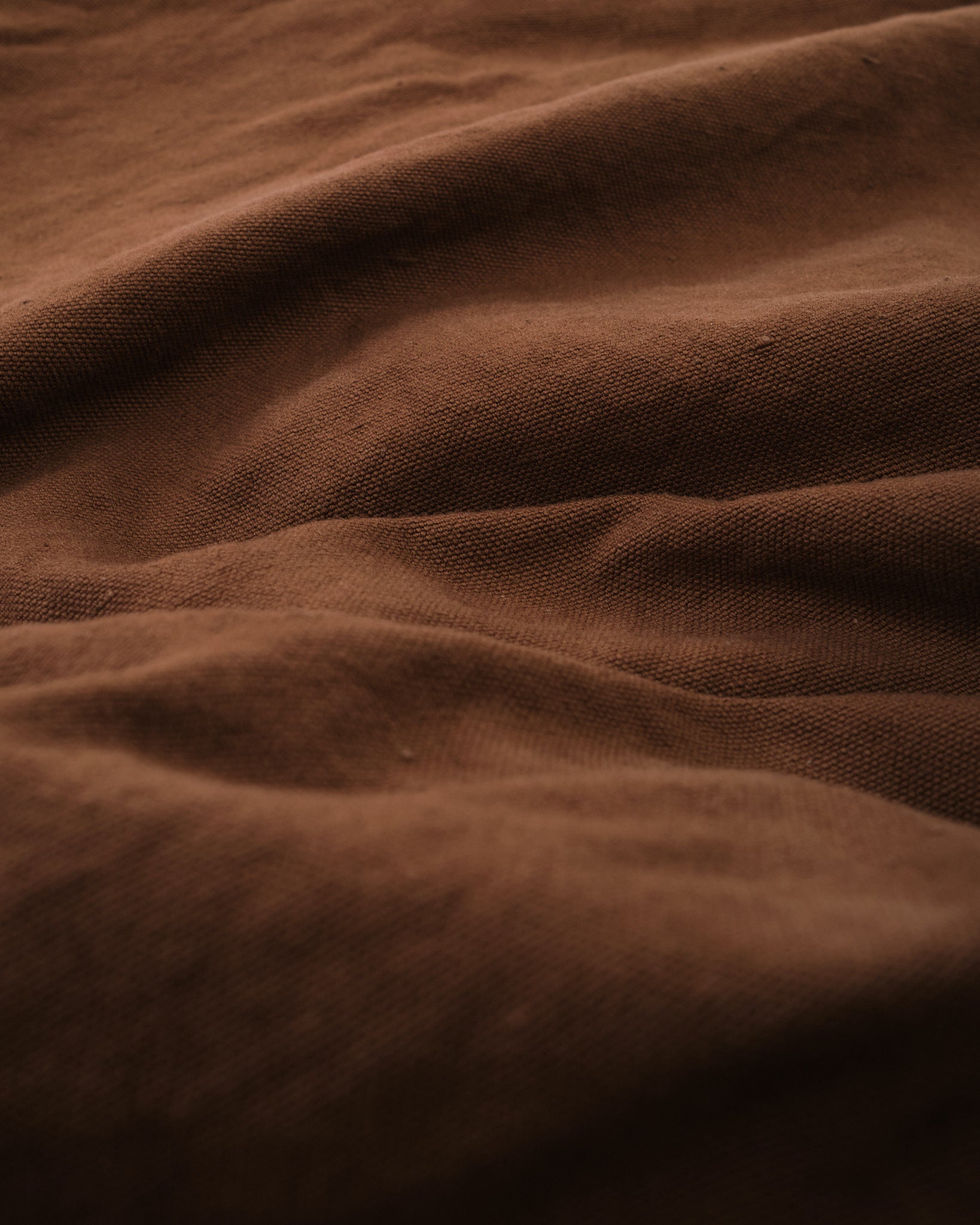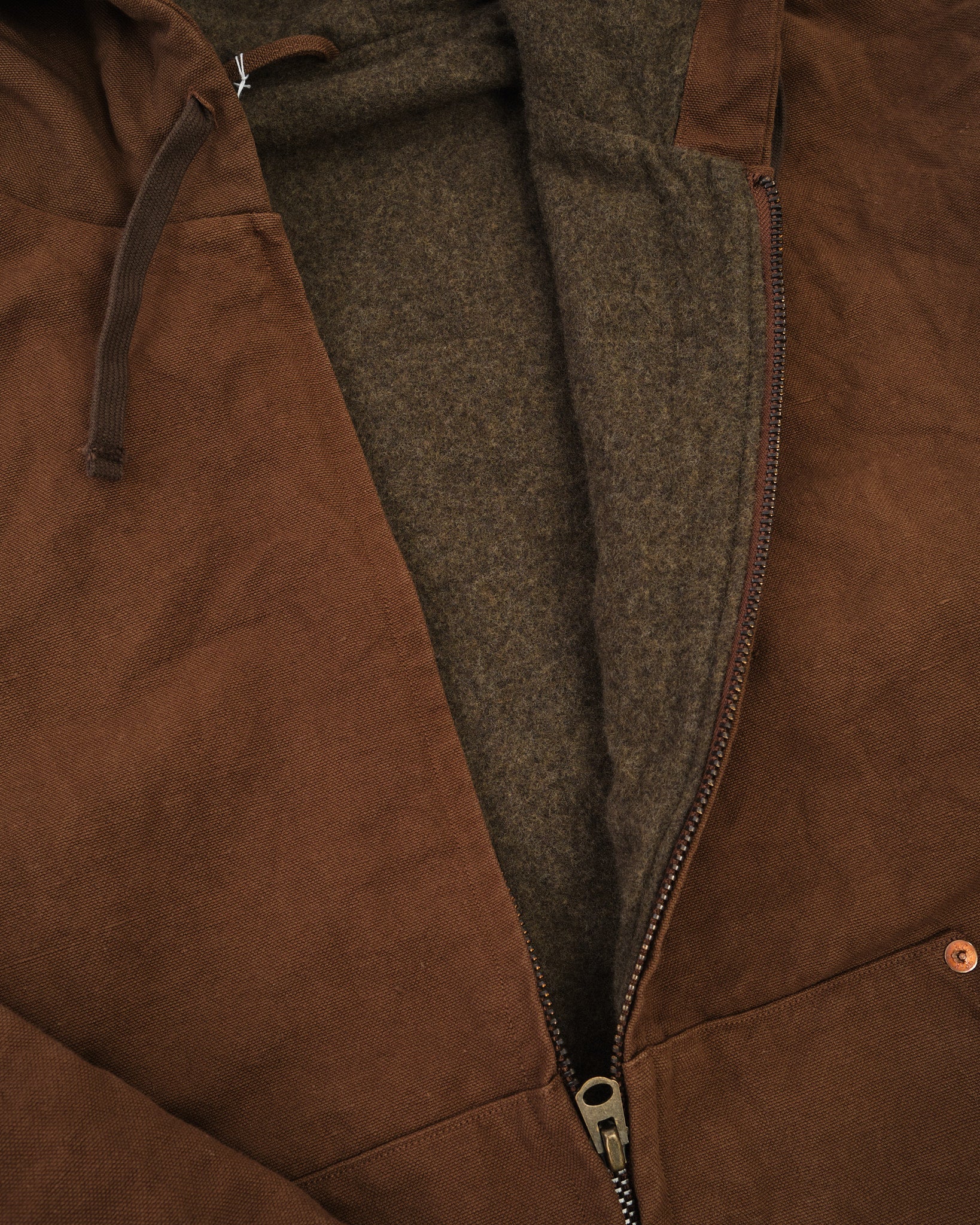 De KAPTAIN SUNSHINE Cotton Hemp Hoody Jacket (KS25FJK15) in Kakishibu combineert duurzaamheid met een vintage esthetiek. Gemaakt van een zware Oxford stof, deze jas is geweven met dikke katoenen inslag en hennep schering in een hoogdichte weving. Het is meerdere keren gewassen zonder spanning, wat zorgt voor een zachte, volumineuze textuur die het een luxe gevoel en comfort geeft. Het speciale verfproces van de jas geeft het een rijke, vintage-achtige afwerking, waardoor het mooi veroudert over tijd.