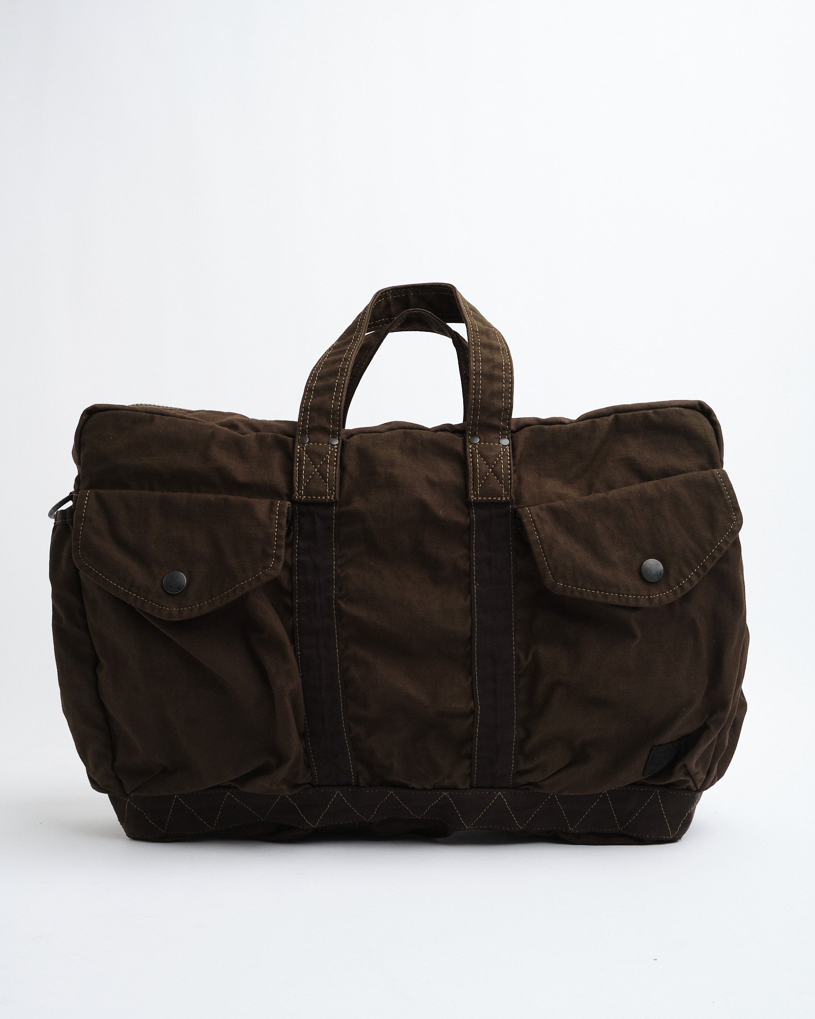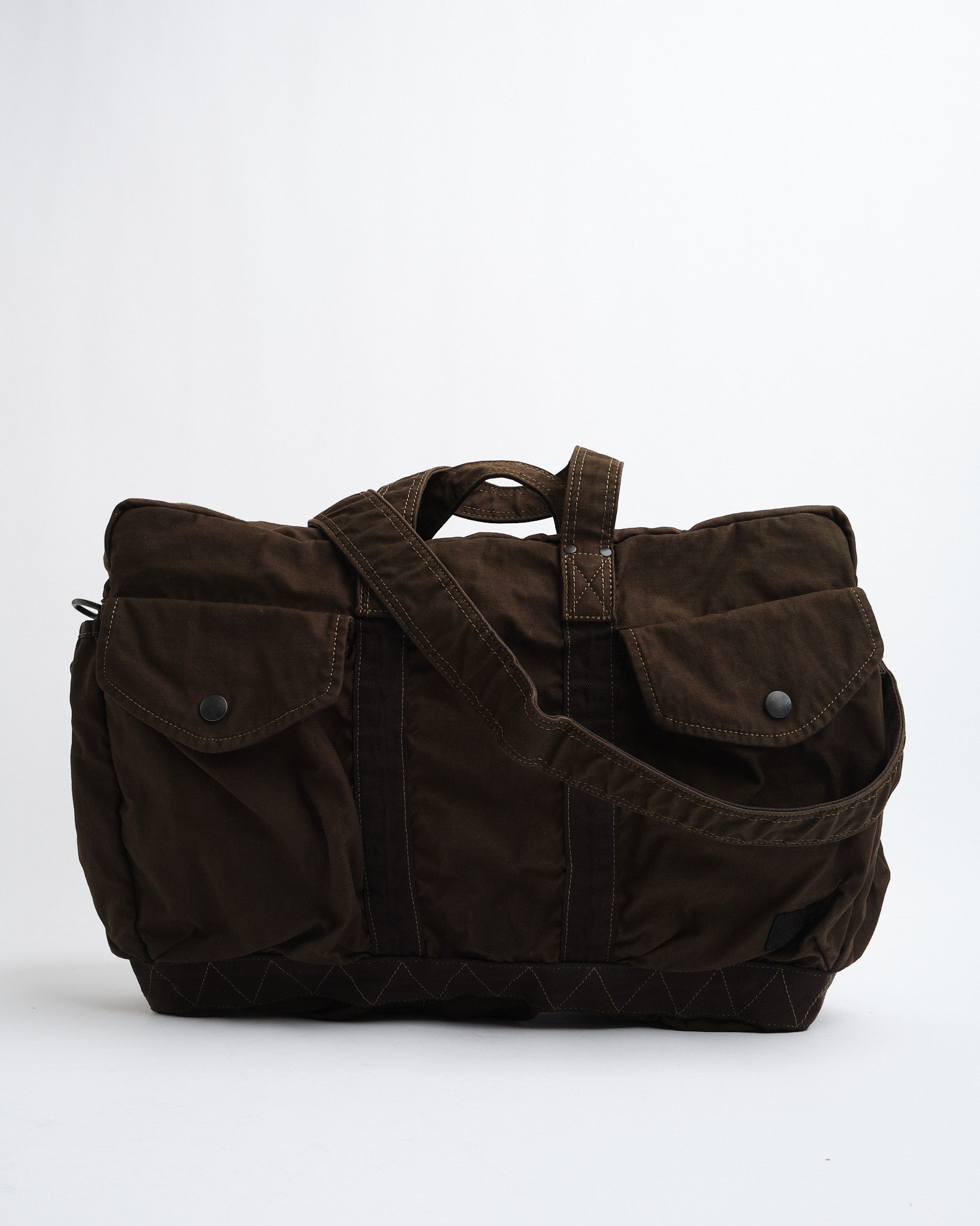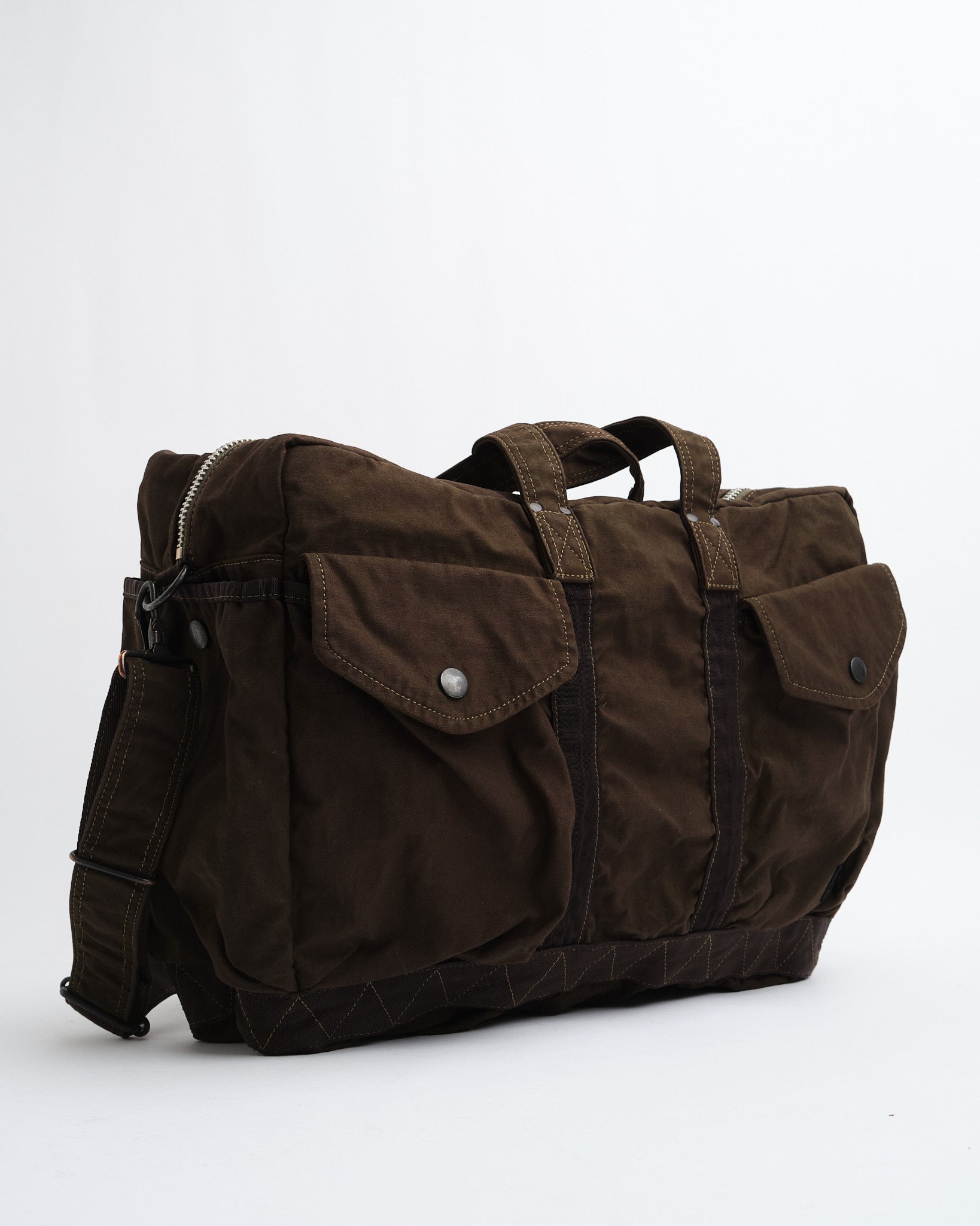 De PORTER-YOSHIDA & CO. CRAG 2WAY BOSTON BAG (S) in Khaki is een veelzijdige en duurzame metgezel voor dagelijks gebruik en reizen. Vervaardigd in Japan, het beschikt over een hoogwaardige nylon en katoenmix, kledingstuk-geverfd voor een unieke kleur en textuur. De tas biedt een ruim hoofdcompartiment, meerdere zakken voor georganiseerde opslag, en de flexibiliteit om het met de hand te dragen of met een afneembare schouderriem. Het militair-geïnspireerde ontwerp combineert functionaliteit met tijdloze aantrekkingskracht, wat de superieure Japanse vakmanschap weerspiegelt.