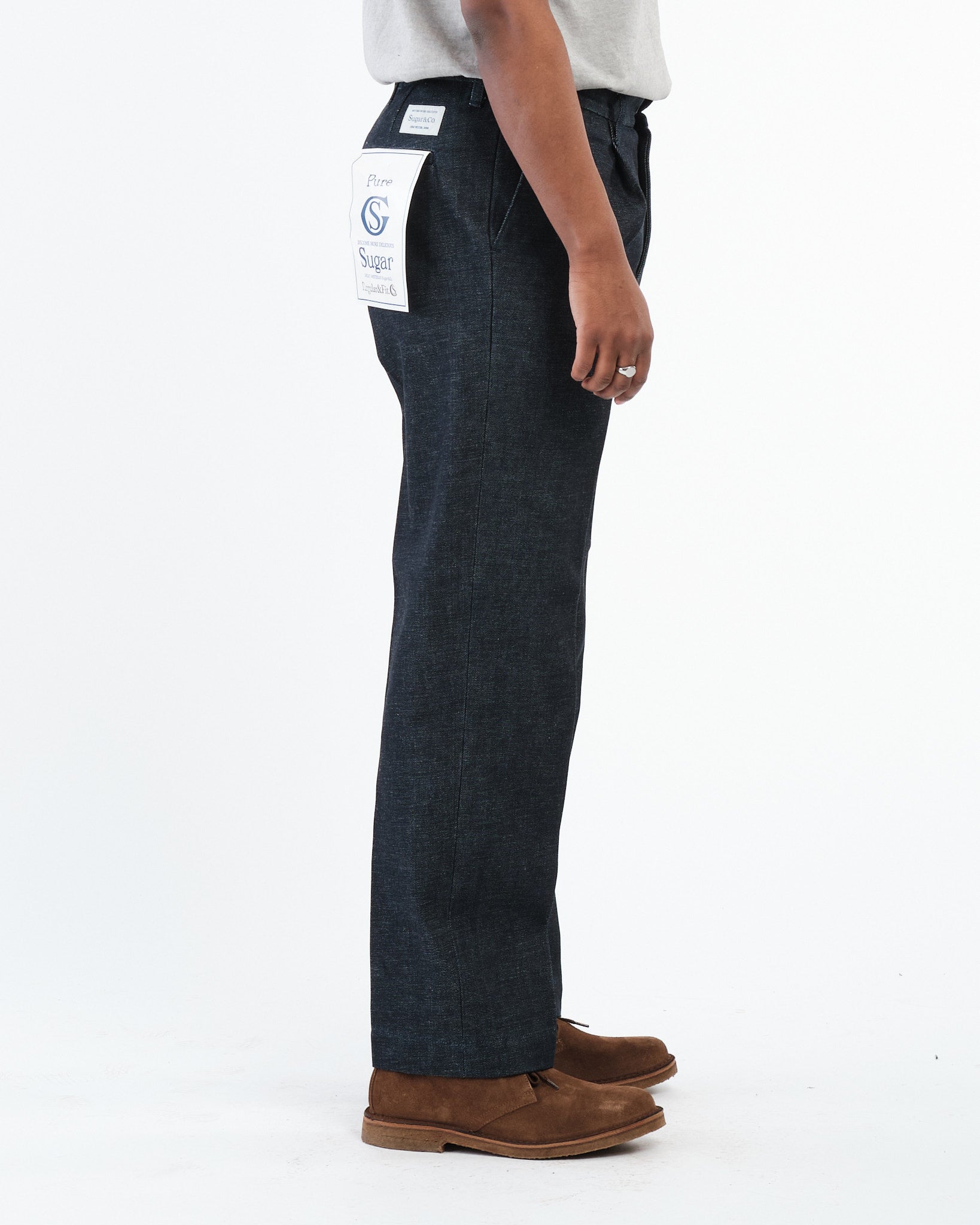 Introductie van de SUGAR & CO. DADDY'S PANTS in een rijke Indigo tint. Deze broeken zijn een vlaggenschipmodel van Sugar & Co., dat de toewijding van het merk aan kwaliteit en tijdloos ontwerp laat zien. Vervaardigd in Japan van 100% Amerikaans katoen, biedt de stof een robuuste maar droge textuur die comfortabeler wordt met dragen. De diepe indigo kleur, bereikt door het gebruik van garens met aanzienlijke variatie, zorgt voor unieke verkleuring en verouderingskenmerken, waardoor de broek over tijd een gepersonaliseerde patina kan ontwikkelen.