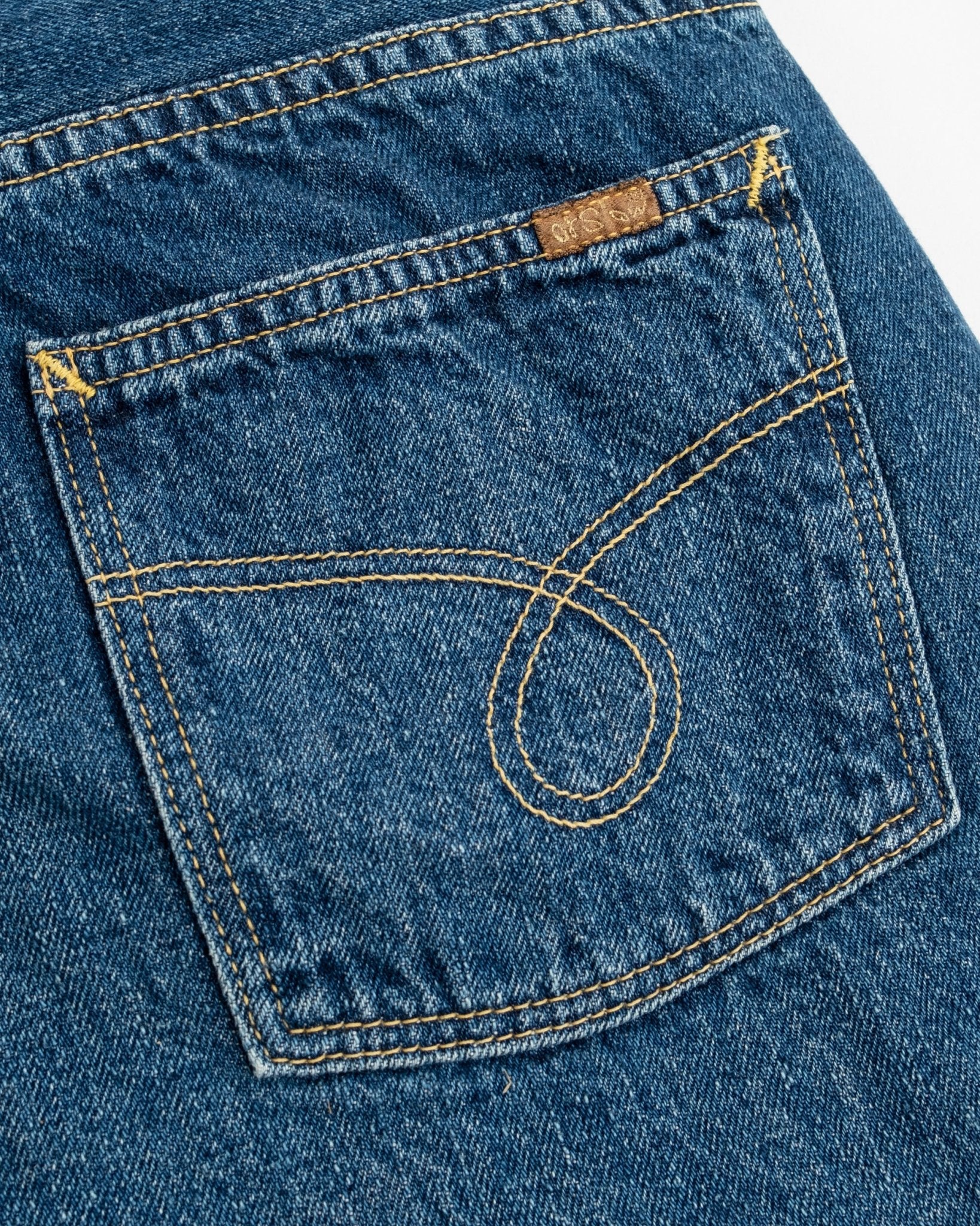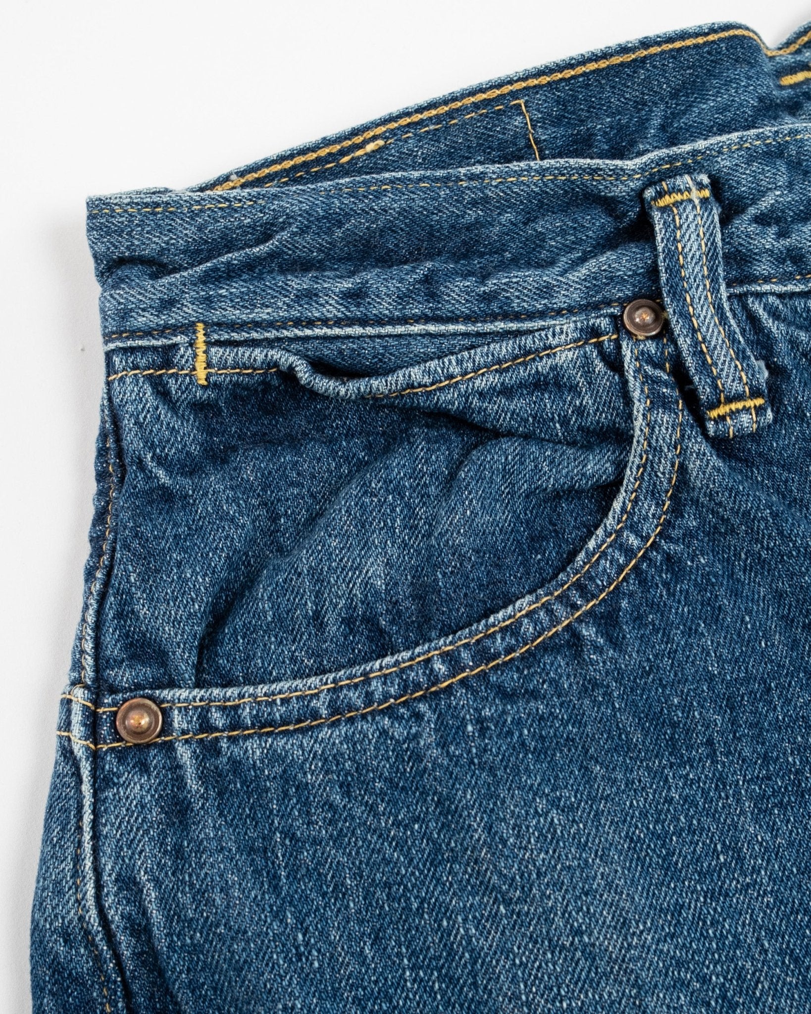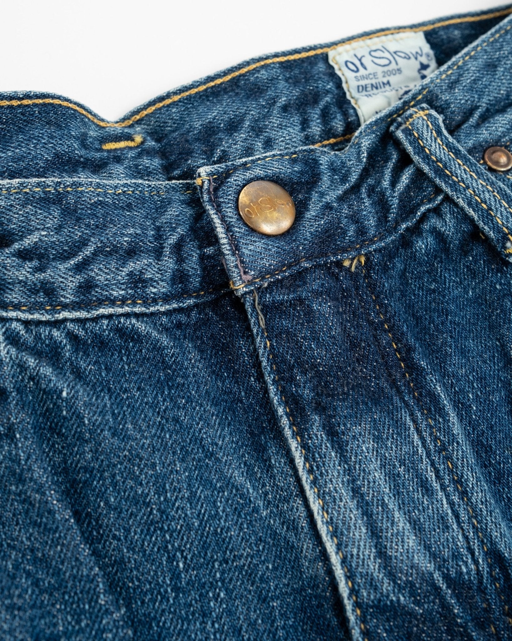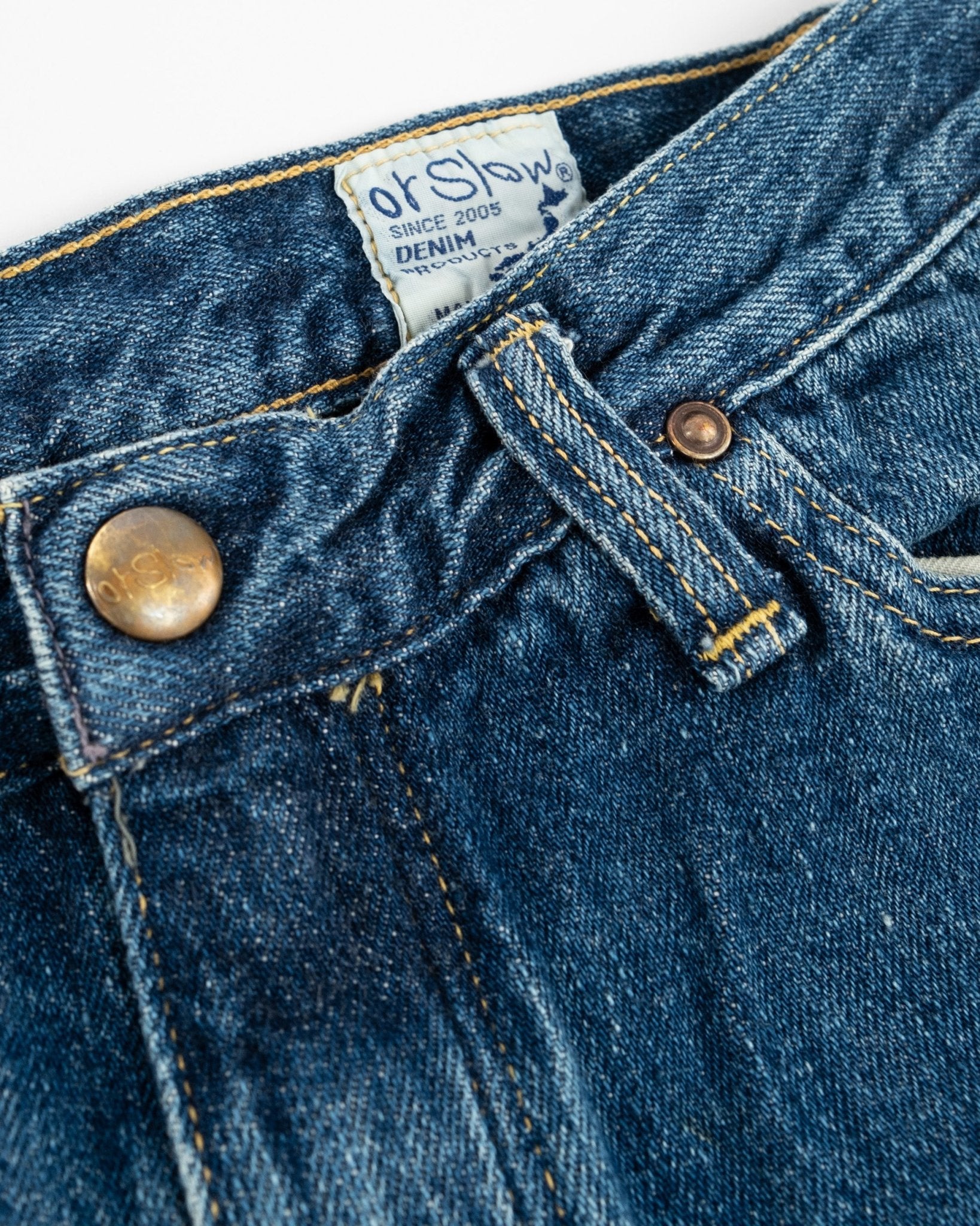 Geïnspireerd door de jaren '50, met een hoge taille, langere lengte, bredere dijen en rechte pijpen. Denim uit die tijd was ontworpen om de curve van het lichaam te volgen en comfortabel genoeg om elke dag te dragen. Deze vorm van de denim is perfect voor degenen die vaak vinden dat denim 'te groot' is in de taille, of te strak rond de dijen, aangezien ze ontworpen zijn met een lichte curve, vandaar 'curved seam'. Gemaakt van een 13,5 oz denim op maat gemaakt voor orSlow, en eenmaal gewassen, zal het gevoel van de denim vanaf de eerste keer dragen zacht zijn, en dit wasproces brengt een mooie blauwe kleur in de denim naar voren. De denim is gewassen dus de benen zullen enigszins gedraaid lijken, typisch voor vintage denim, en dit betekent ook dat de denim niet zal krimpen. Knoopsluiting. 100% katoen. Gemaakt in Japan.