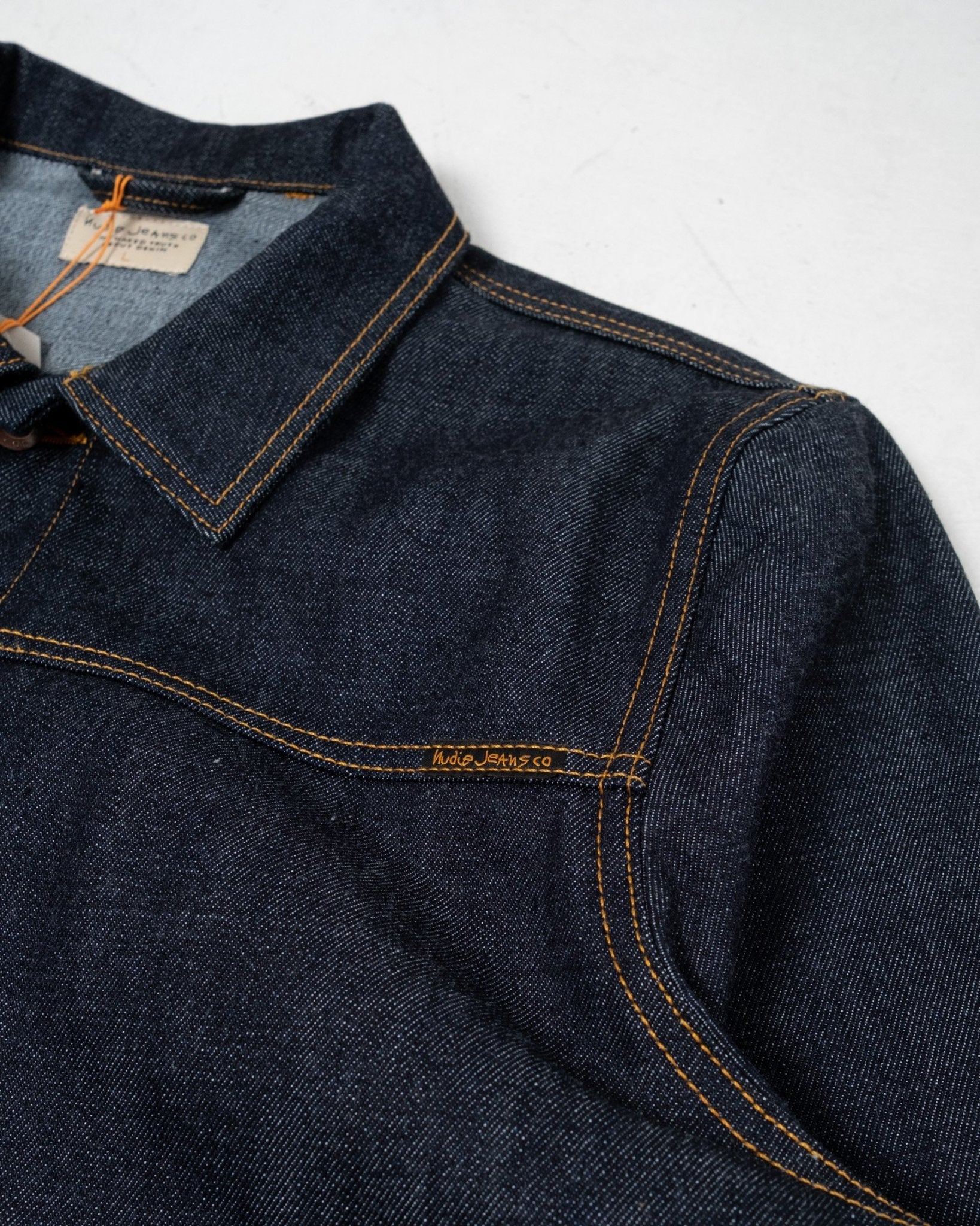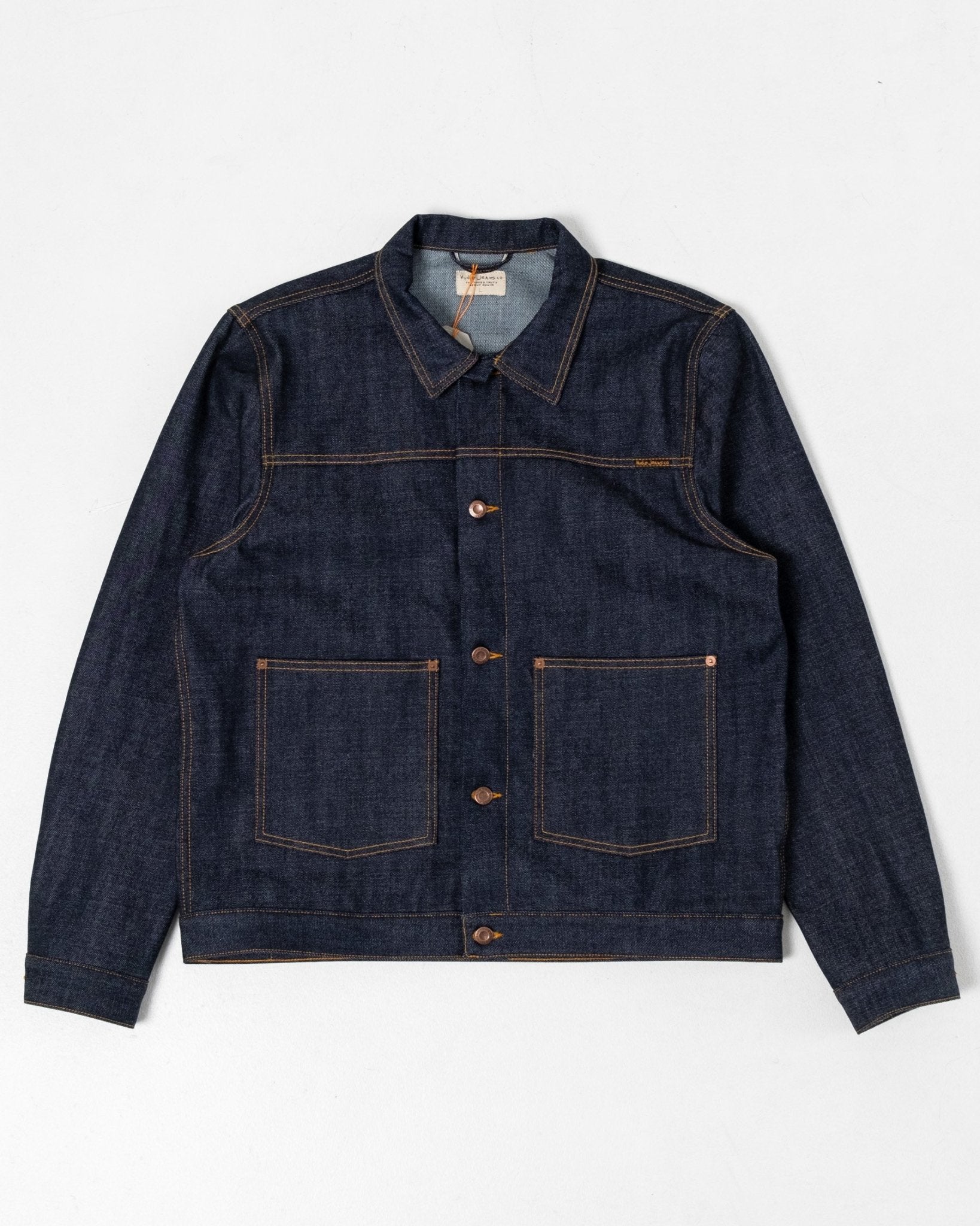 Dante Blue van Nudie Jeans Co is een klassieke werkjas gemaakt van ruw rood selvage denim met twee onderste voorzakken en prachtige Nudie op maat gemaakte knopen. Normale pasvorm en biologisch katoen. Gemaakt in Italië.
