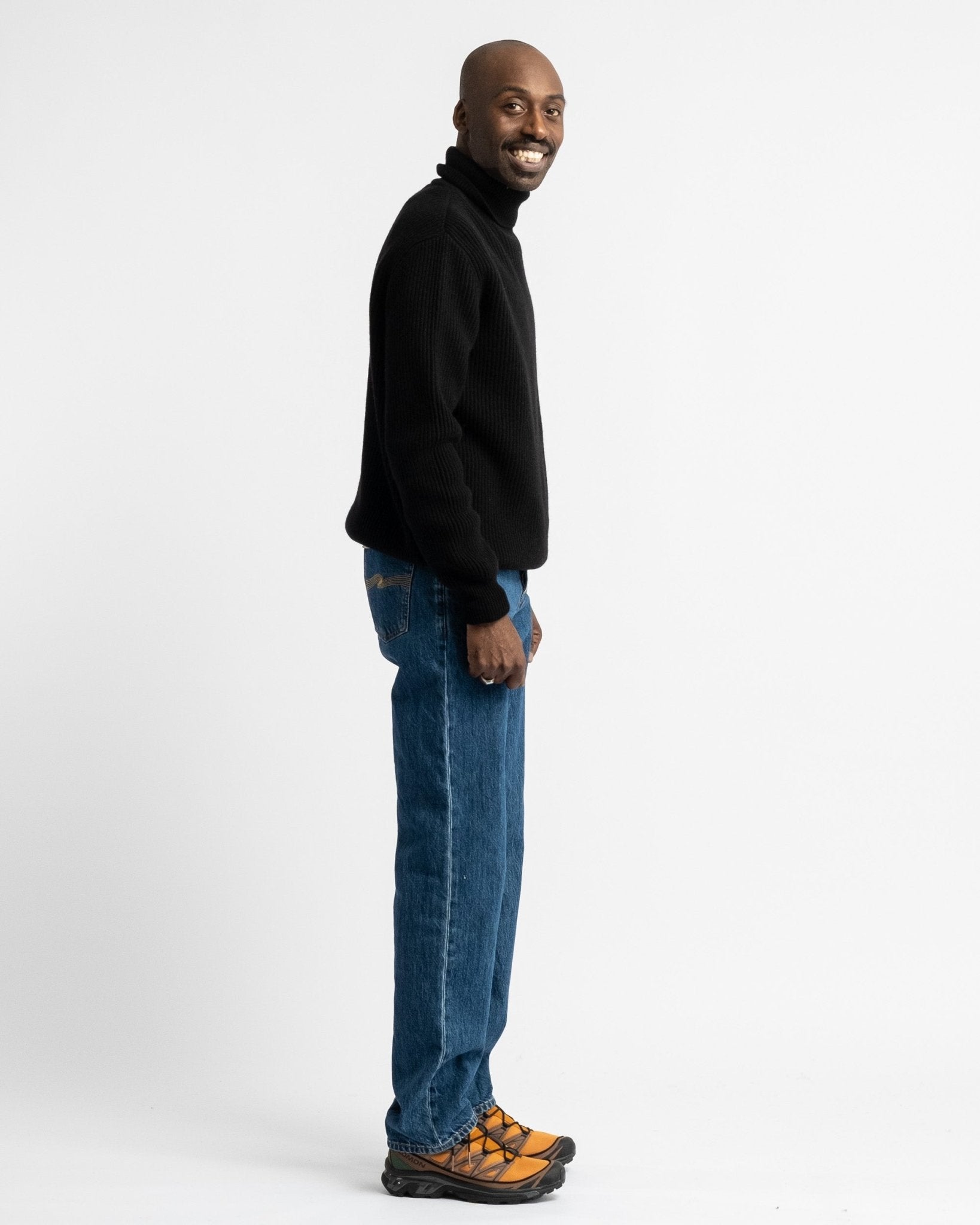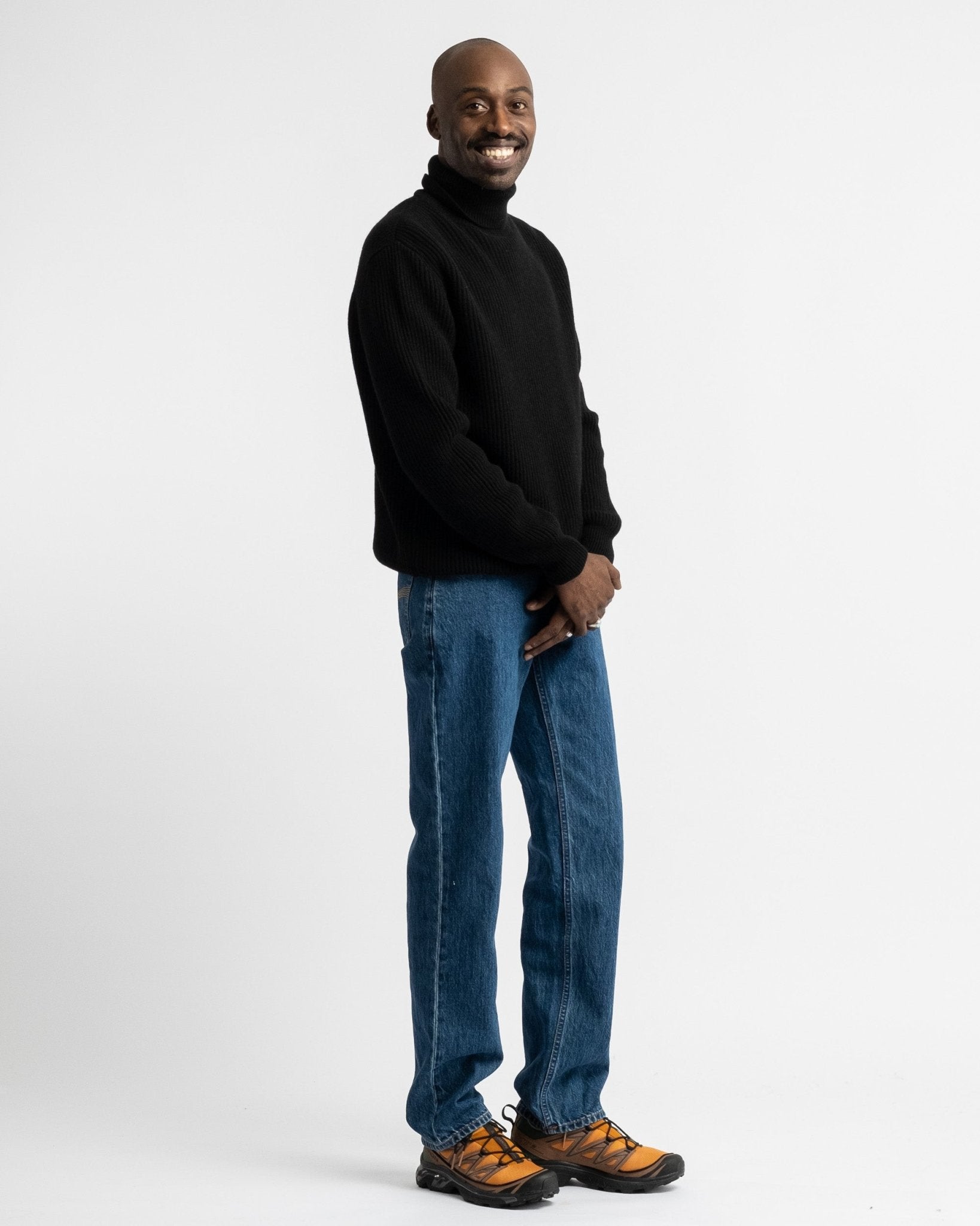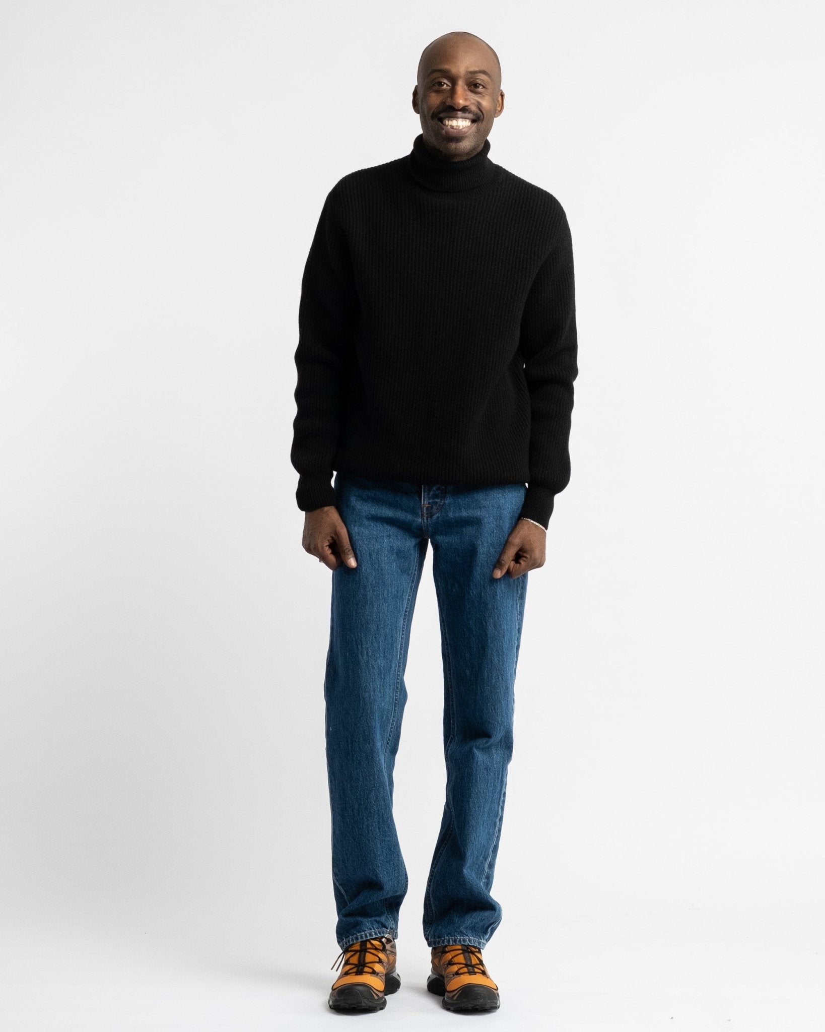 Ludjero is 179 cm lang, slank gebouwd en draagt maat 4.
