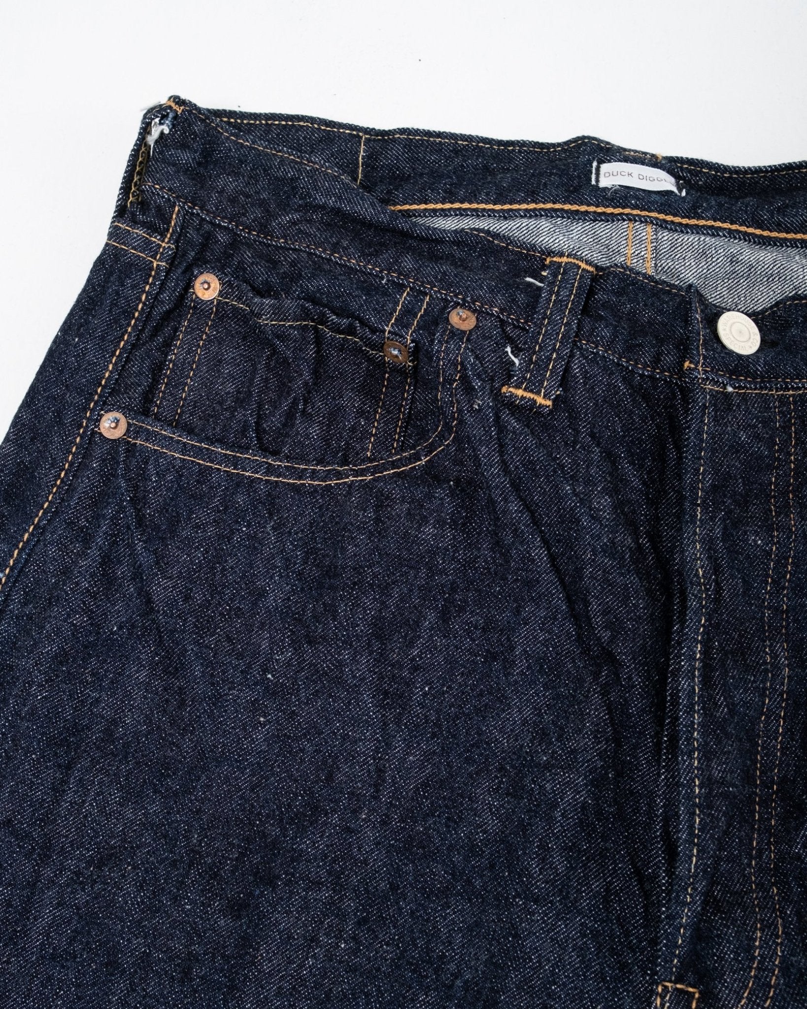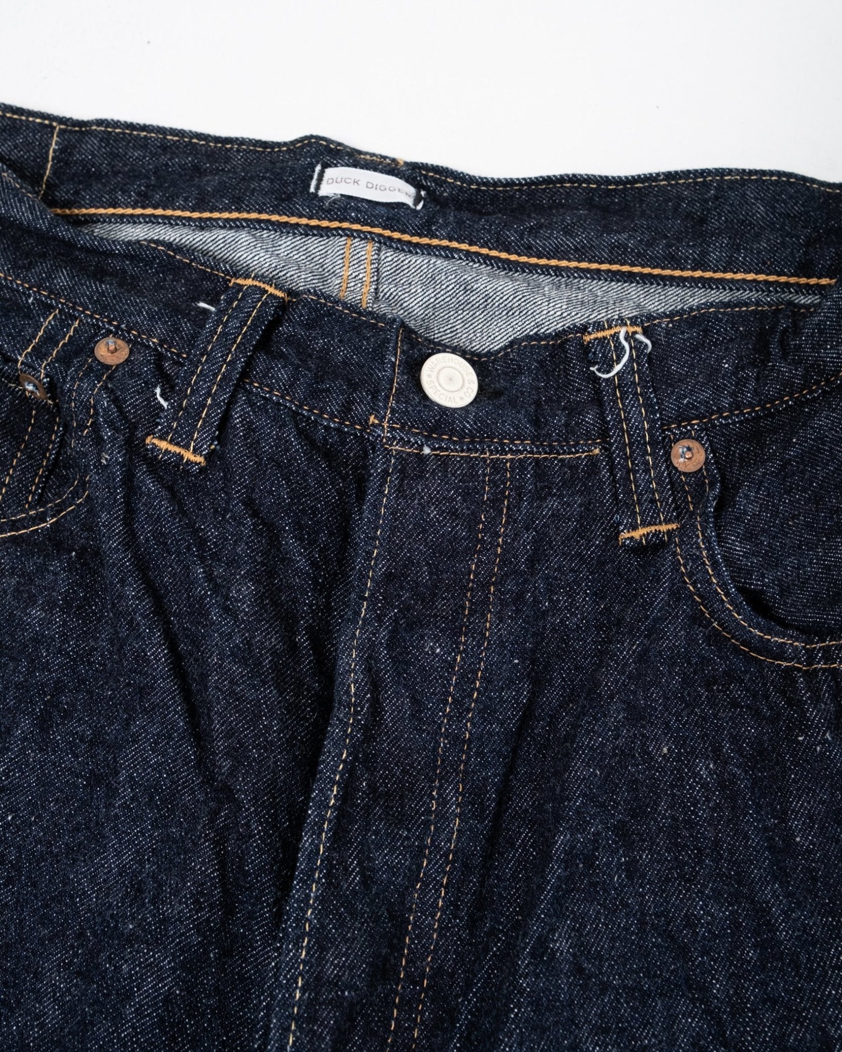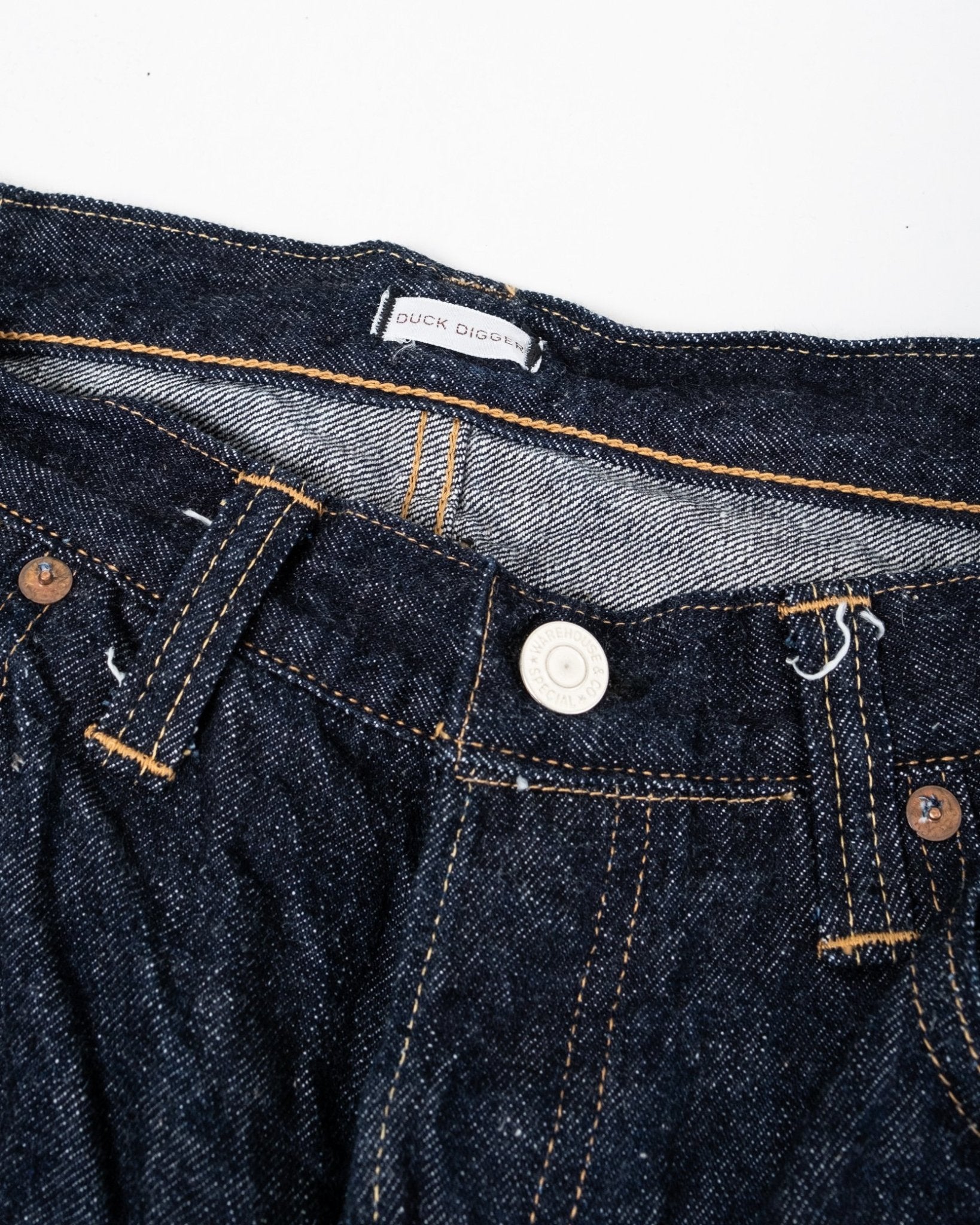 Duck Digger 1001XX One Wash van Warehouse & Co. Deze jeans heeft een 1947 snit, met een diepe taille en een zachte toelopende vorm. Warehouse naait deze in hun 13,5 oz Banner Denim. Dit rechte model is gebaseerd op een model uit de jaren '40 in een katoenmix uit Arizona, Tennessee en Texas, en recreëert de natuurlijke ongelijke garenkenmerk van die tijd. Ongekrompen denim dat één keer is gewassen voor een mooie vintage look, plus dat het je al het gedoe van krimp bespaart. Gemaakt in Japan.