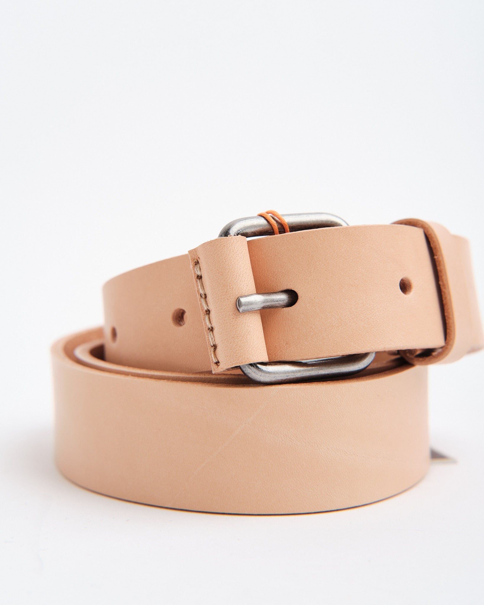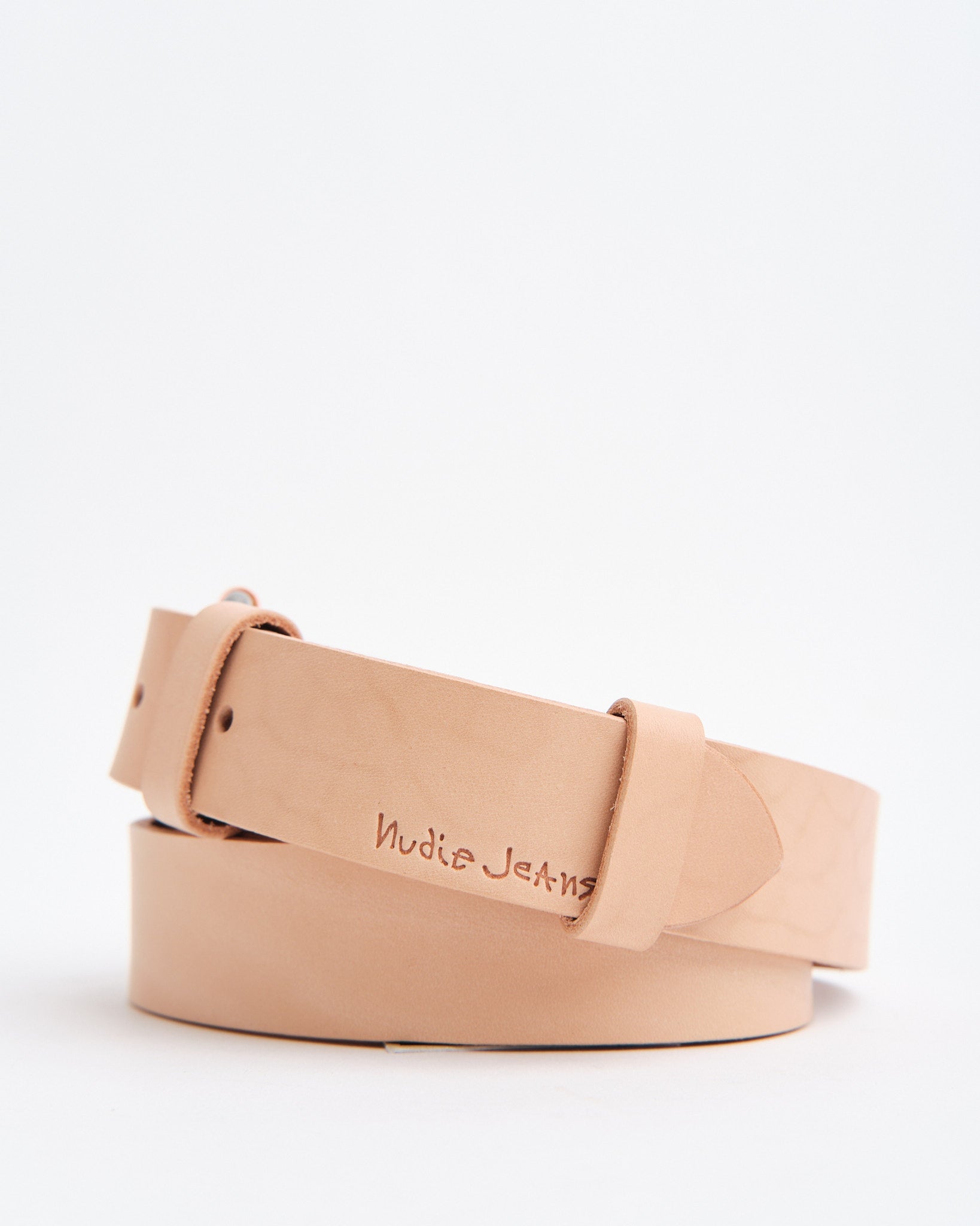 Dwayne Leren Riem Natuurlijk van Nudie Jeans Co. Gesneden uit plantaardig gelooid volnerfleer dat prachtig zal verouderen. Twee lussen, metalen gesp en Nudie Jeans reliëflogo. 100% leer en 28 mm breedte. Maten zijn in cm. Gemaakt in Polen.