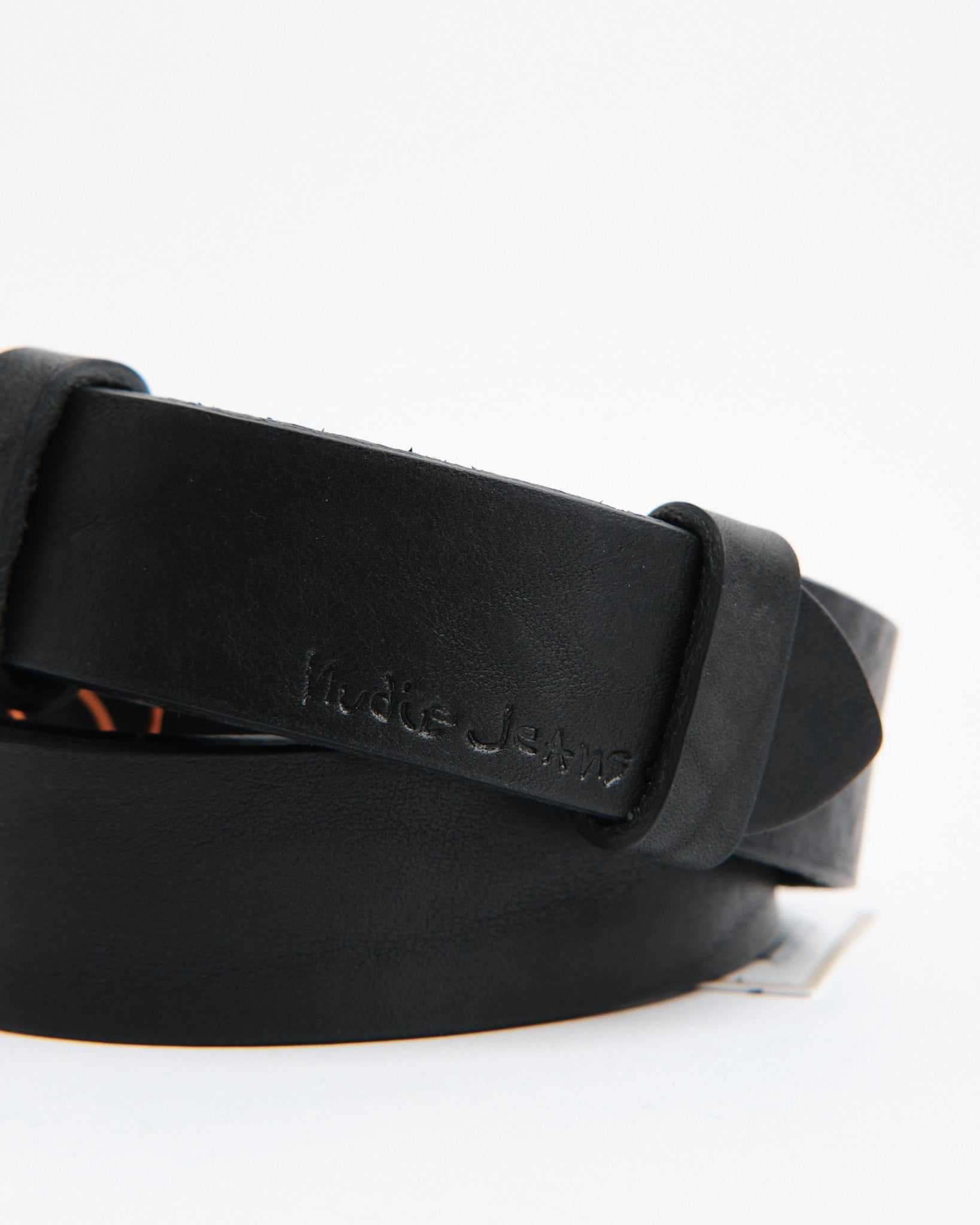 Dwayne Leren Riem Zwart van Nudie Jeans Co. Gesneden uit plantaardig gelooid volnerfleer dat prachtig zal verouderen. Twee lussen, metalen gesp en Nudie Jeans reliëflogo. 100% leer en 28 mm breedte. Maten zijn in cm. Gemaakt in Polen.