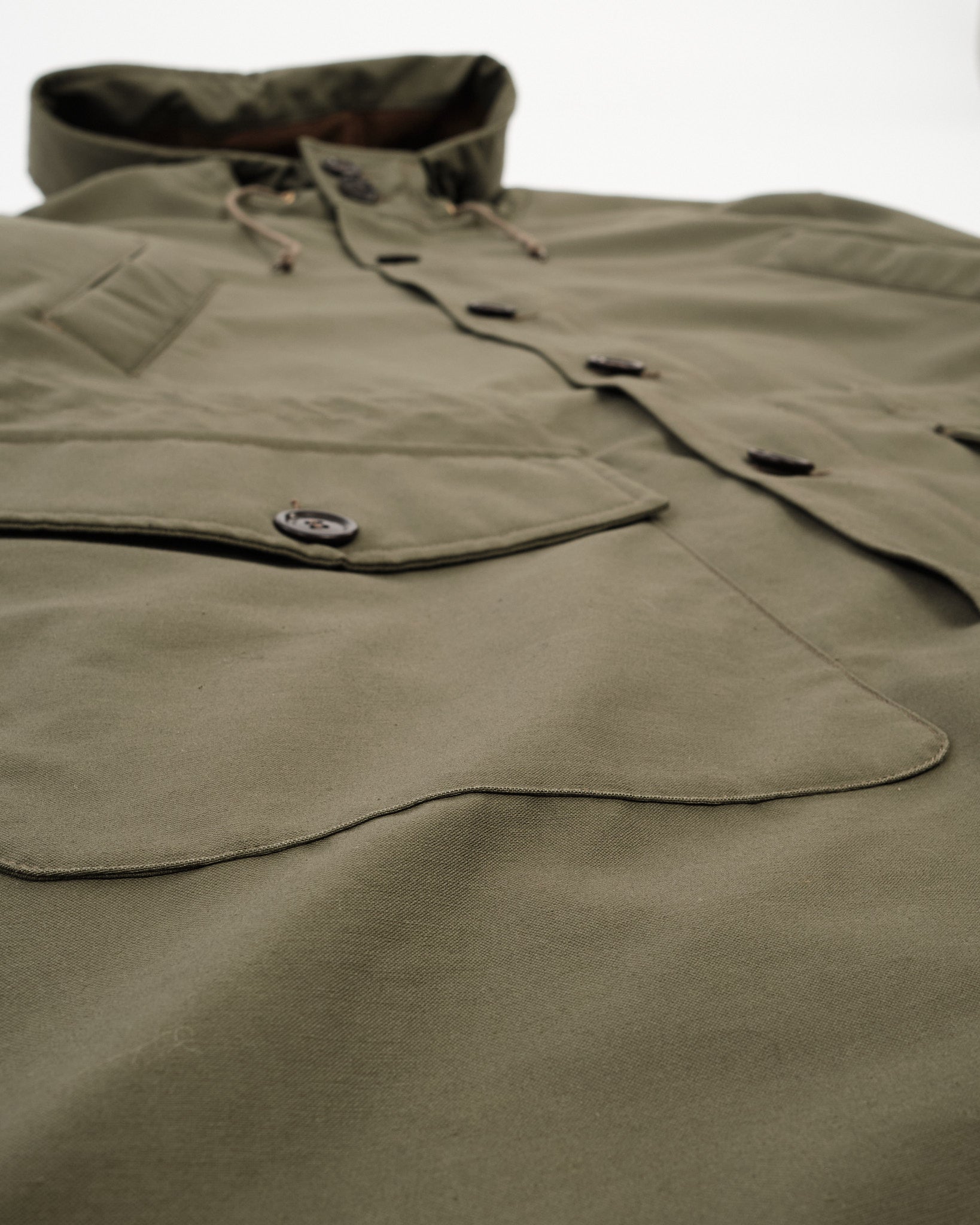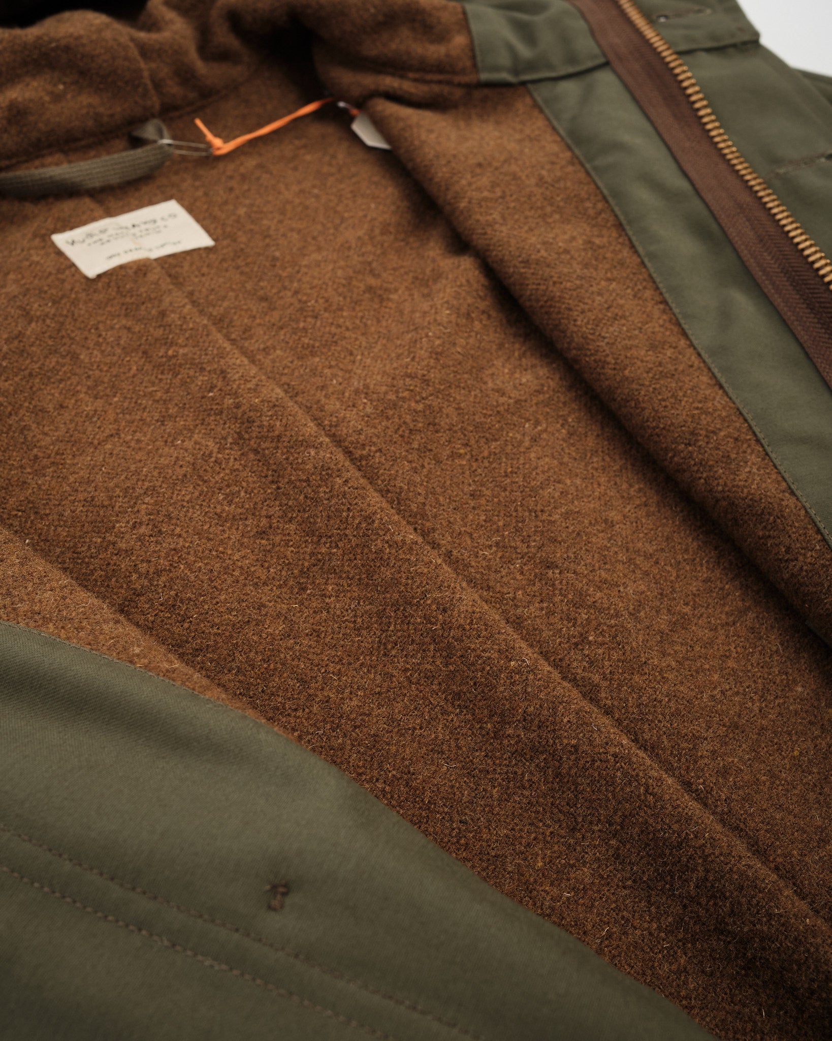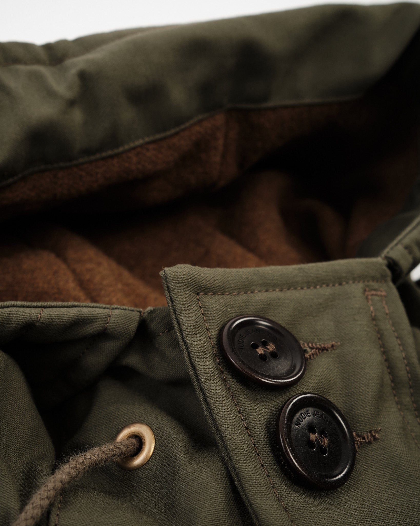 Binnenin vind je een voering van gerecyclede vezels die precies de juiste hoeveelheid warmte toevoegt. Aan de buitenkant draait alles om detail: natuurlijke corozo knopen, afwerkingen met goudkleur, en een schone silhouet die nut en eenvoud in balans brengt. Gemaakt in Portugal met Nudie's kenmerkende oog voor duurzaamheid, dit is een parka die de daad bij het woord voegt — rustig maar zelfverzekerd.