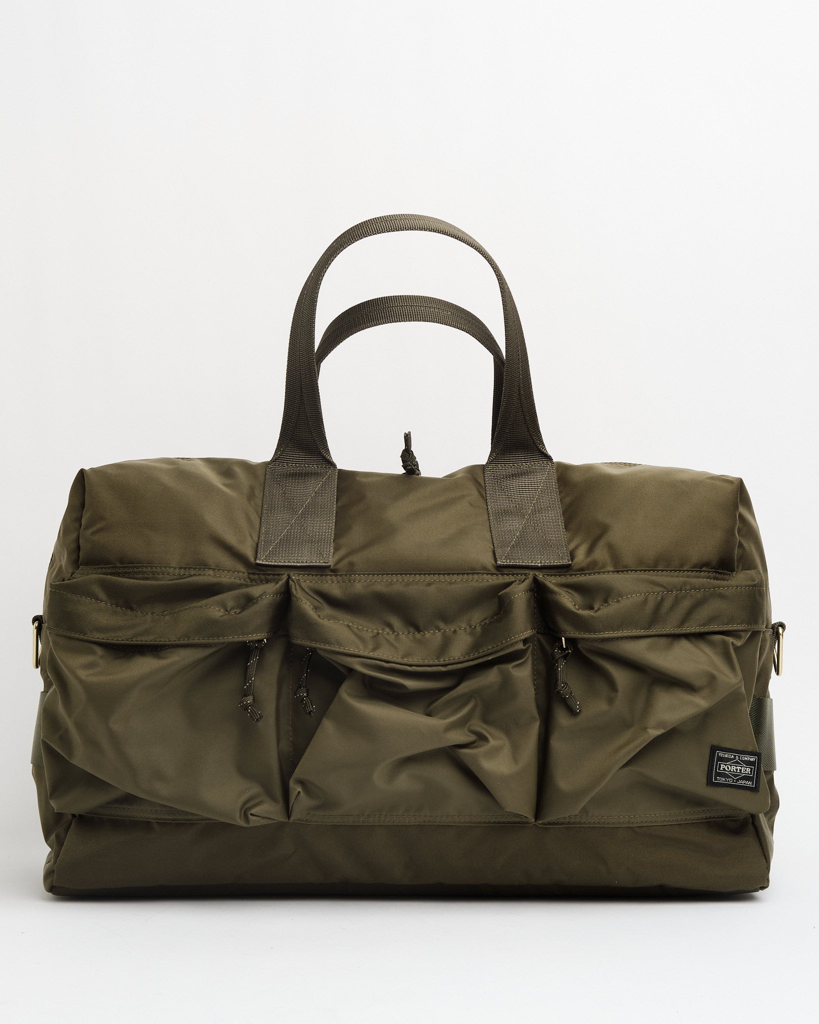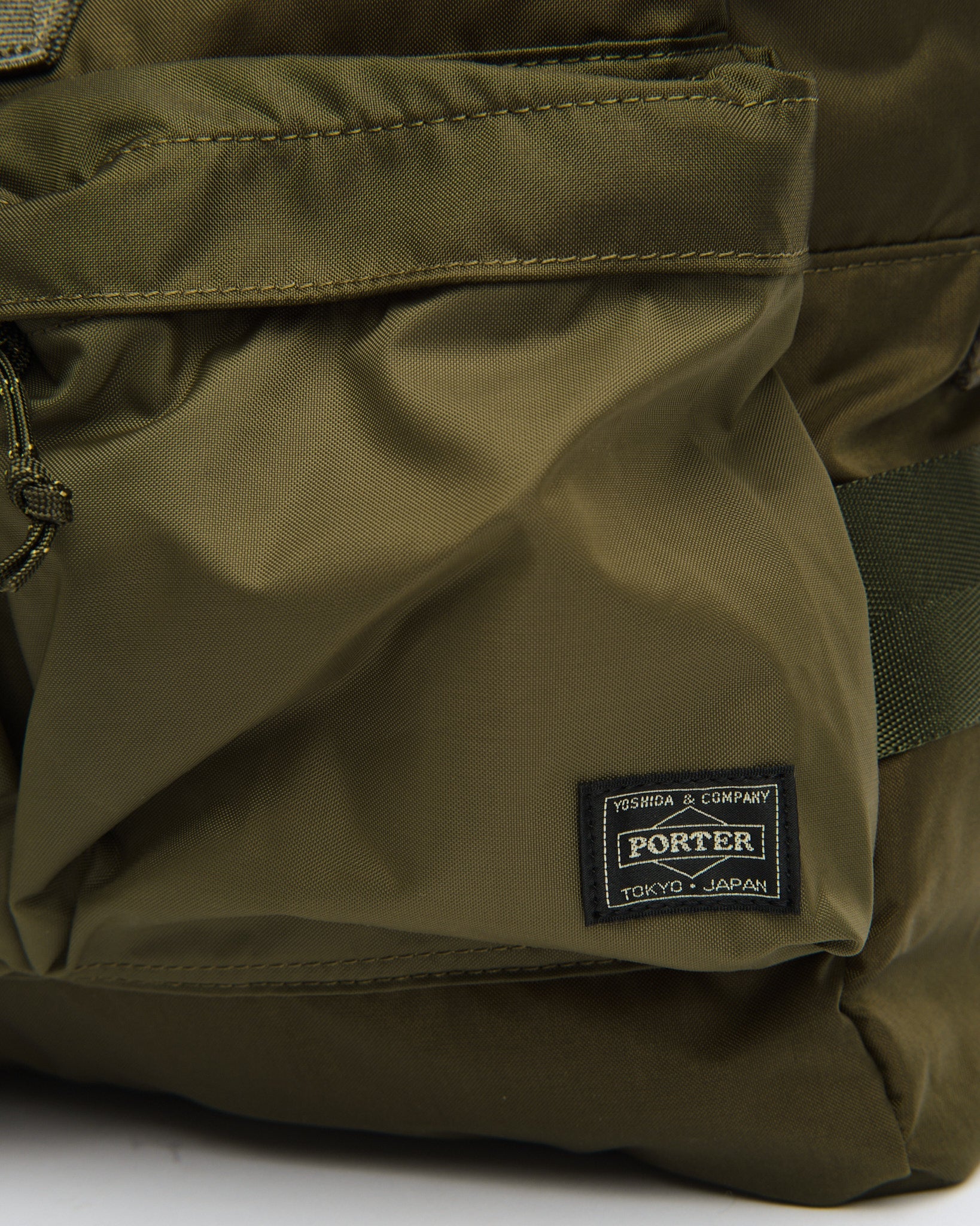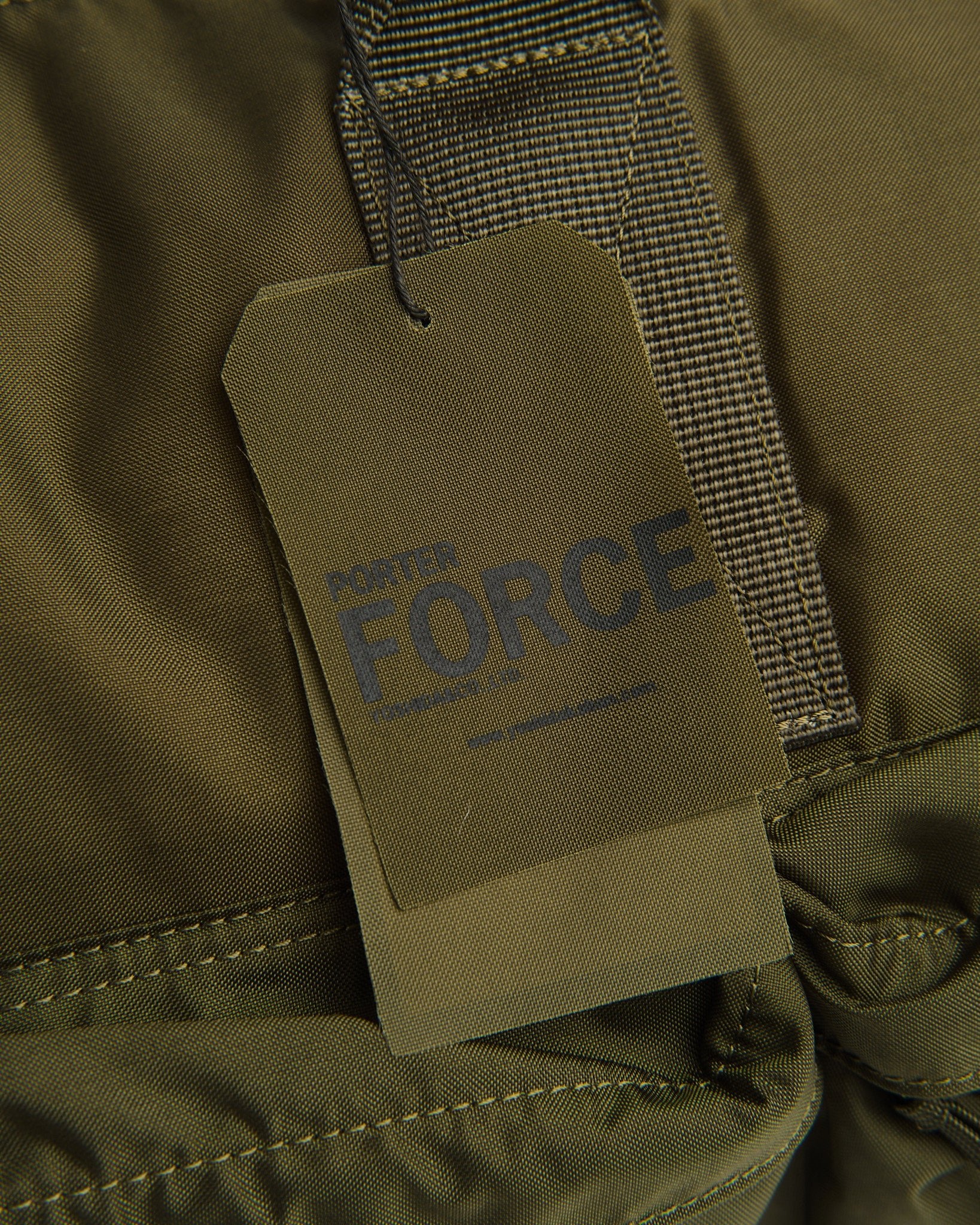 De PORTER BY YOSHIDA Force 2-Way Duffle Bag maakt deel uit van de PORTER FORCE serie, geïnspireerd door militaire esthetiek en de toevallige kleurverschillen die in militaire goederen worden gevonden. Een opvallend kenmerk van dit ontwerp is de subtiele kleurvariatie tussen de stof van het voorvak en het hoofdgedeelte van de tas, wat de indruk wekt van het gebruik van verschillende stofpartijen. Deze serie viert de onregelmatige kleurenschema's die in militaire kleding en accessoires worden gevonden.