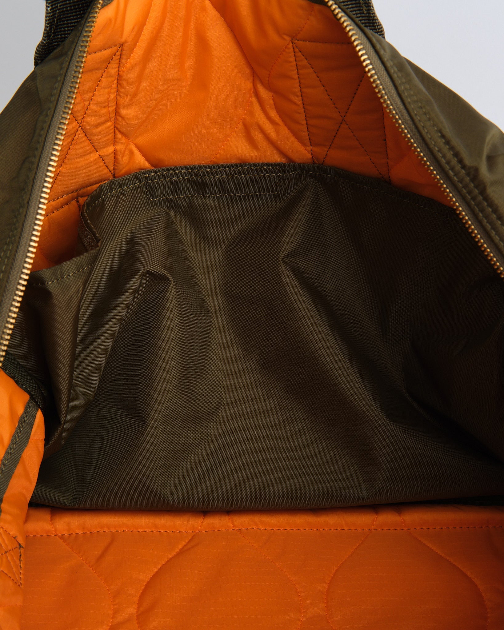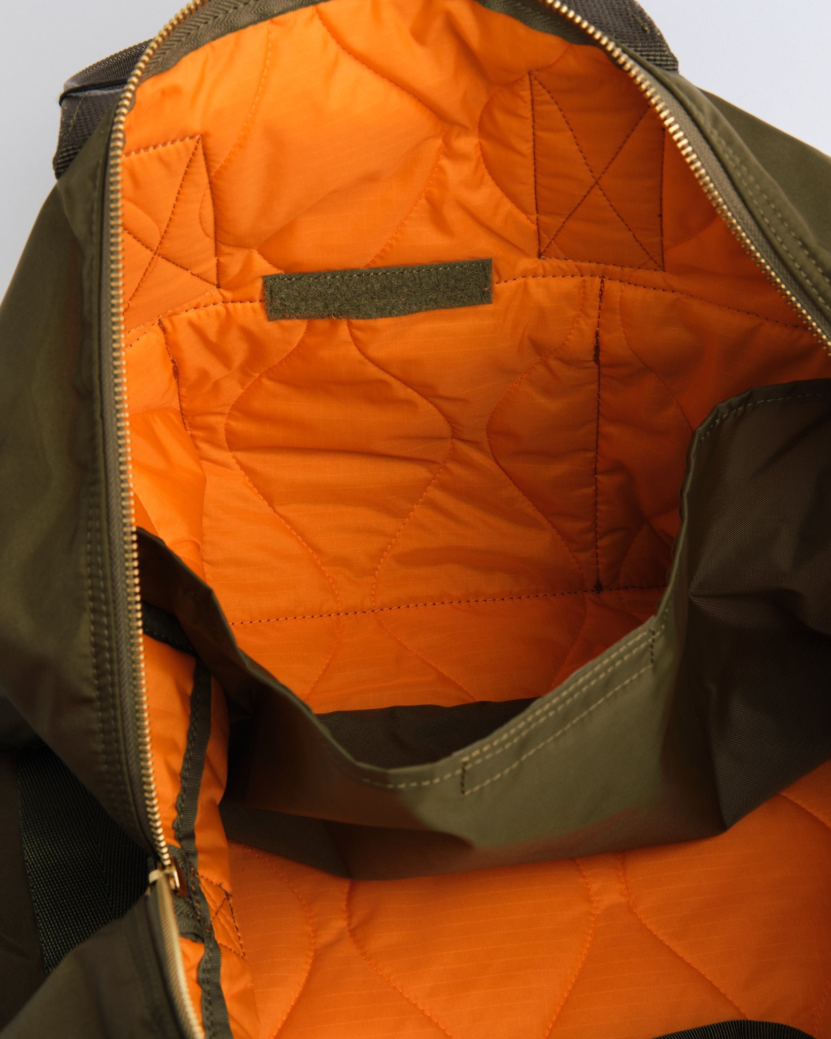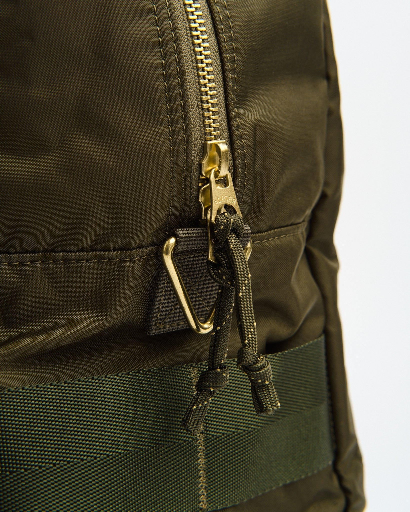 De PORTER BY YOSHIDA Force 2-Way Duffle Bag maakt deel uit van de PORTER FORCE serie, geïnspireerd door militaire esthetiek en de toevallige kleurverschillen die in militaire goederen worden gevonden. Een opvallend kenmerk van dit ontwerp is de subtiele kleurvariatie tussen de stof van het voorvak en het hoofdgedeelte van de tas, wat de indruk wekt van het gebruik van verschillende stofpartijen. Deze serie viert de onregelmatige kleurenschema's die in militaire kleding en accessoires worden gevonden.