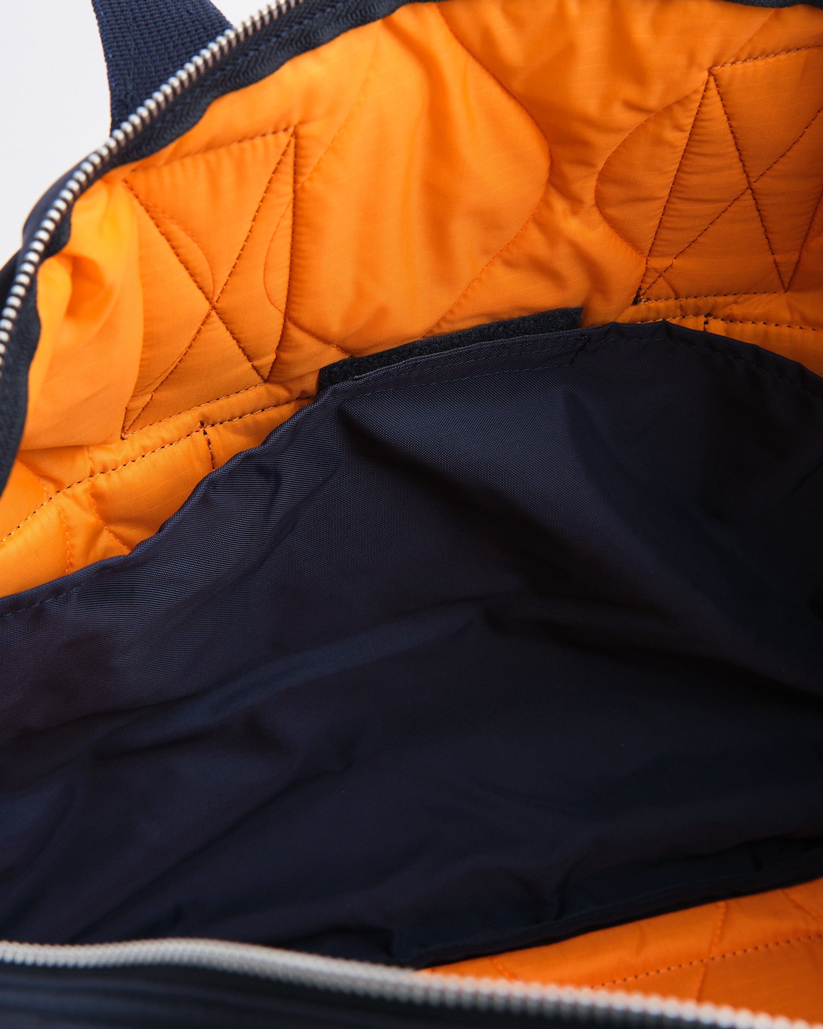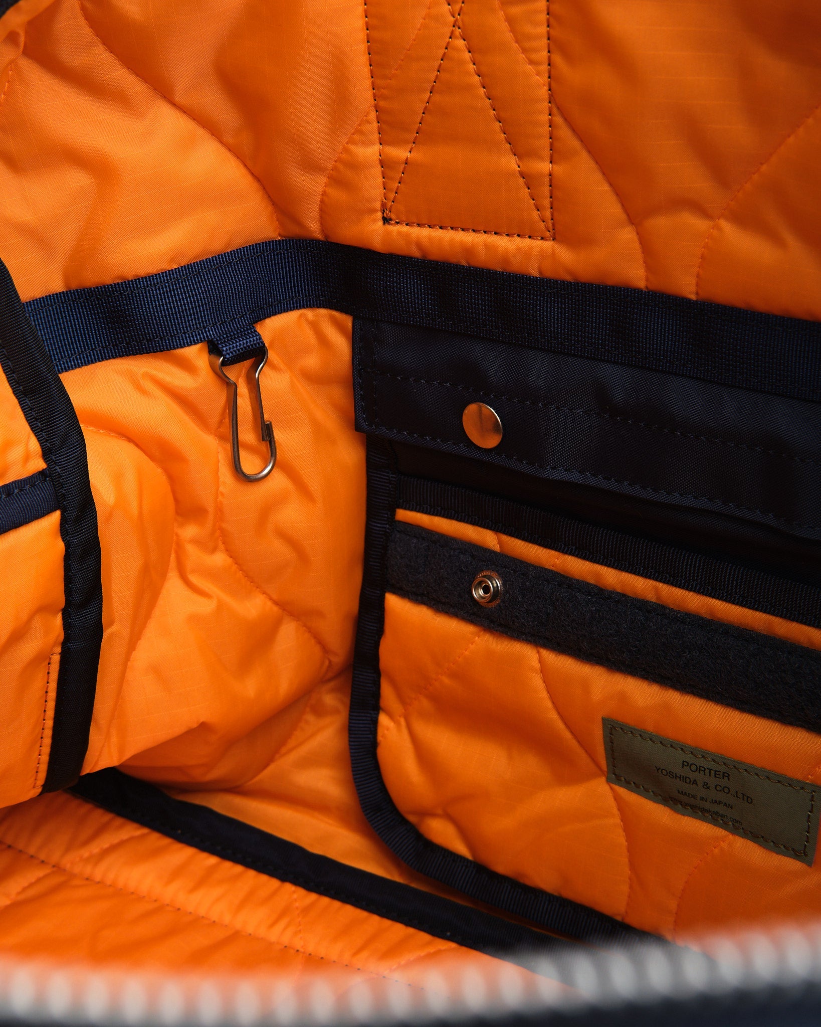 Vervaardigd uit industrieel-grade stof geweven met 210 denier 6 nylon sterk garen, oorspronkelijk gebruikt voor rubberboten, is de tas uitzonderlijk duurzaam. Het interieur pronkt met een noodkleur oranje voering, geïnspireerd door de voeringen van militaire jassen, en beschikt over gewatteerd ripstop nylon voor extra veerkracht.