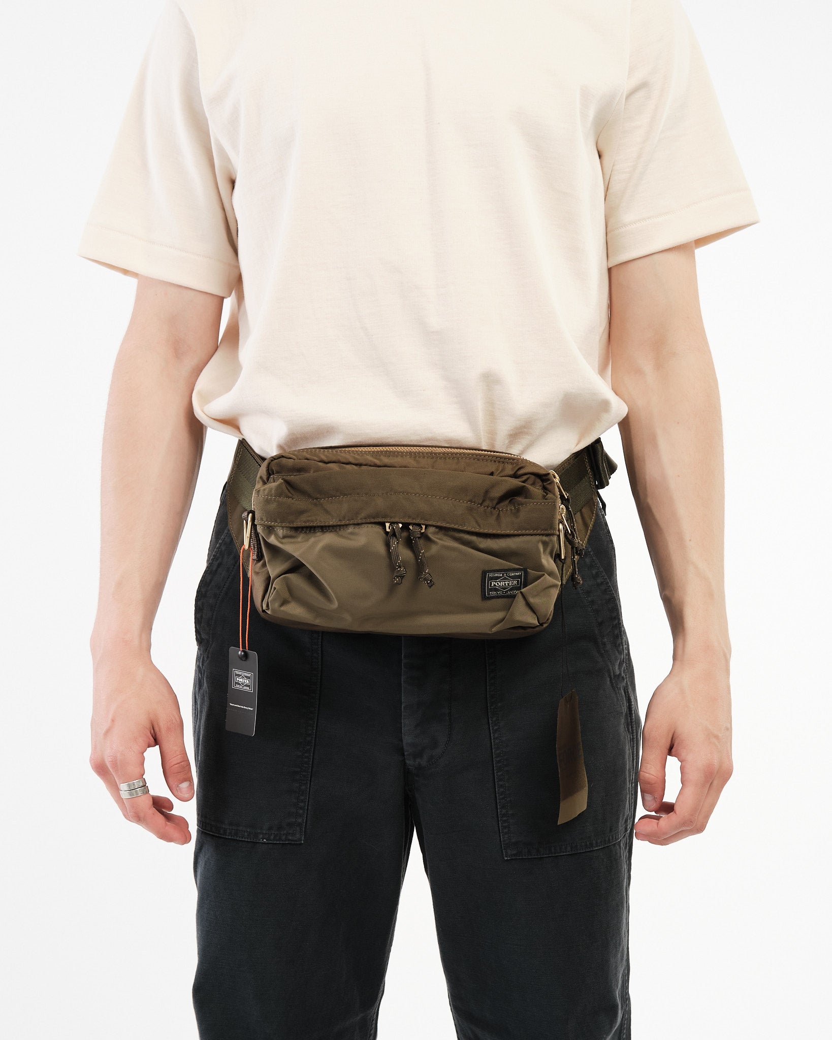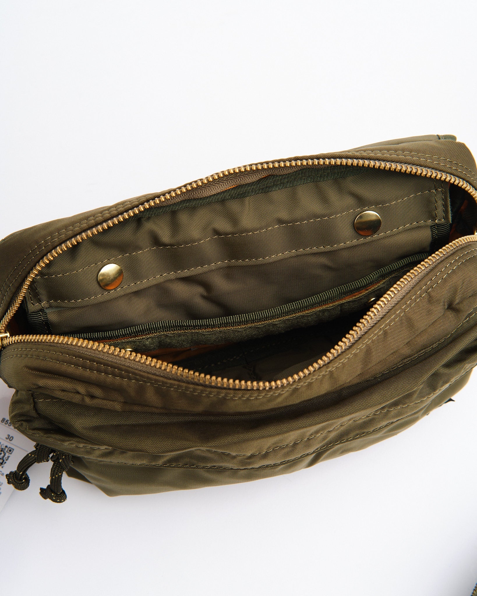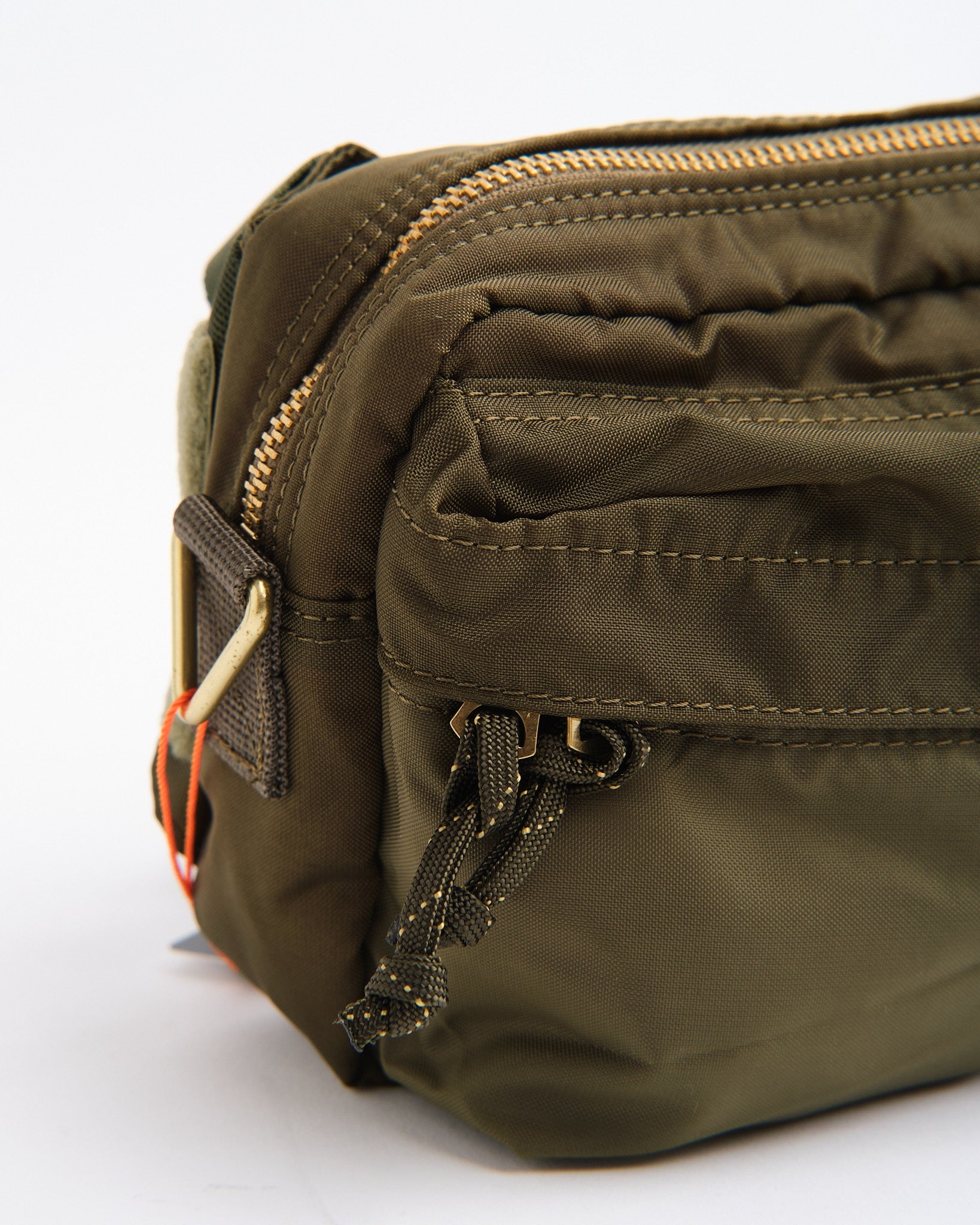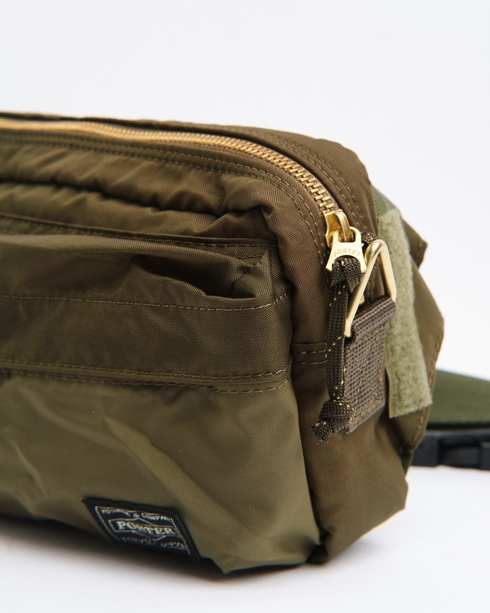 De PORTER BY YOSHIDA Force 2-Way Waist Bag maakt deel uit van de PORTER FORCE serie, geïnspireerd door militaire esthetiek en de toevallige kleurverschillen die in militaire goederen worden gevonden. Een kenmerkend kenmerk van dit ontwerp is de subtiele kleurvariatie tussen de stof van het voorvak en het hoofdlichaam van de tas, waardoor het lijkt alsof er verschillende stofpartijen worden gebruikt. Deze serie omarmt de onregelmatige kleurenschema's die van nature voorkomen in militaire kleding en accessoires.