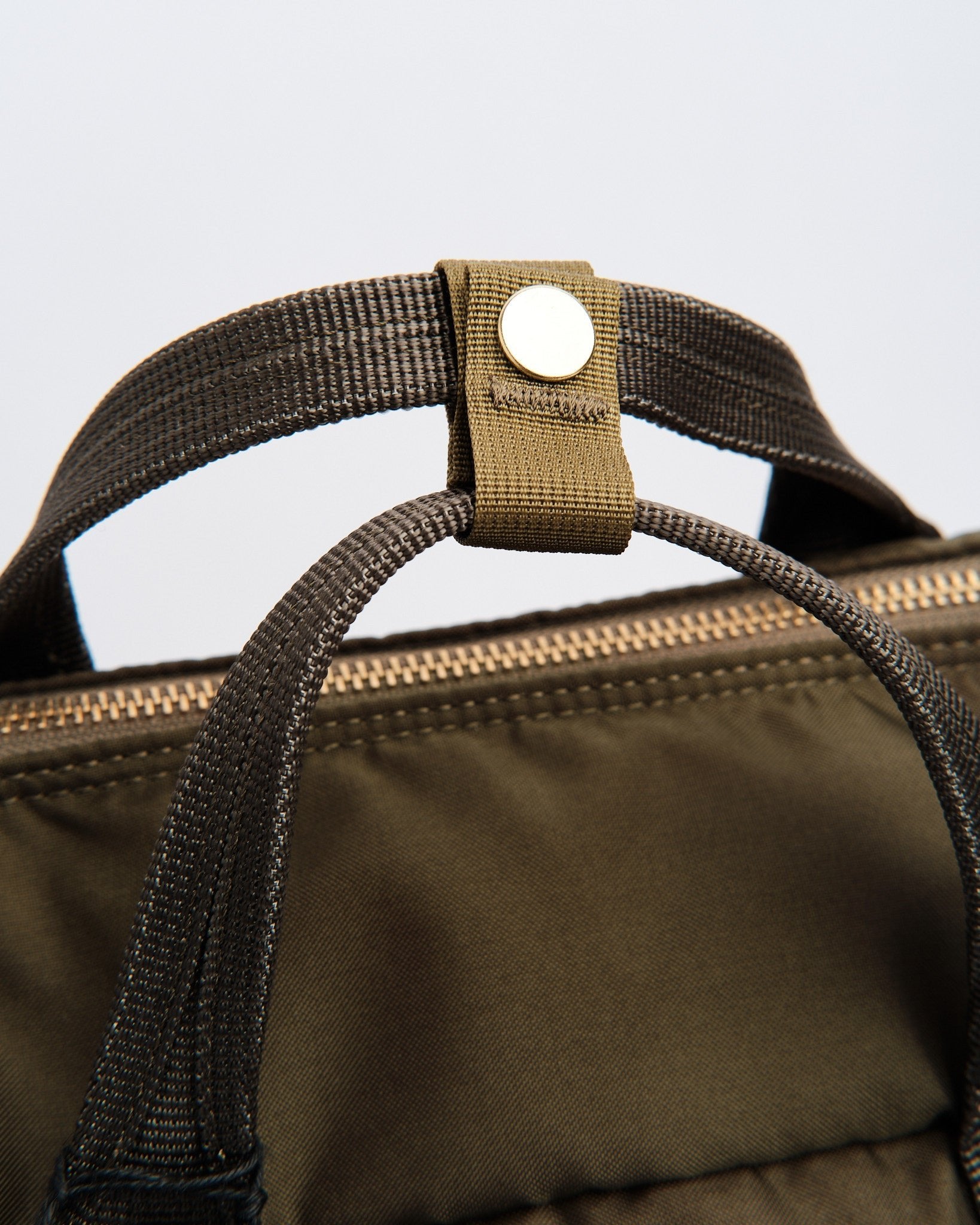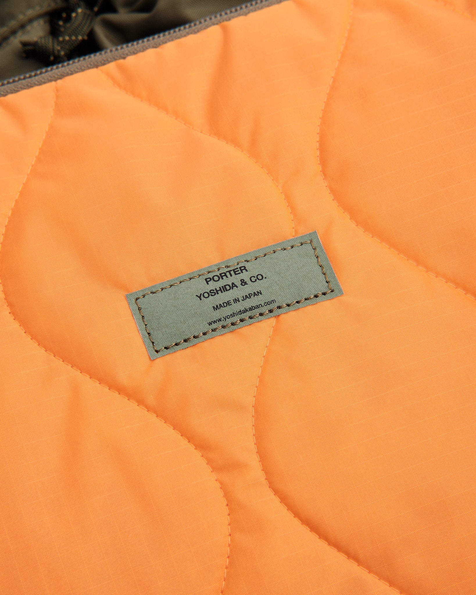 Vervaardigd uit industrieel-grade stof geweven met 210 denier 6 nylon sterk garen, oorspronkelijk gebruikt voor rubberboten, is de tas uitzonderlijk duurzaam. Het interieur pronkt met een noodkleur oranje voering, geïnspireerd door voeringen van militaire jassen, en bevat gewatteerd ripstop nylon voor extra veerkracht.