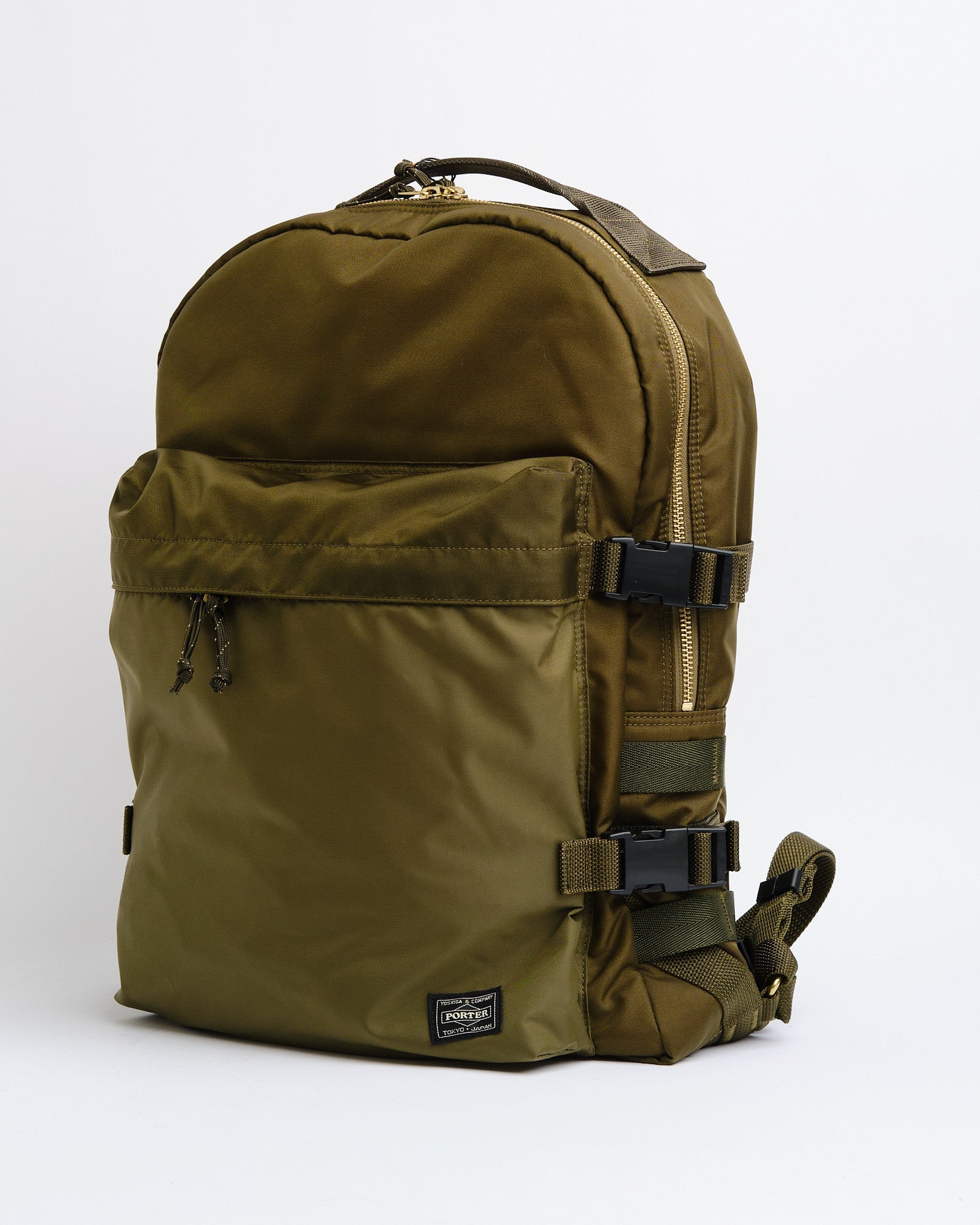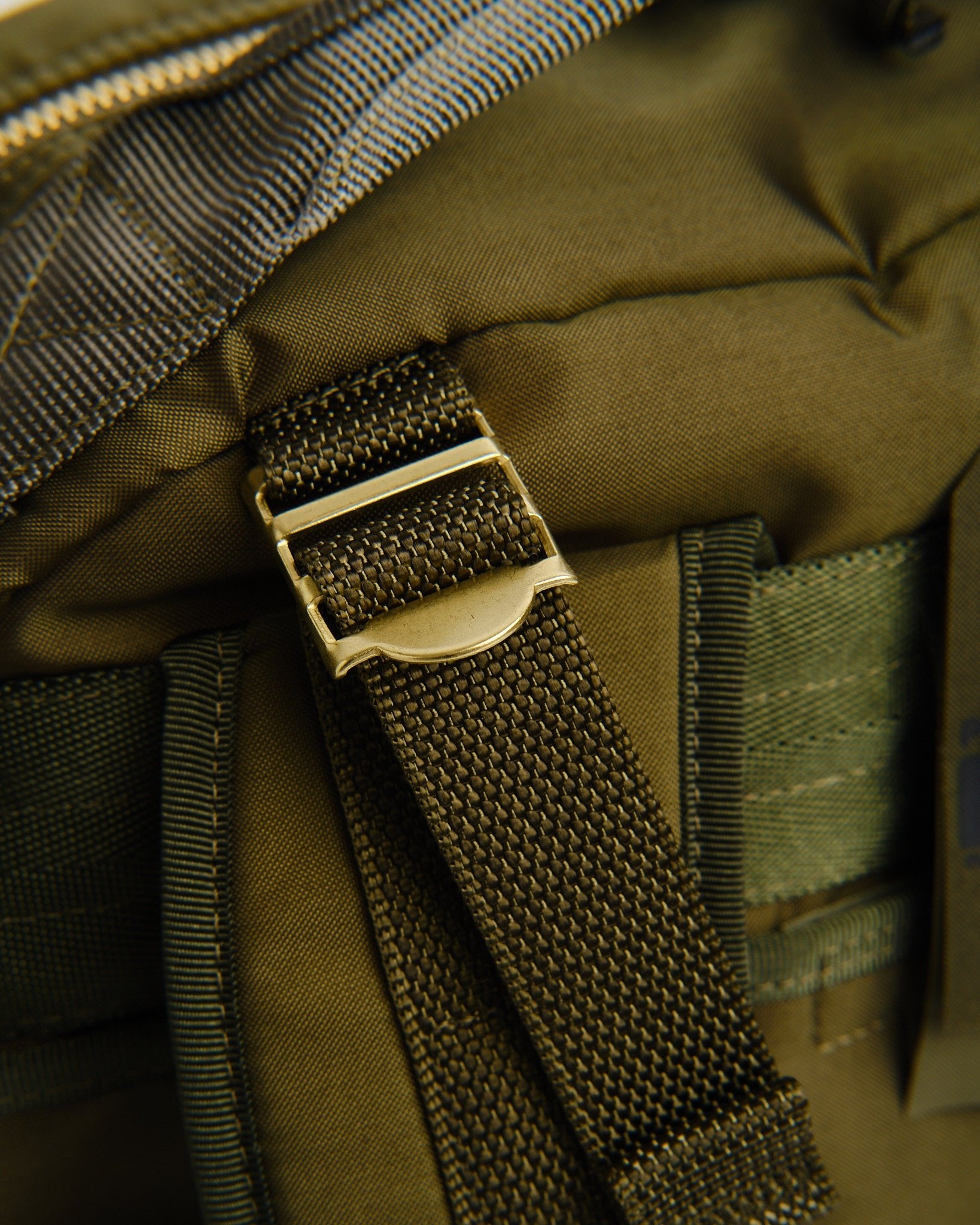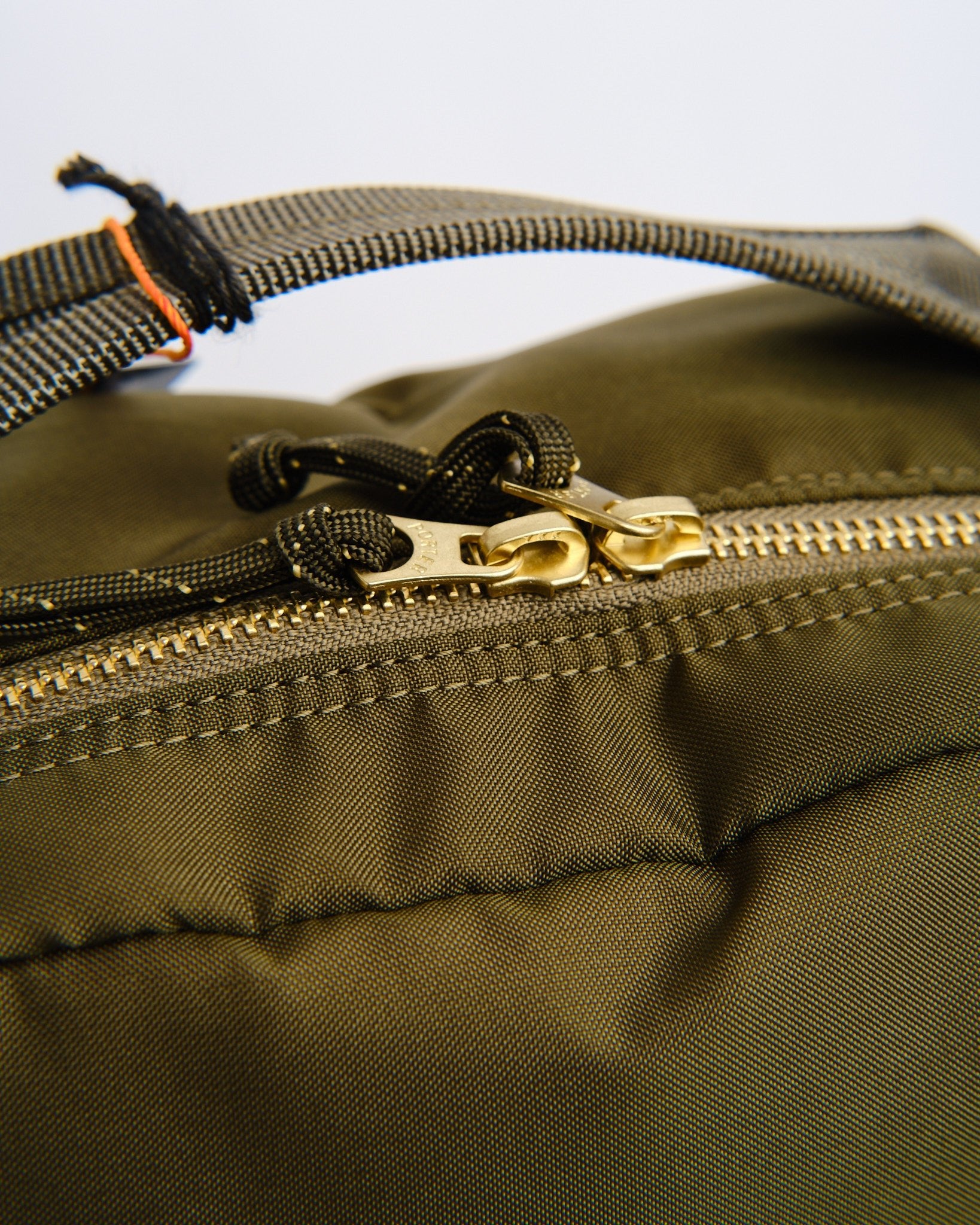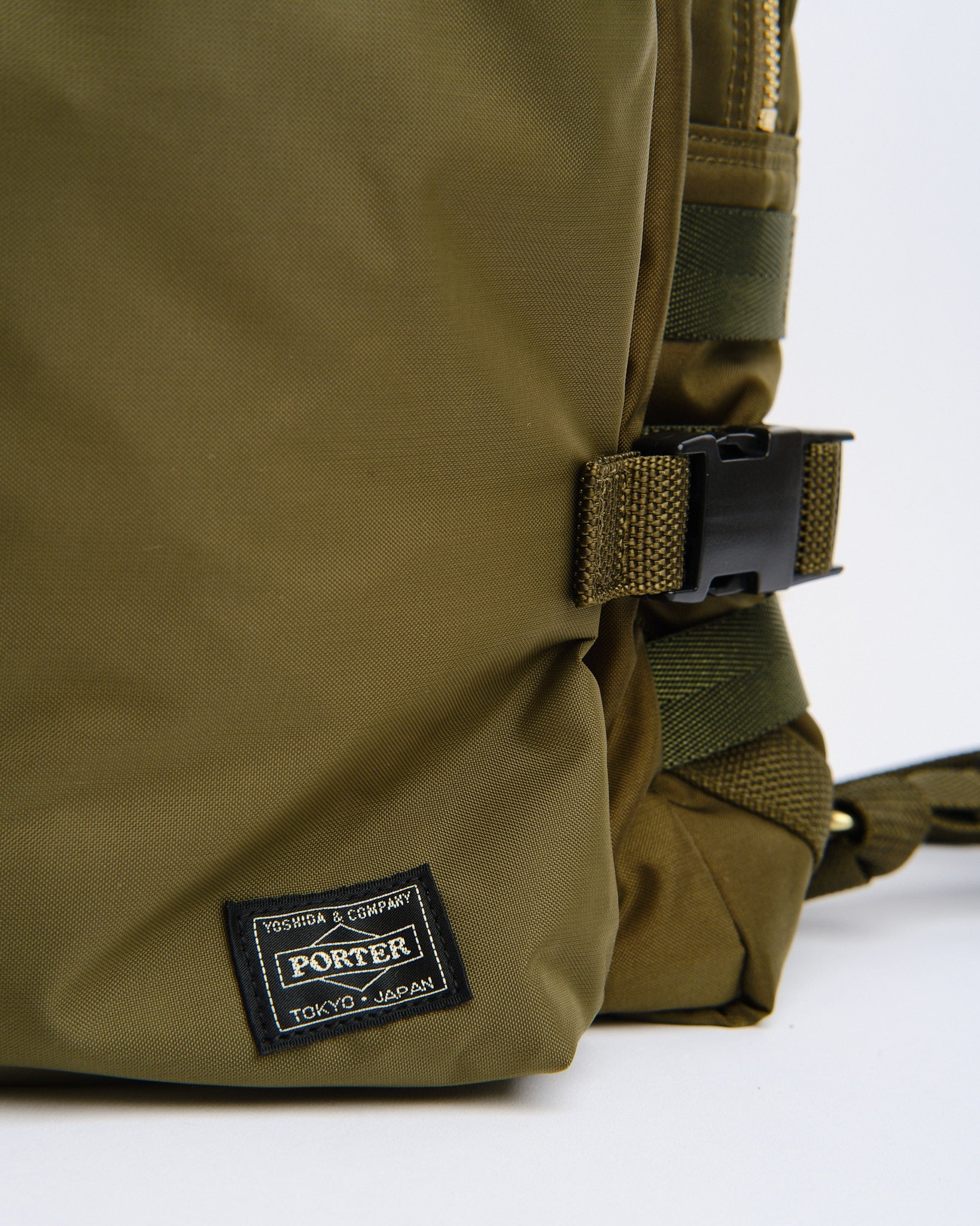 De PORTER BY YOSHIDA Force Daypack maakt deel uit van de PORTER FORCE serie, geïnspireerd door militaire esthetiek en de toevallige kleurverschillen die in militaire goederen worden gevonden. Een opvallend kenmerk van dit ontwerp is de subtiele kleurvariatie tussen de stof van het voorvak en het hoofdlichaam, waardoor het lijkt alsof er verschillende stofpartijen worden gebruikt. Deze serie viert de onregelmatige kleurenschema's die in militaire kleding en accessoires worden gevonden.