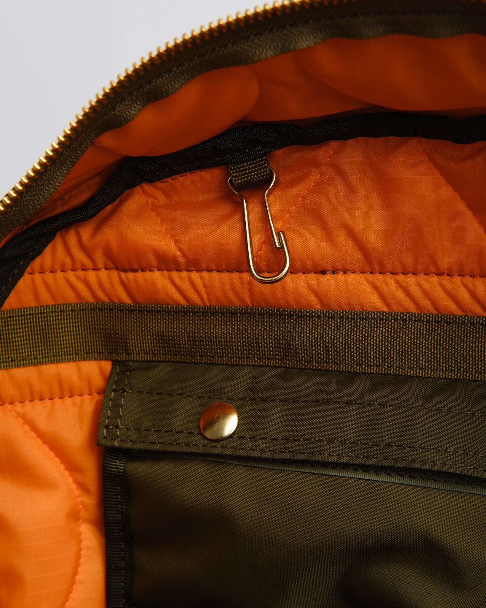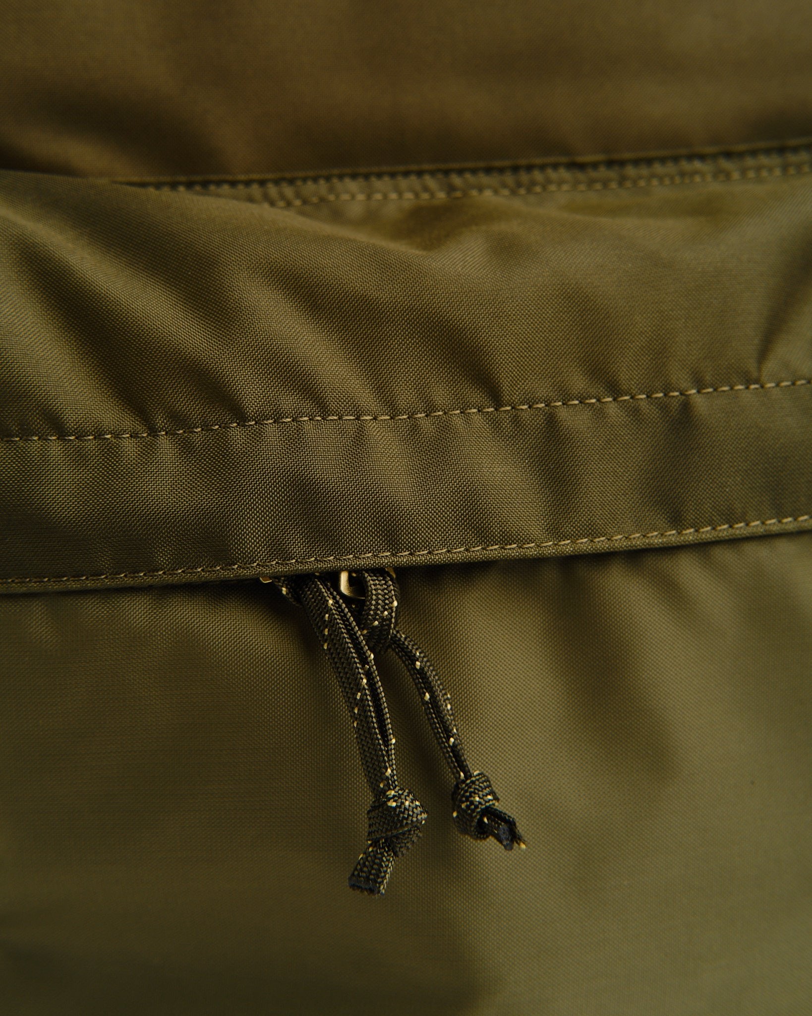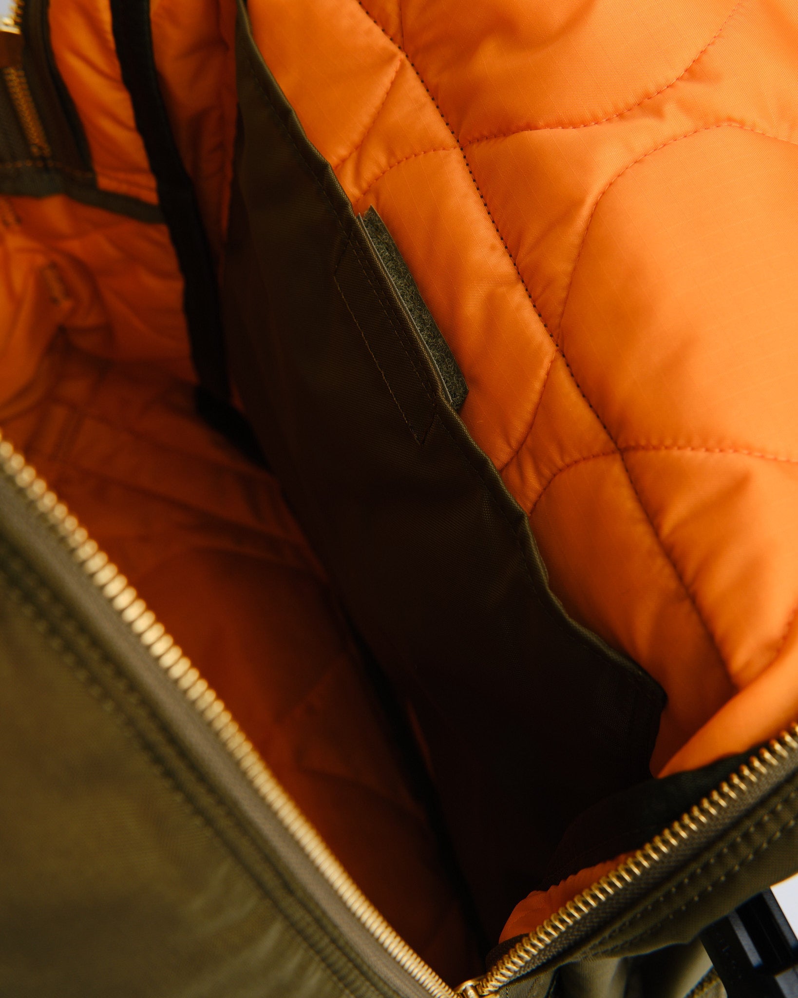 Het buitenmateriaal is vervaardigd uit industrieel-grade stof geweven met 210 denier 6 nylon sterk garen, oorspronkelijk gebruikt voor rubberboten, waardoor het uitzonderlijk duurzaam is. Het interieur pronkt met een noodkleur oranje voering, geïnspireerd door de voeringen van militaire jassen, en beschikt over gewatteerd ripstop nylon voor extra veerkracht.