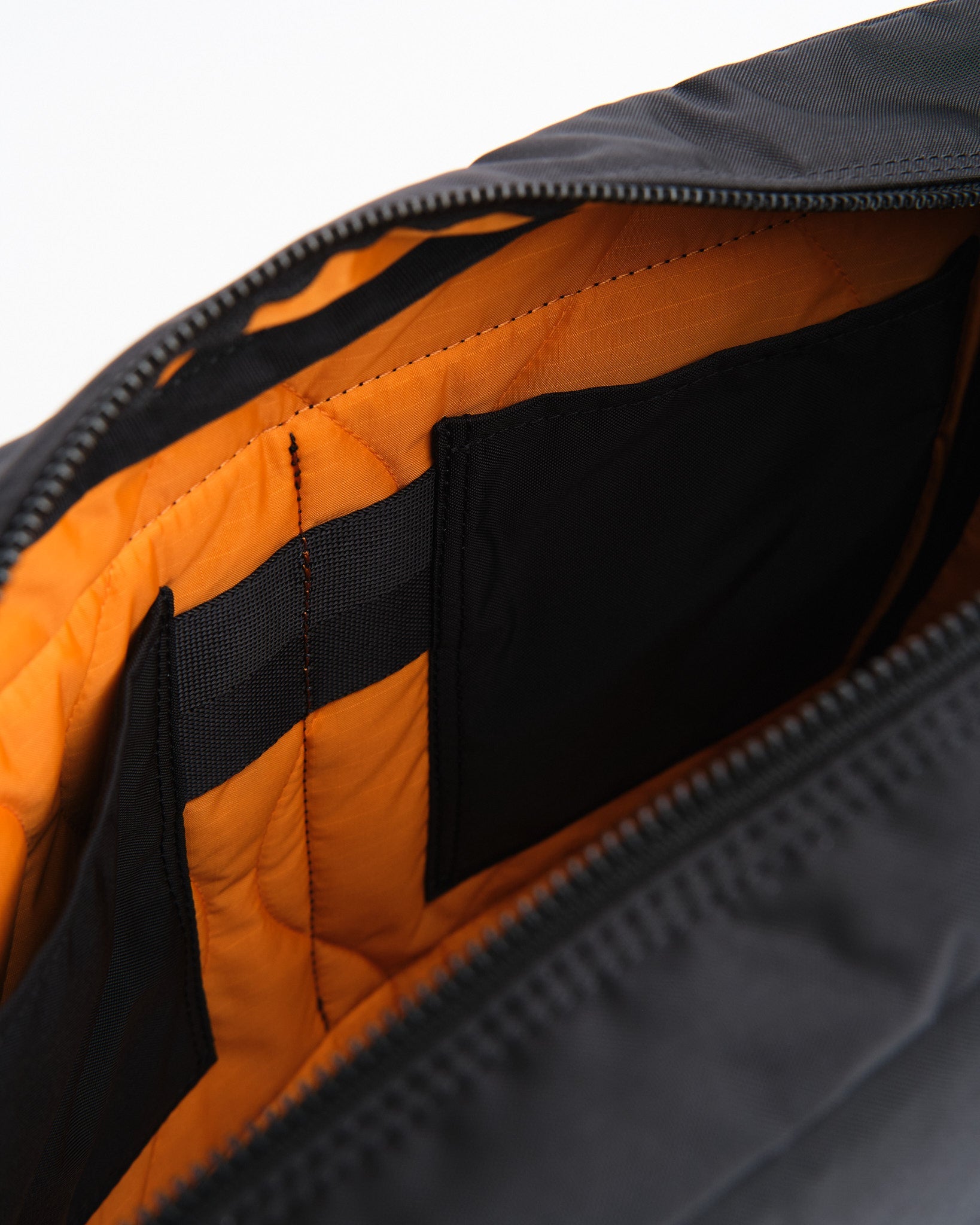 Het buitenmateriaal is vervaardigd uit industrieel-grade stof geweven met 210 denier 6 nylon sterk garen, oorspronkelijk gebruikt voor rubberboten, waardoor het uitzonderlijk duurzaam is. Het interieur heeft een noodkleur oranje voering, geïnspireerd door voeringen van militaire jassen, en is doorgestikt met ripstop nylon voor extra veerkracht.