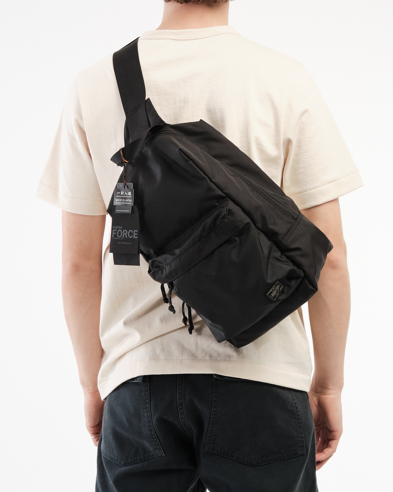 Introductie van de Zwarte Sling Schoudertas uit de PORTER by Yoshida Force serie. Met een militair geïnspireerd ontwerp en praktische functies, is deze tas perfect voor degenen die onderweg zijn. Met afmetingen van W200/H325/D160 en een gewicht van slechts 425 g, is het de ideale grootte om al je essentiële spullen mee te nemen.