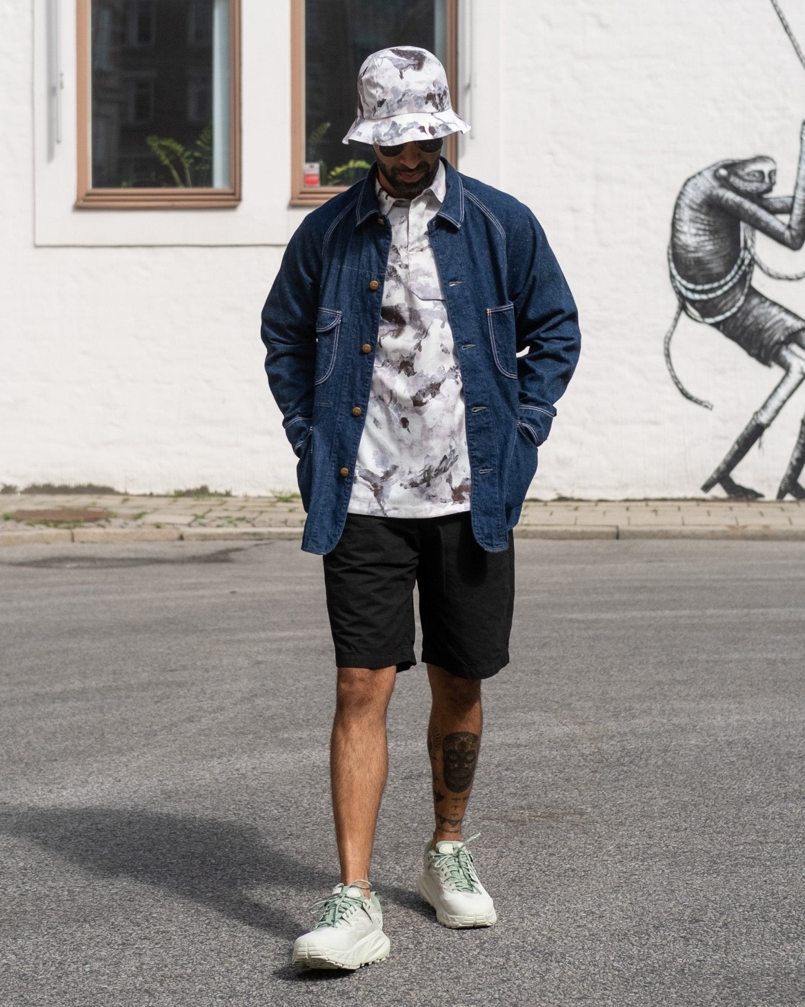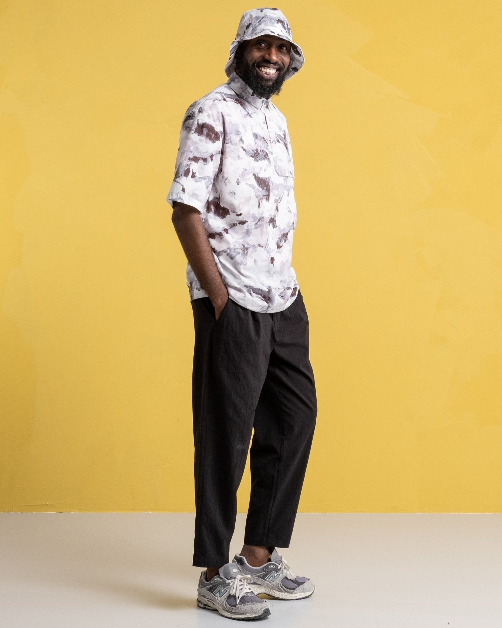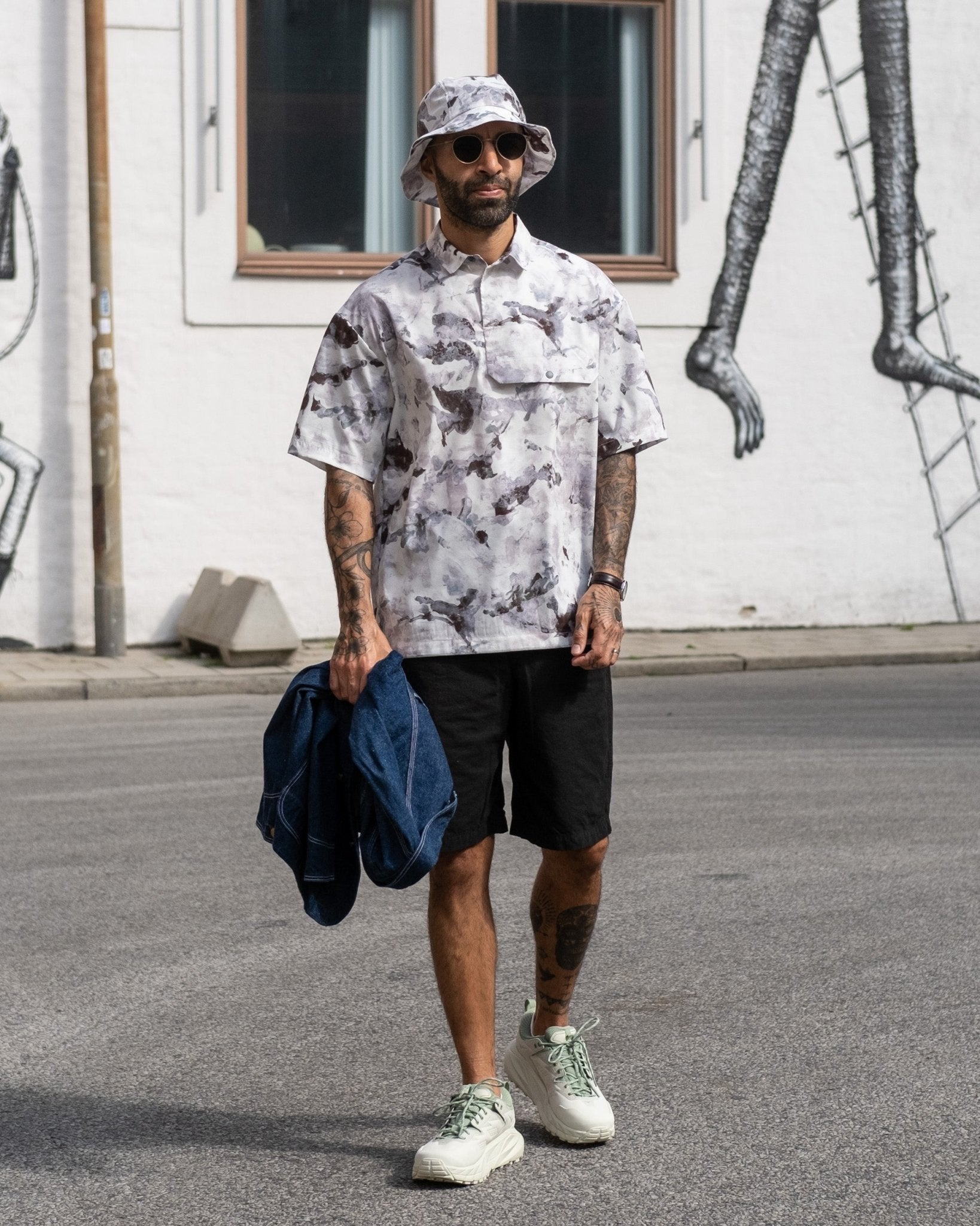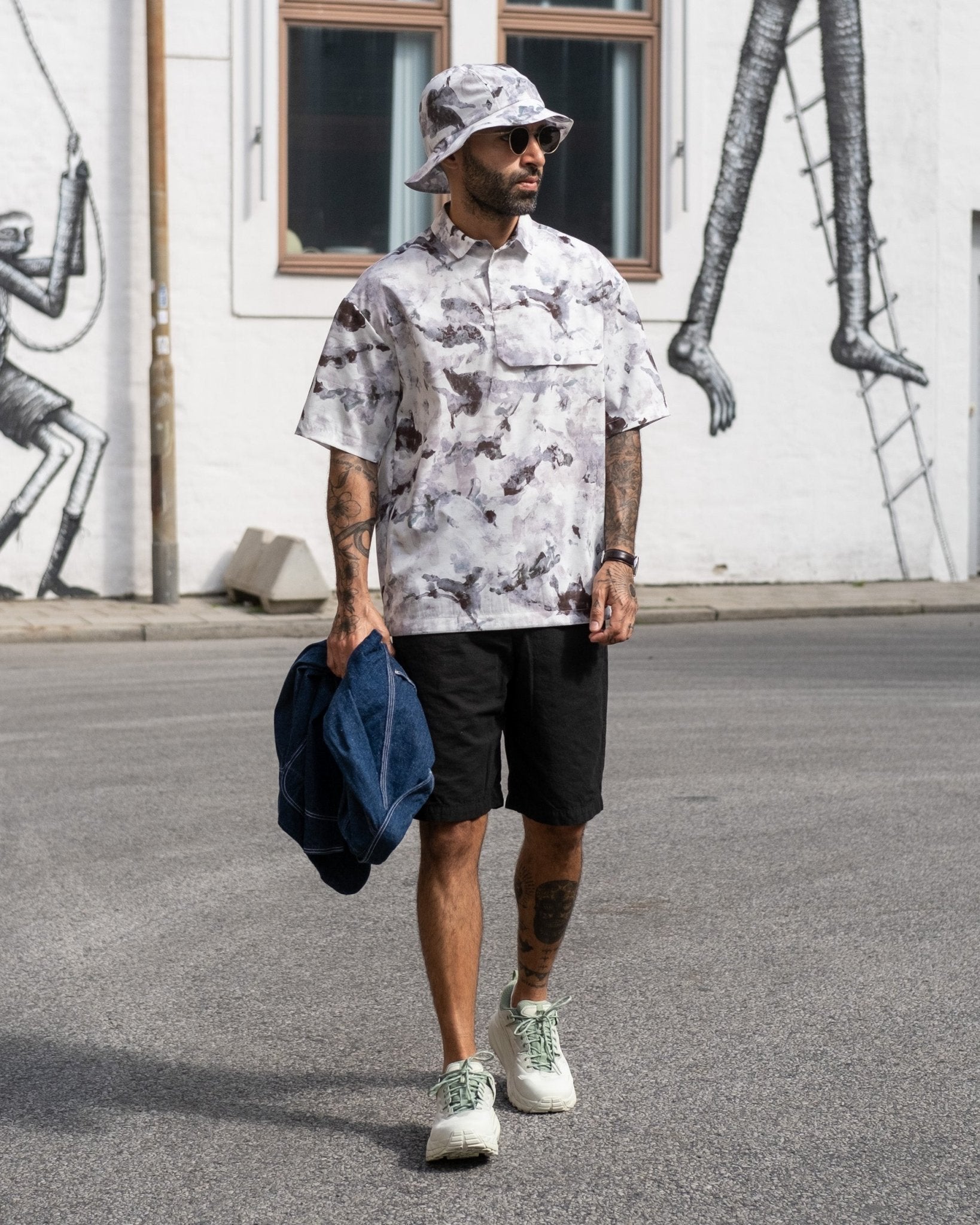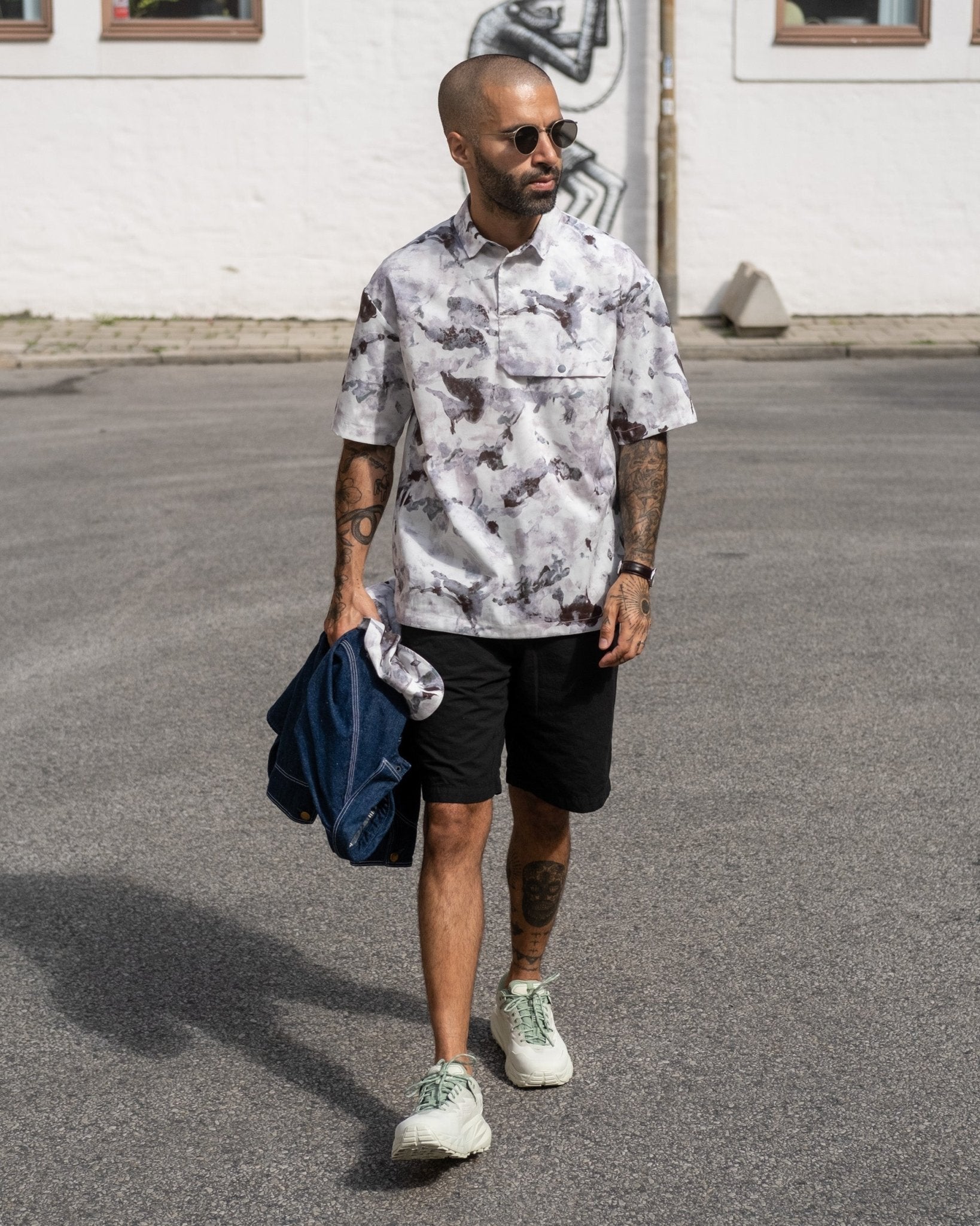 Gedrukt Quick Dry PoloShirt Grijs van Snow Peak. Ontspannen pasvorm shirt gemaakt van een mix van gerecyclede PET-flessen en ademend Primeflex™️. Met een gemarmerde print, geknoopte kraag, rechterborstzak en trekkoord in de zoom. Gemaakt in China.