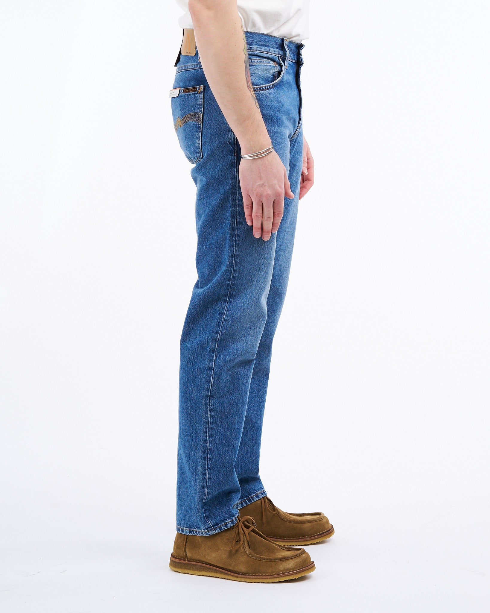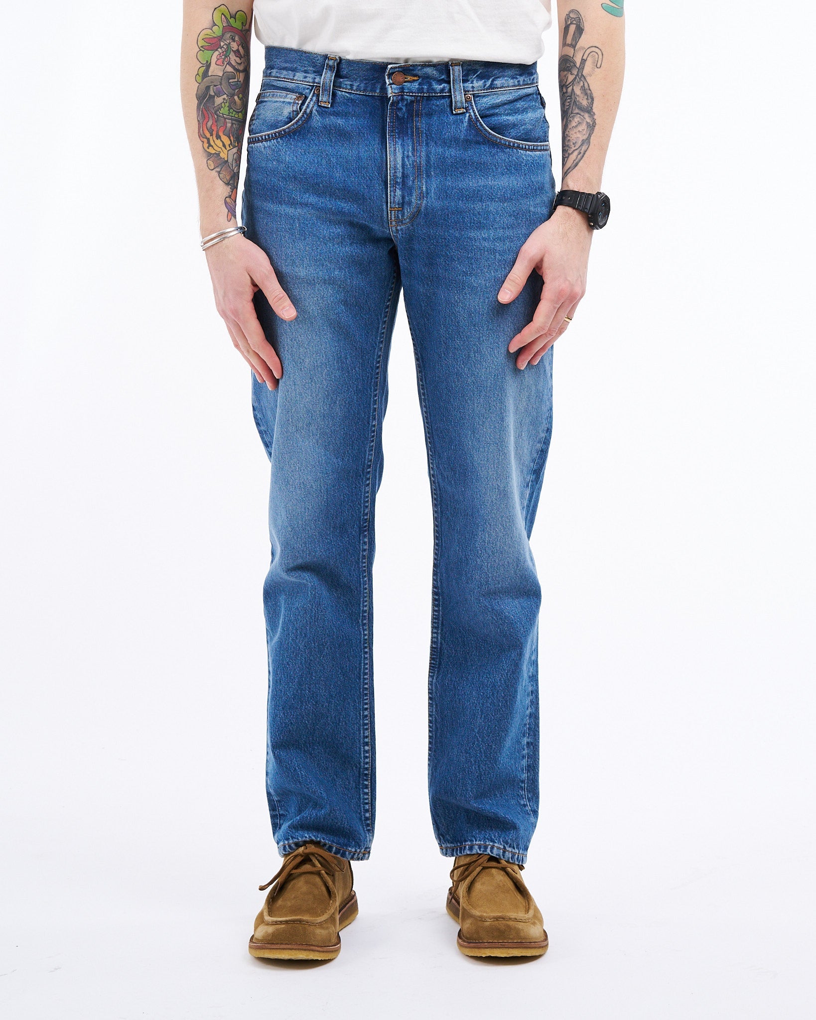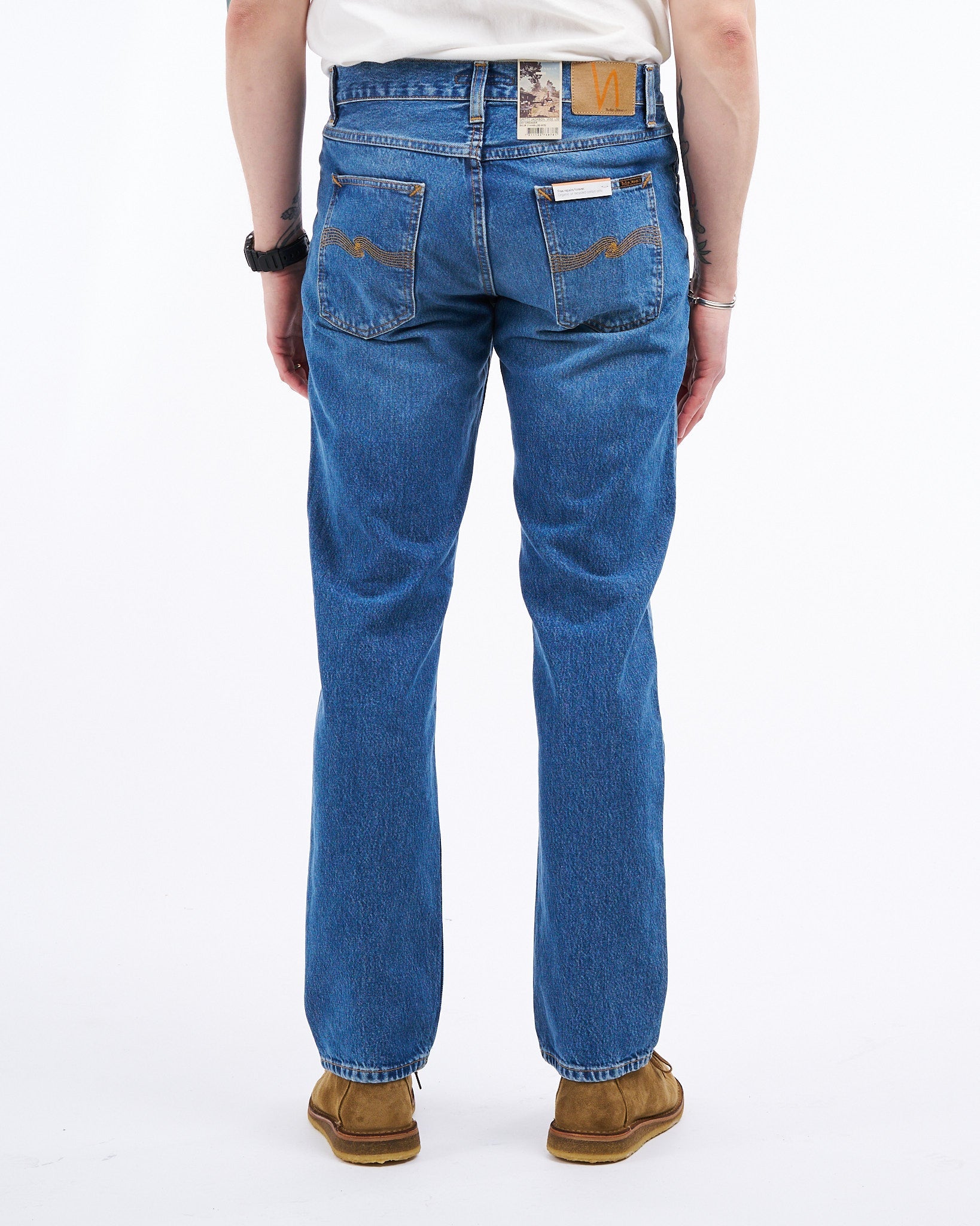 Ervaar de combinatie van allure en verfijnde elegantie, met de Gritty Jackson Day Dreamer jeans, van Nudie Jeans Co. Deze jeans, ontworpen in een pasvorm met een rechte pijp, pronken met een middelblauwe wassing die een boeiende visuele harmonie creëert door subtiele contrasten. Zorgvuldig vervaardigd uit 14,9 oz. Katoenen denim vertonen ze zowel serene versleten gebieden als levendige marmer effecten, resulterend in een schone maar karaktervolle look. De schitterende tinten blauw worden verder versterkt door accenten die een samenspel van kleuren bieden. Met tabakskleurige stiksels, koperen afwerkingen en afgerond met een jacron patch, belichamen deze jeans vakmanschap en duurzame modepraktijken.