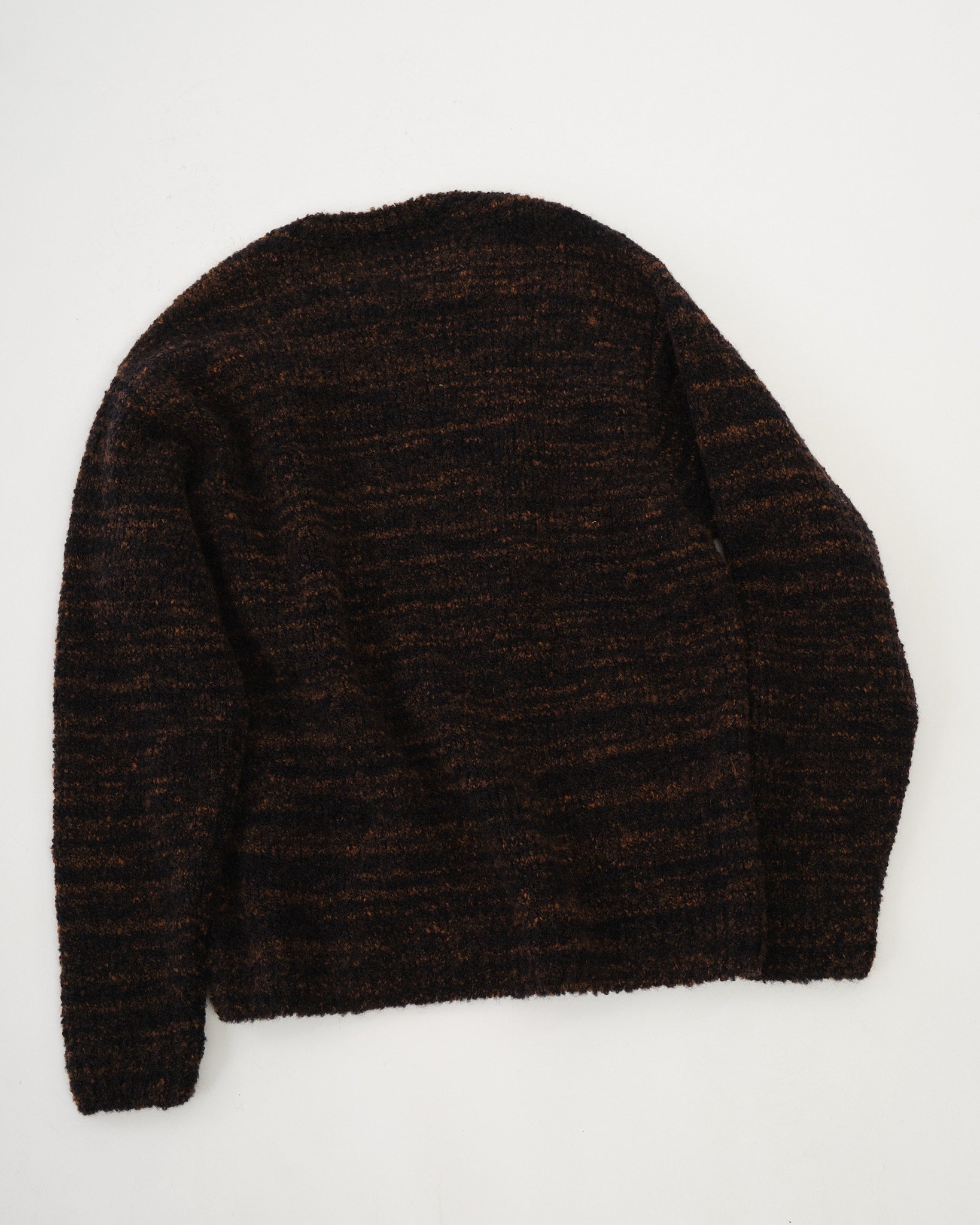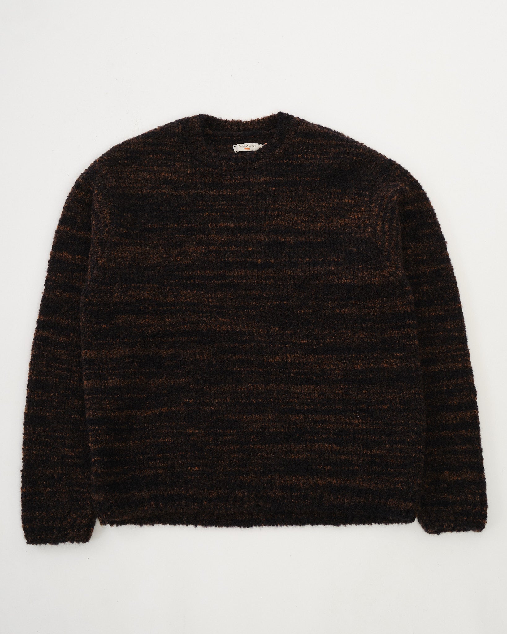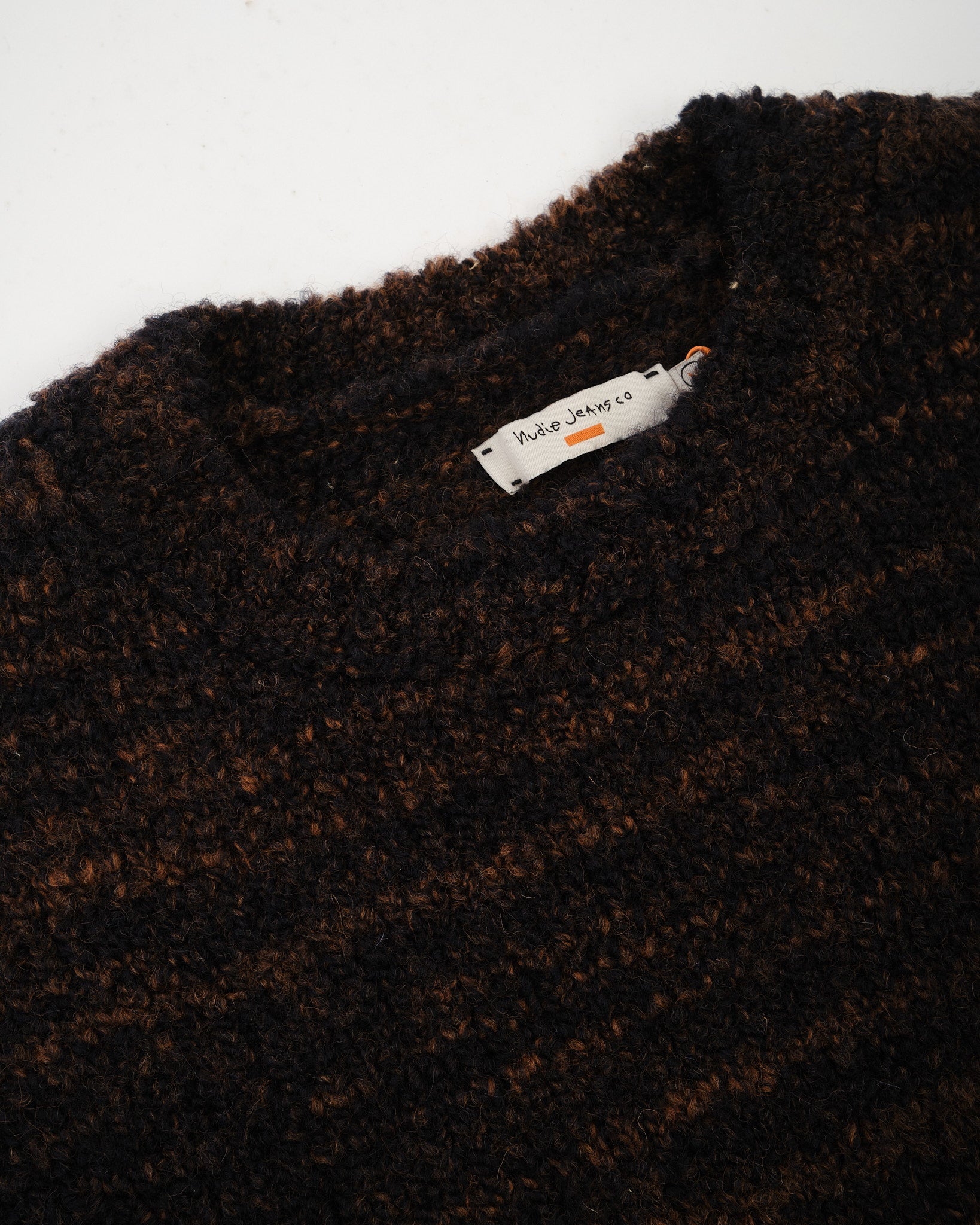 De NUDIE JEANS CO. GURRA BOUCLE TRUI MARINE/ORANJE is een lichtgewicht trui met ronde hals met een uniek getextureerde, wollige breisel. Gemaakt met onregelmatig, pluizig garen, het mengt diep marineblauw met roestoranje, waardoor een rijk gespikkeld bouclé-effect ontstaat dat diepte en karakter aan de stof toevoegt.