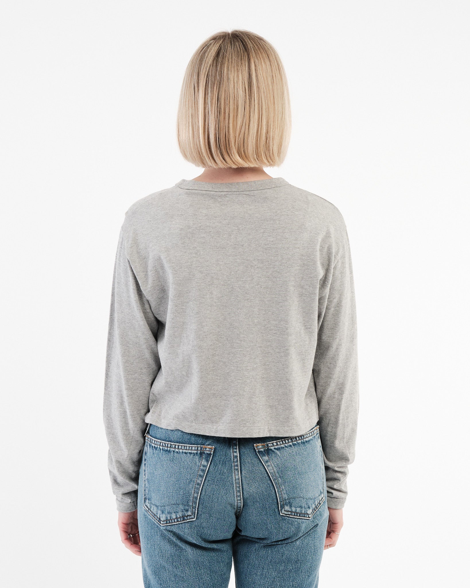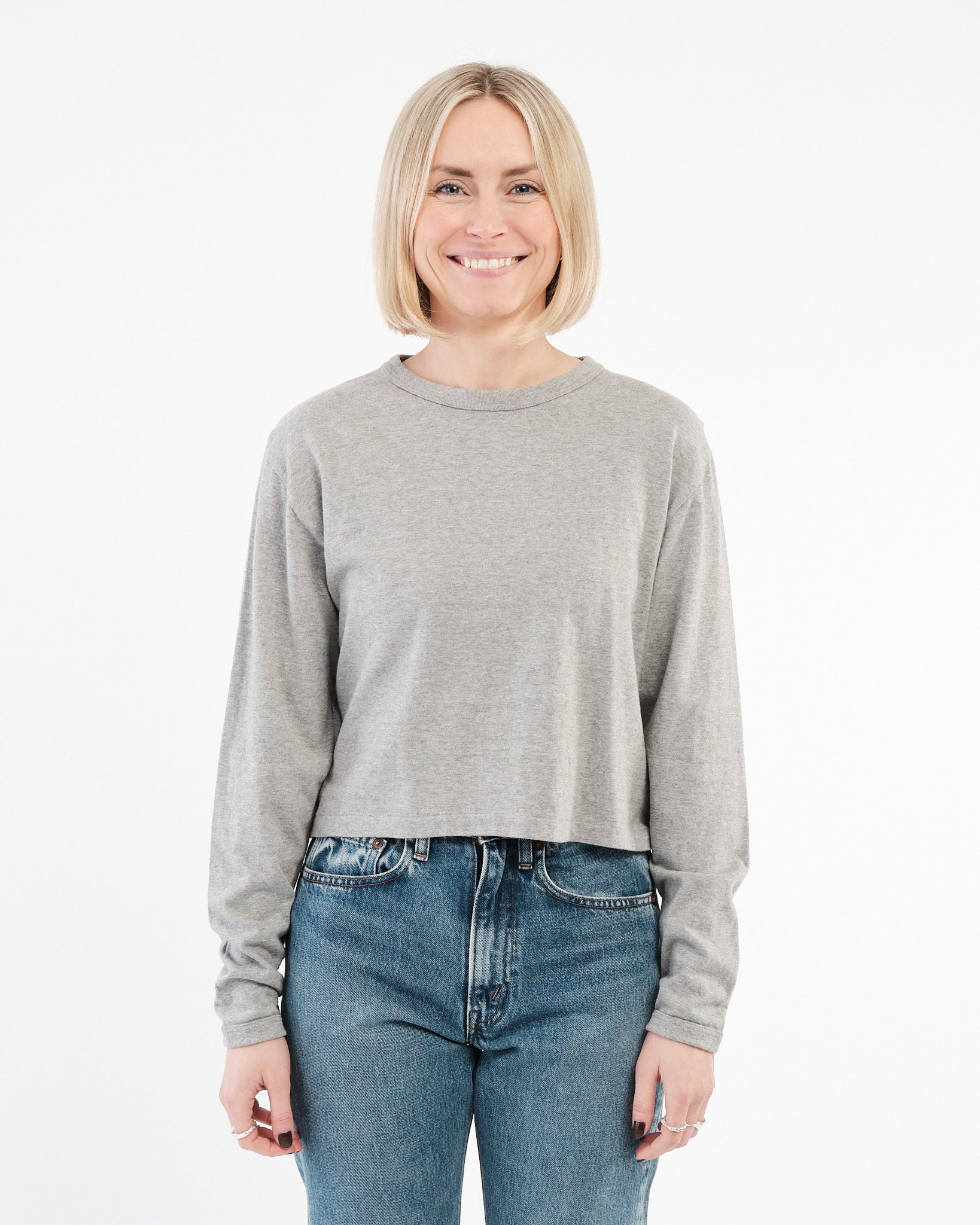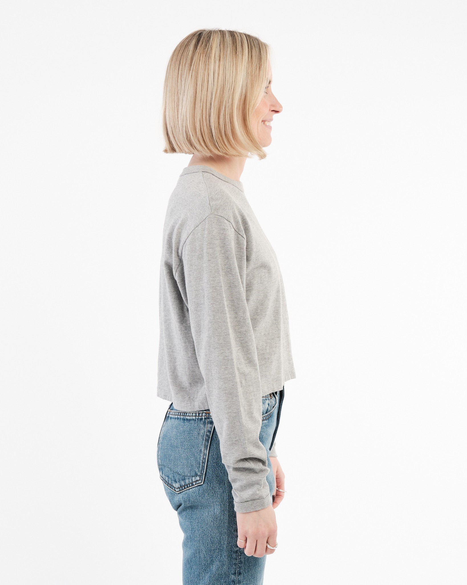 Hi'aka LS T-Shirt Off Hambledon Grey van Sunray Spirit. Sunray T-shirts hebben een traditionele pasvorm geïnspireerd door het gevoel van de jaren '50. Ontspannen, verkorte lengte met een normale pasvorm. De kraag, rib-ontwerp en stoffen zijn ook traditioneel. 260 g. Gemaakt in Japan. De Hi'aka LS is een versie met lange mouwen van het klassieke T-shirt, nieuw voor herfst/winter 2022.
