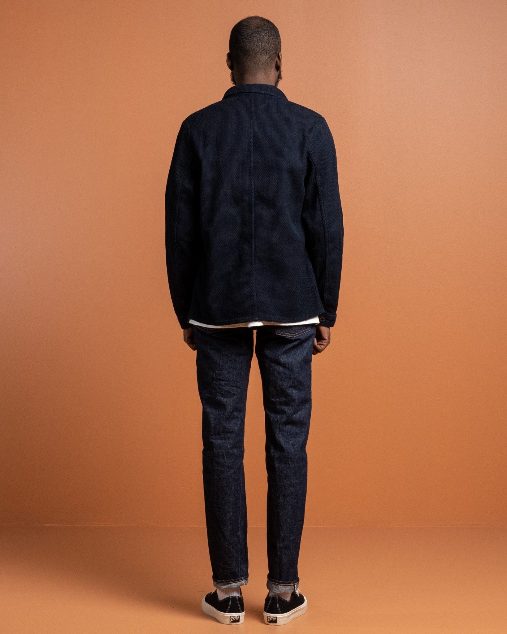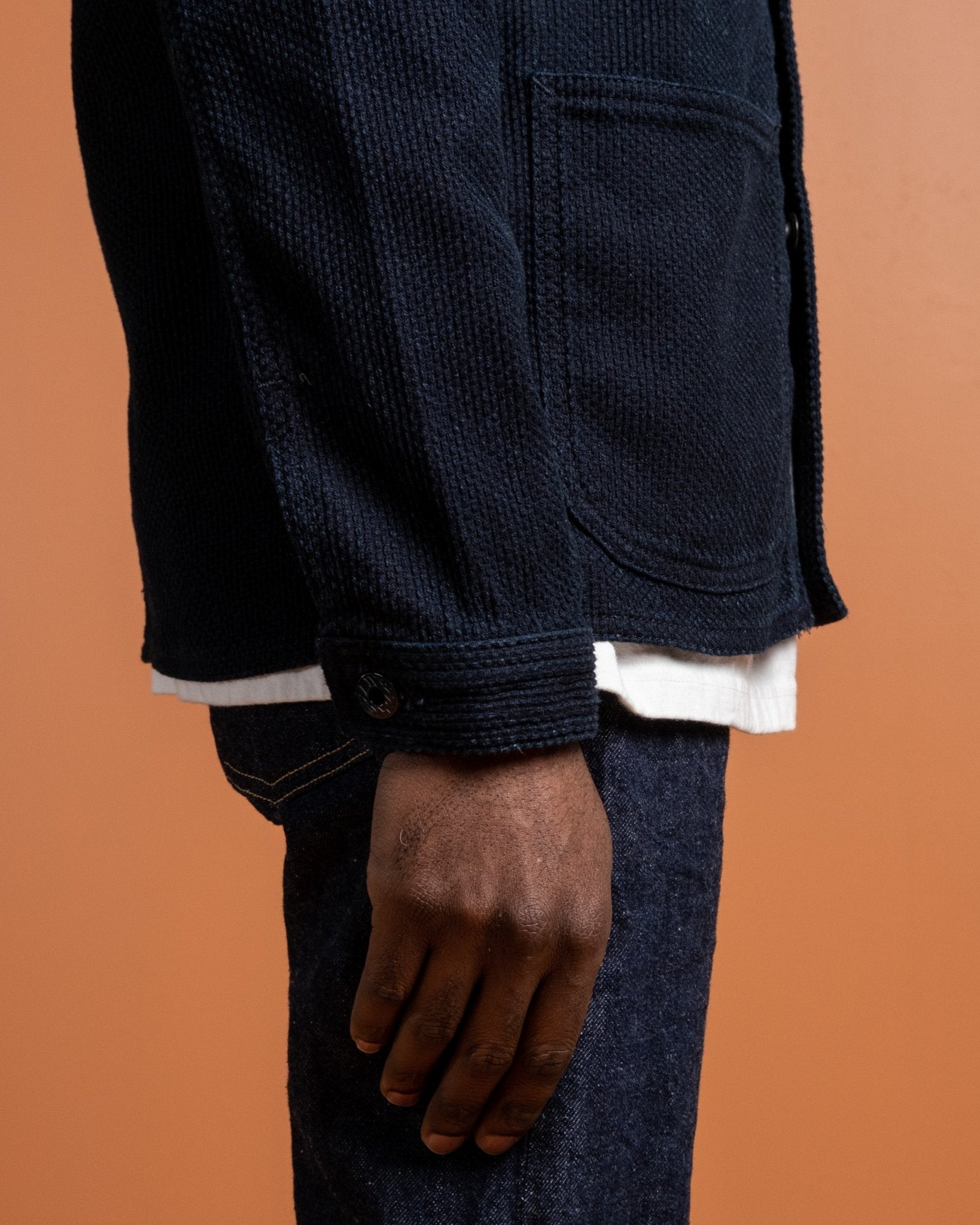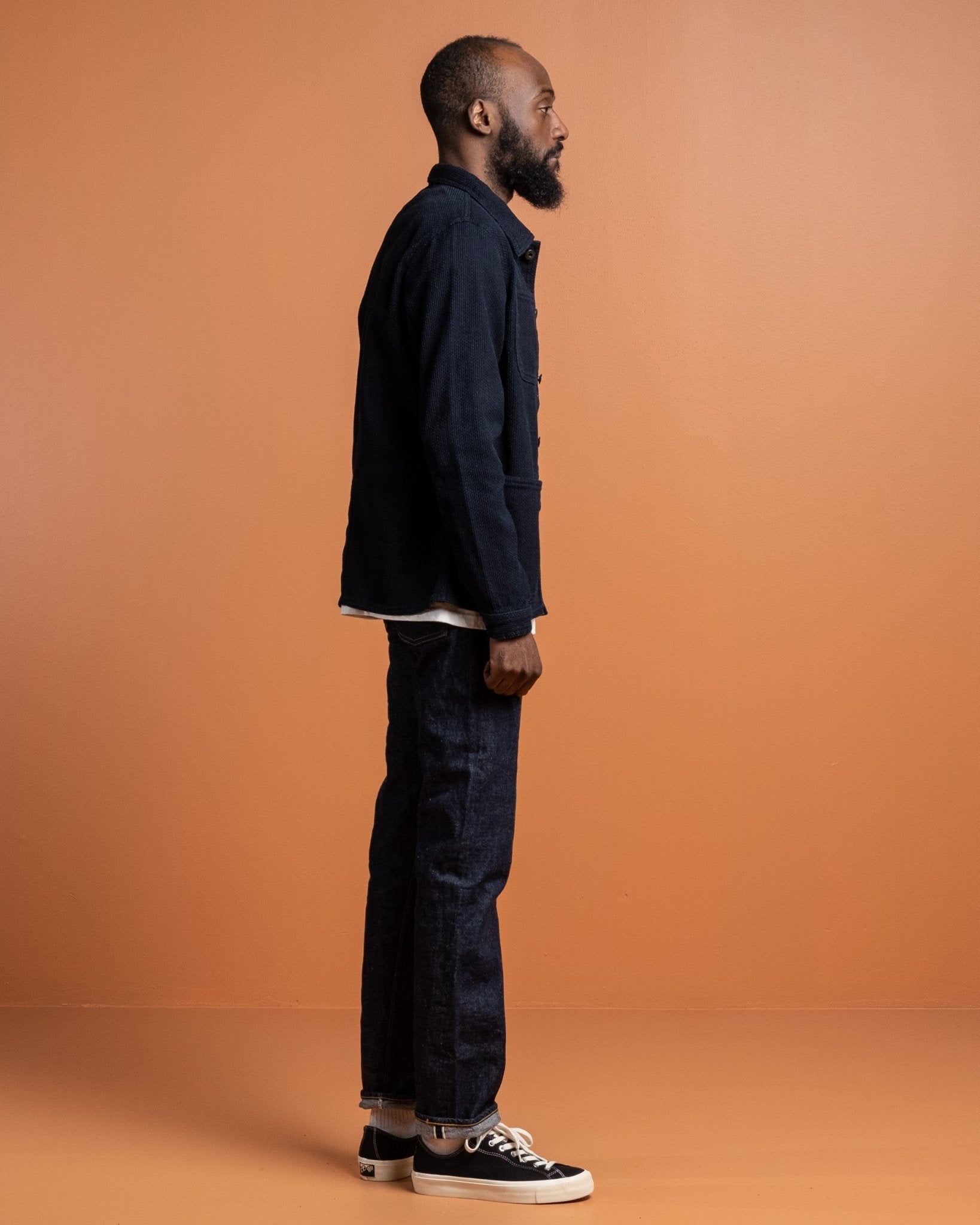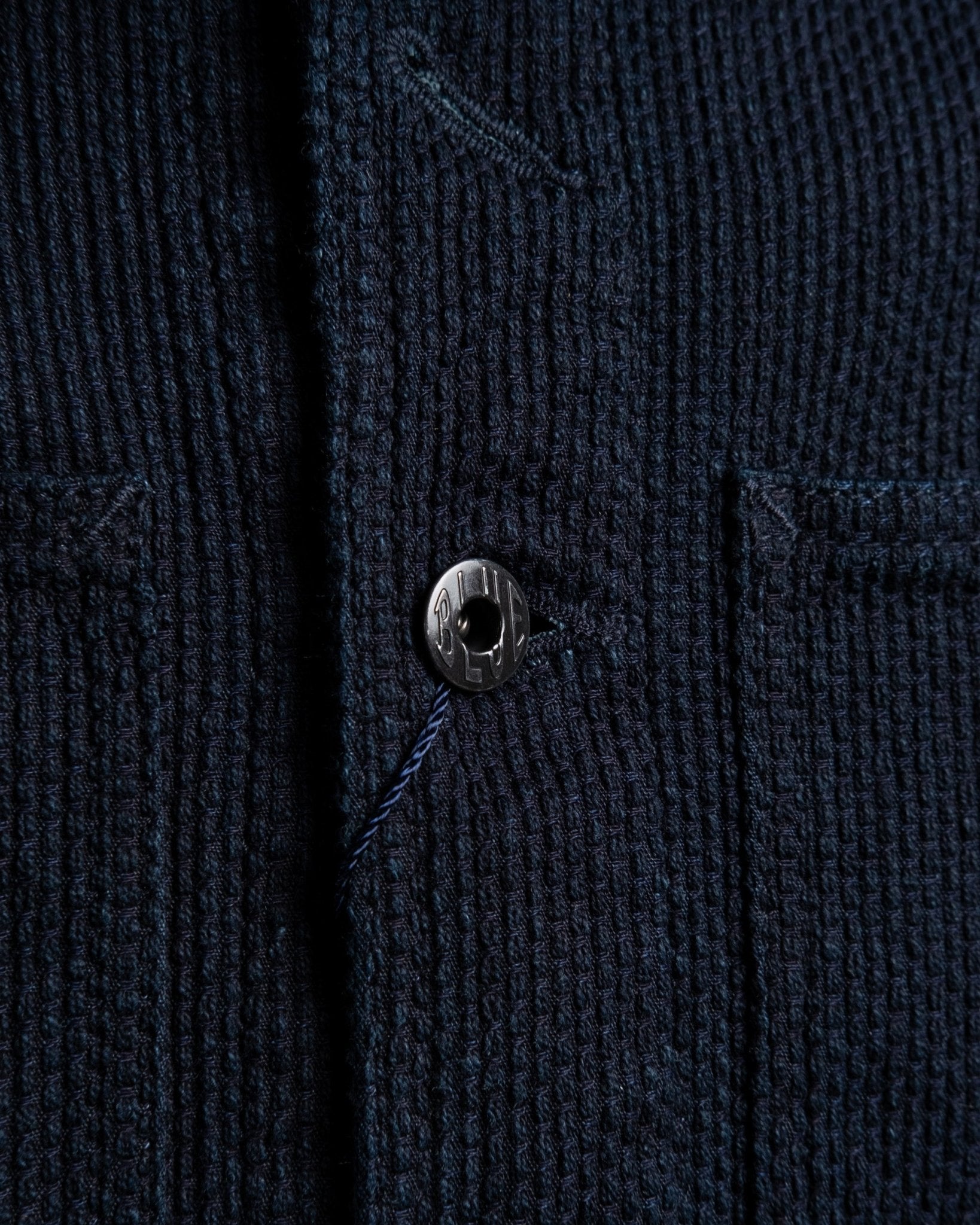 Sashiko Coverall Indigo van Japan Blue Jeans. Gemaakt van een 11 oz Japanse Sashiko stof van 100% katoen. Twee borstzakken, twee onderzakken en knoopsluiting. Aangepaste knopen, verstelbare manchetten en zoom. Gemaakt in Japan.
