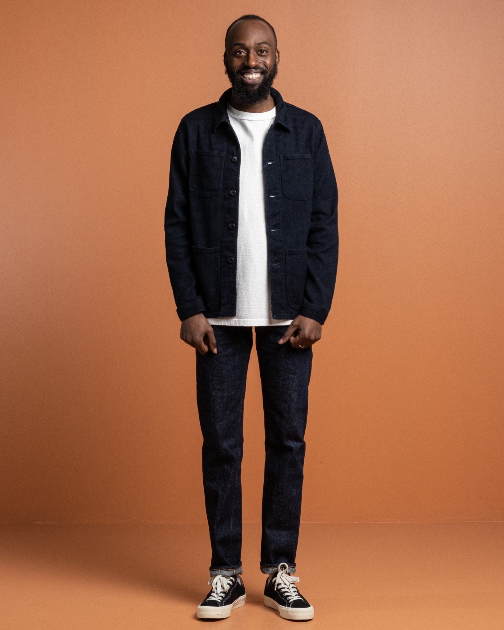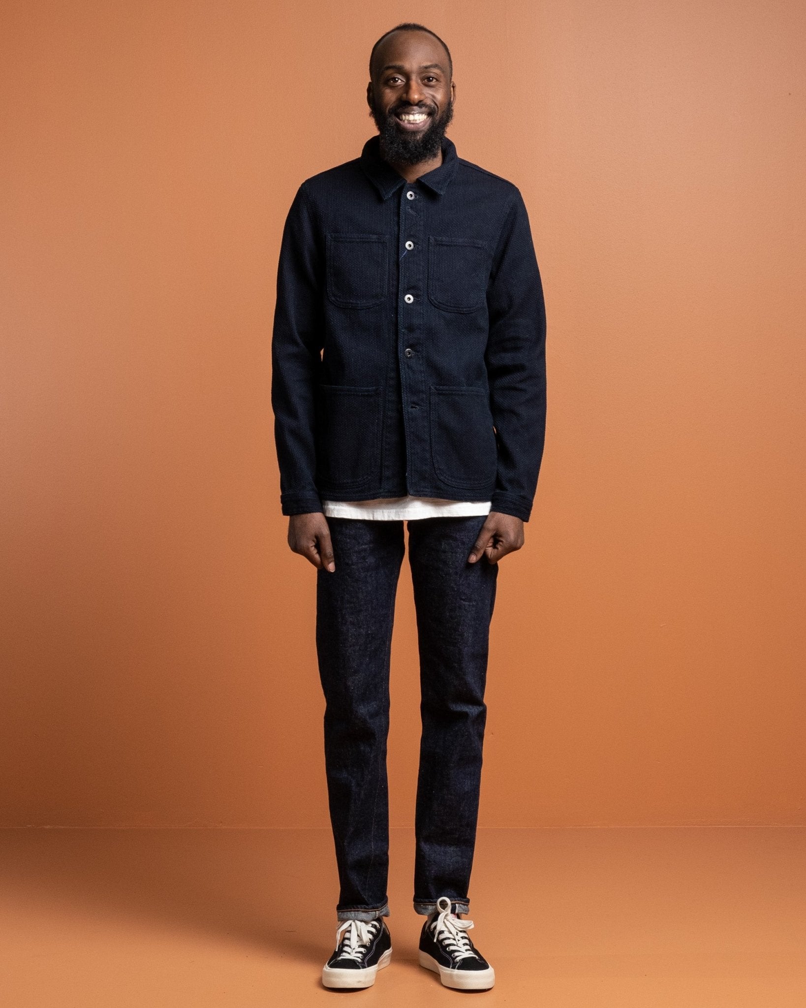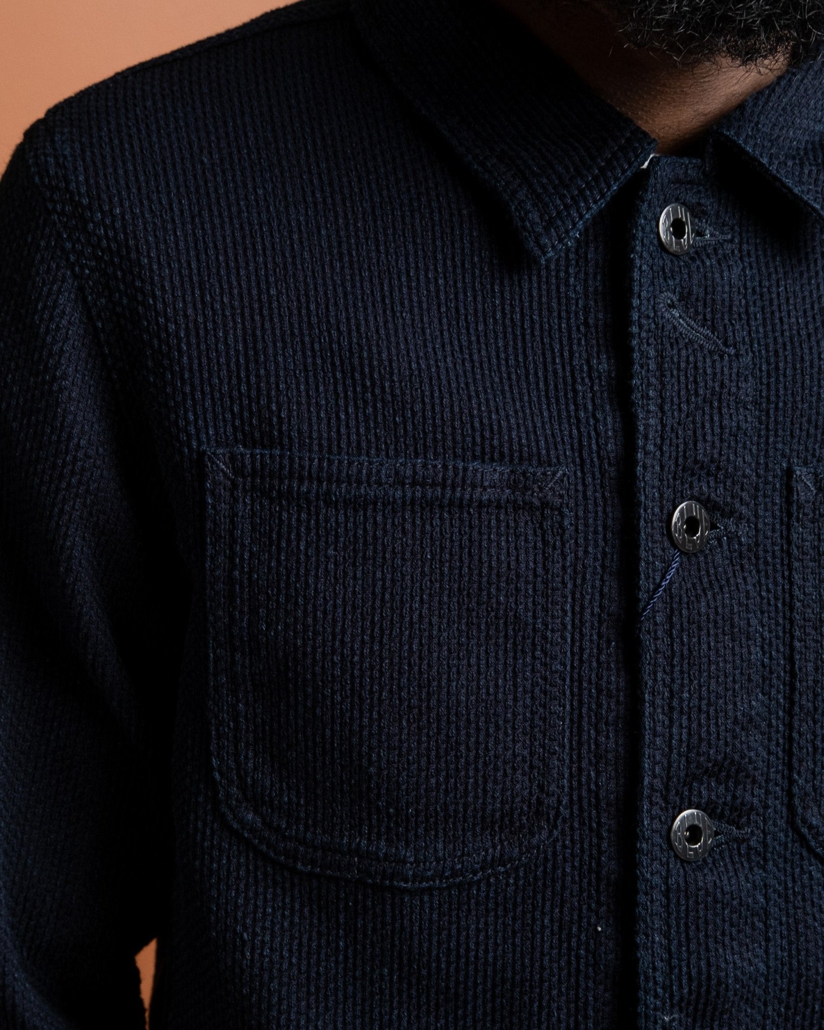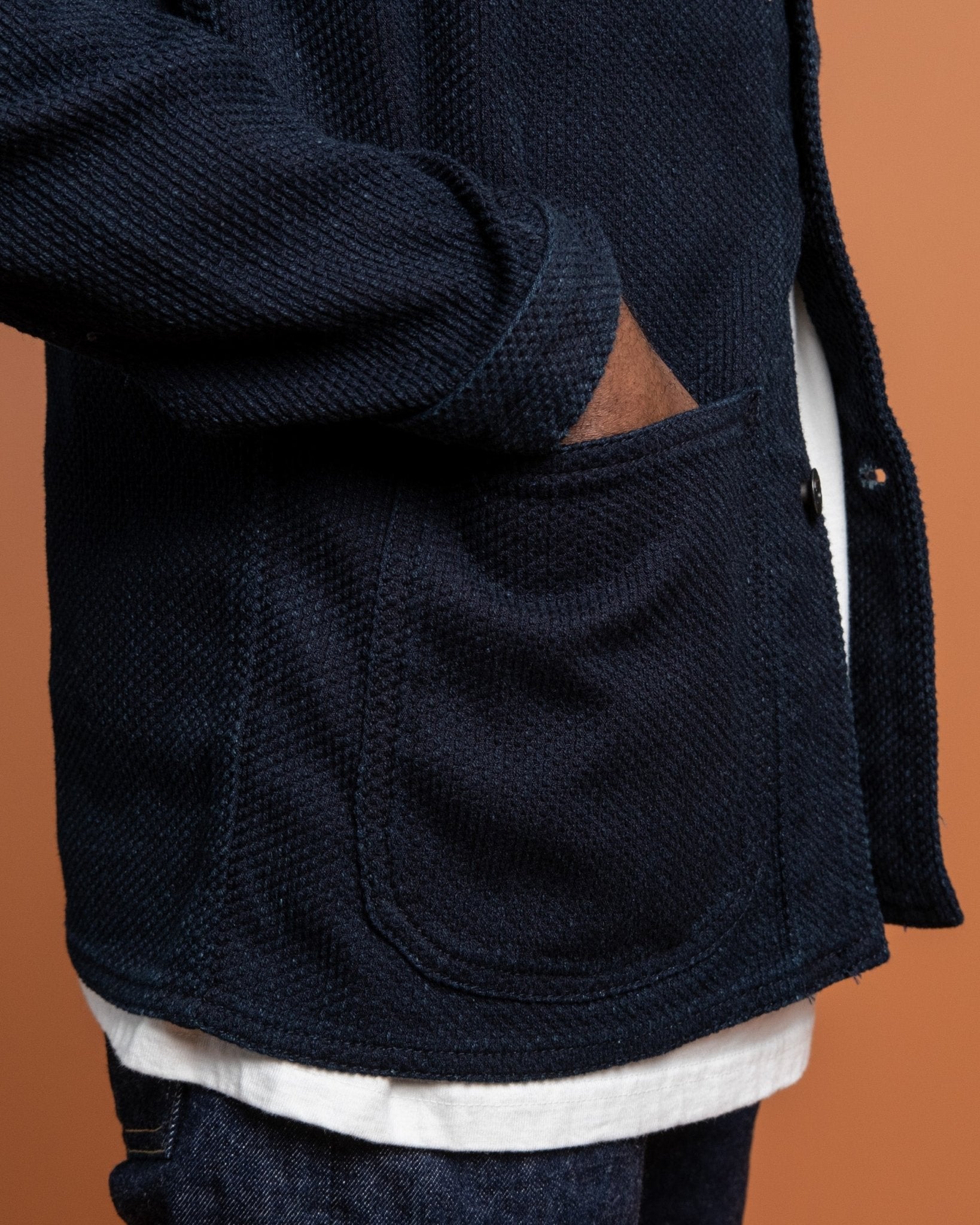 Sashiko Coverall Indigo van Japan Blue Jeans. Gemaakt van een 11 oz Japanse Sashiko stof van 100% katoen. Twee borstzakken, twee onderzakken en knoopsluiting. Aangepaste knopen, verstelbare manchetten en zoom. Gemaakt in Japan.