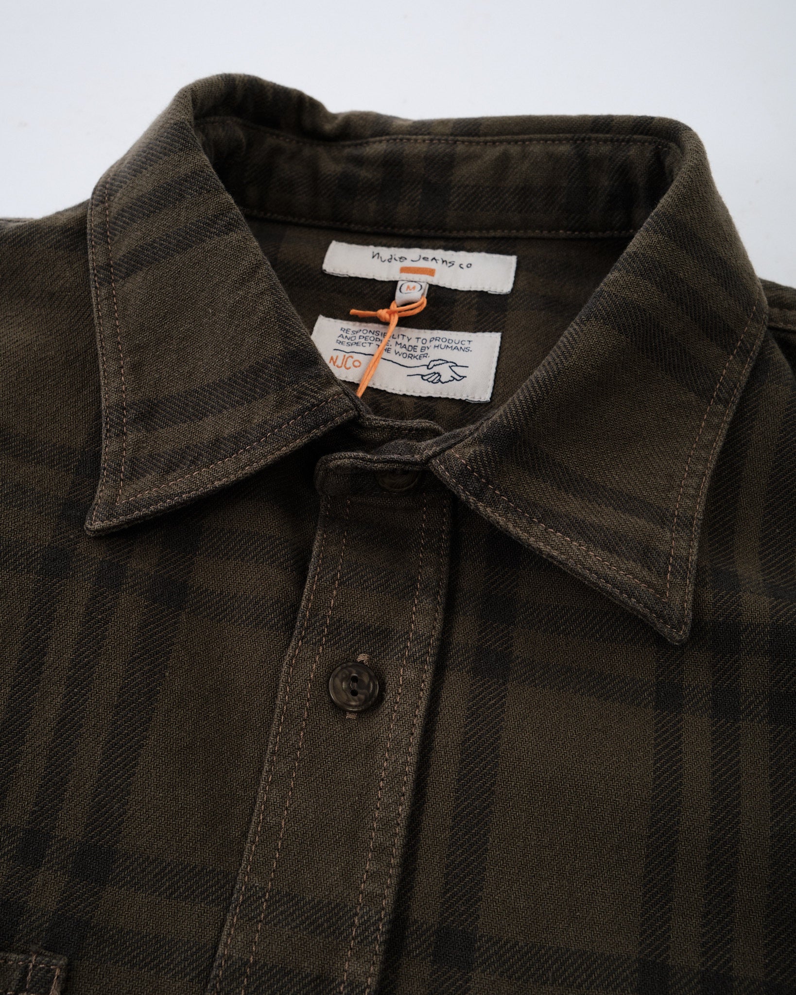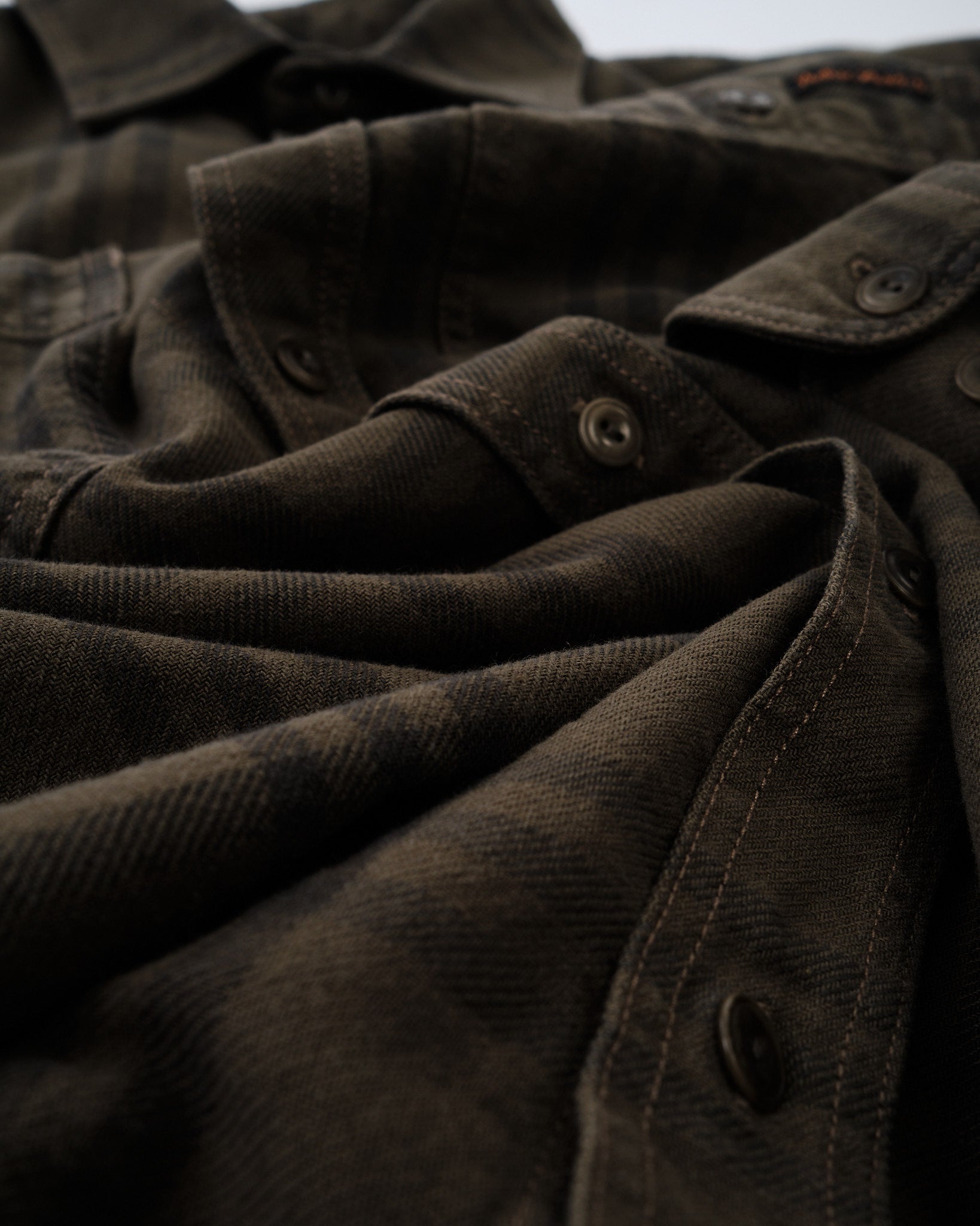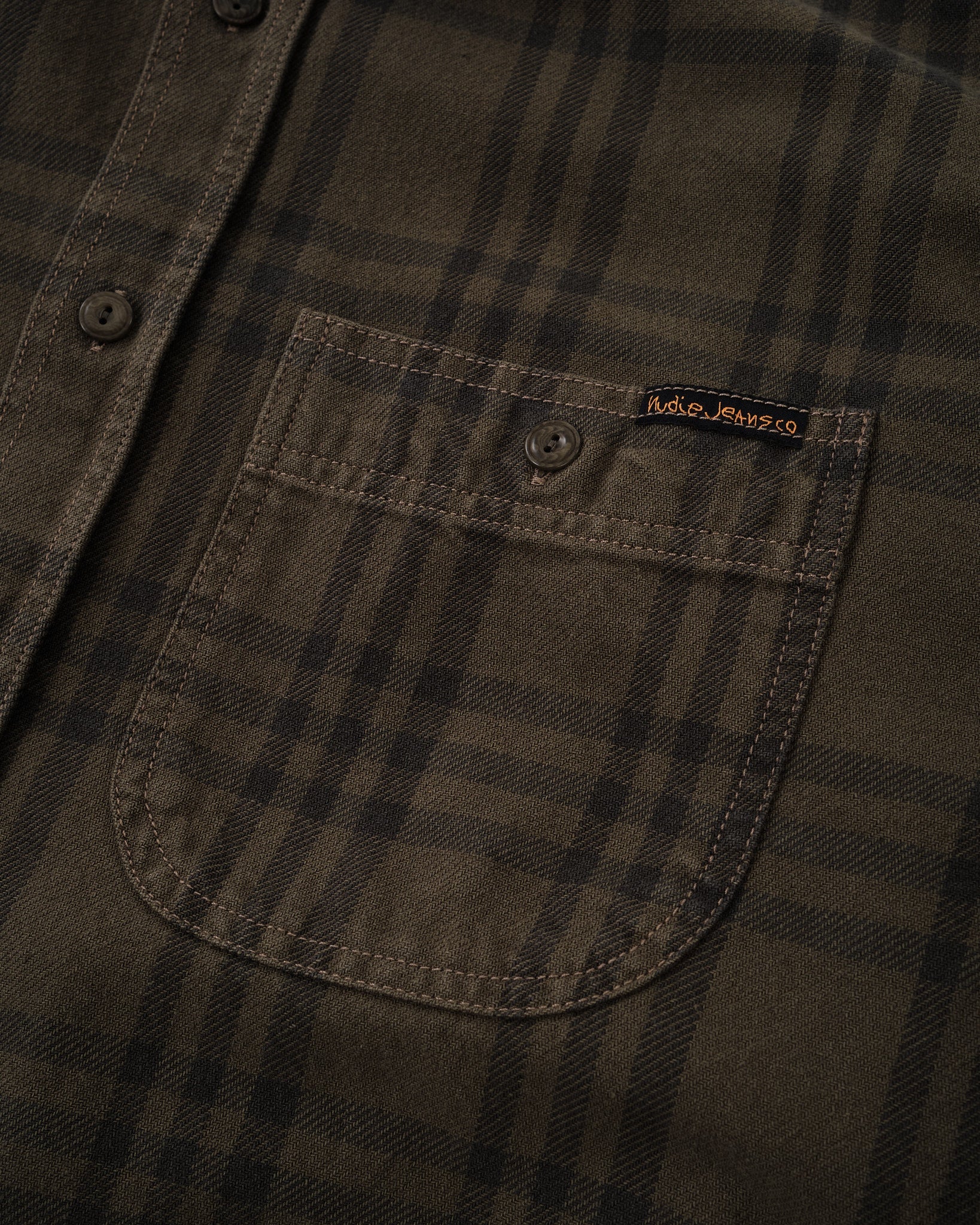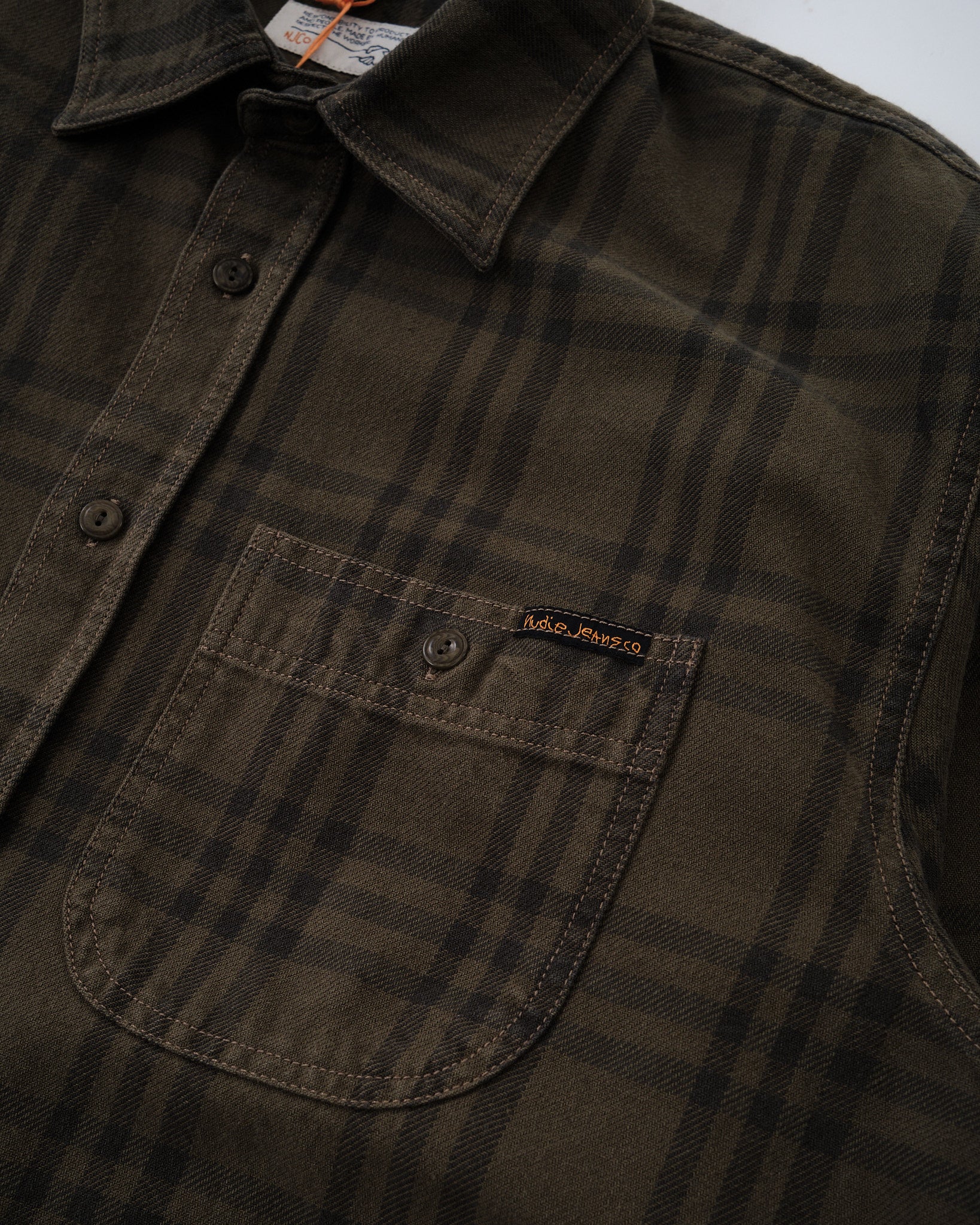 De NUDIE JEANS CO. JULIAN WORKER PLAID CHECK SHIRT OLIVE is een klassiek werkgeïnspireerd shirt met lange mouwen, vervaardigd uit stevig maar zacht biologisch katoenen twill. De stof heeft een aardse olijfgroene basis met een donkergroen ruitpatroon, wat zorgt voor een tijdloze en veelzijdige look.