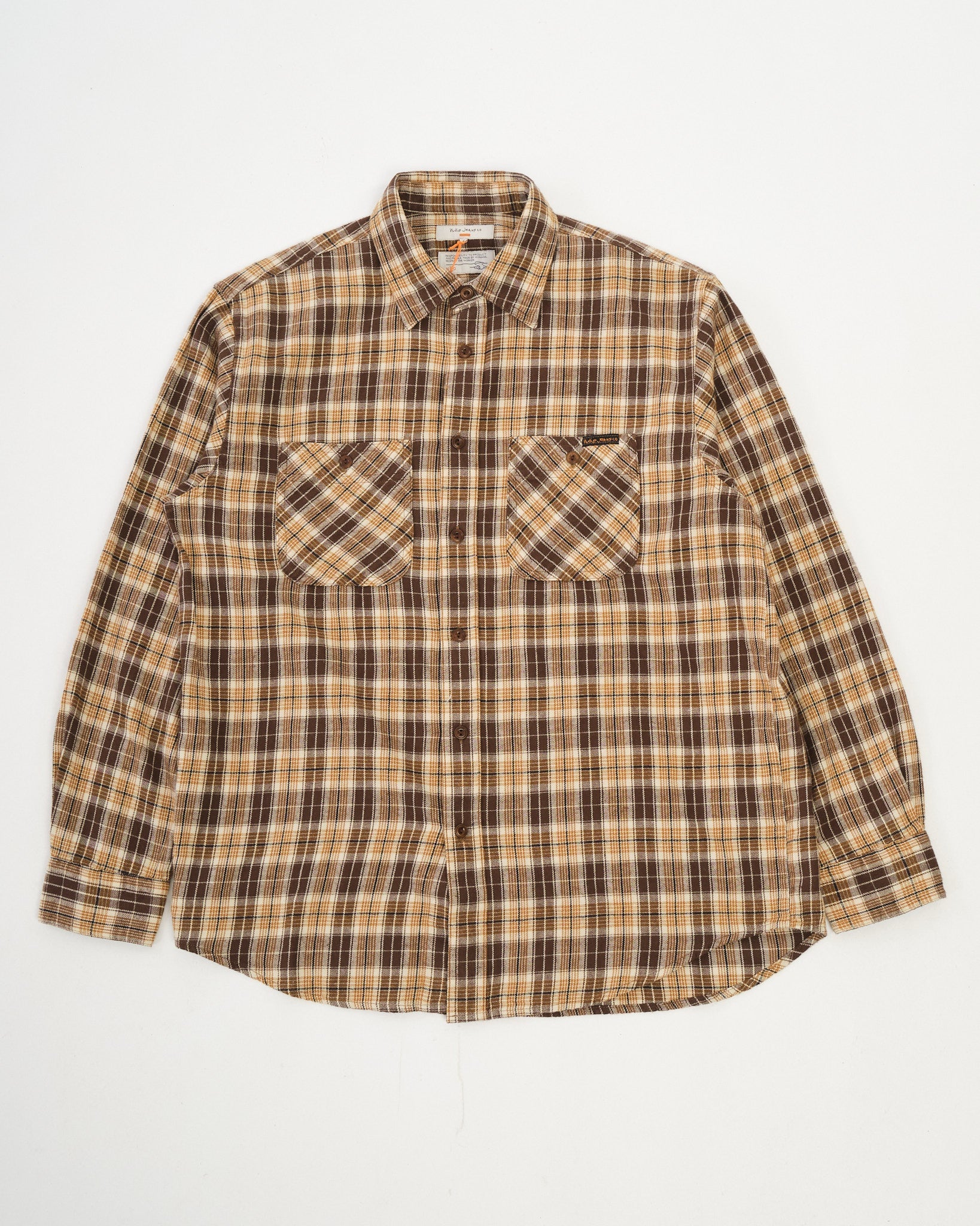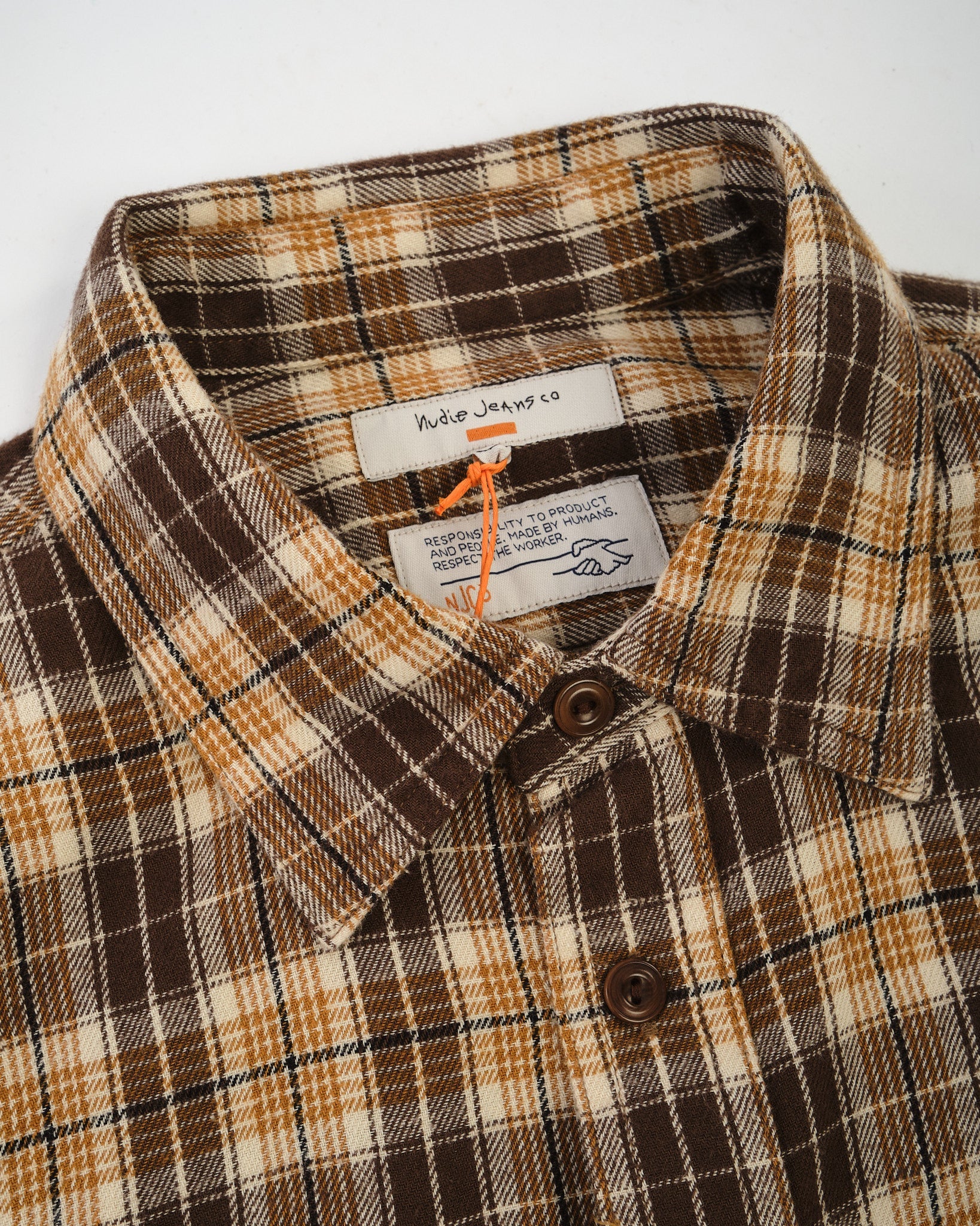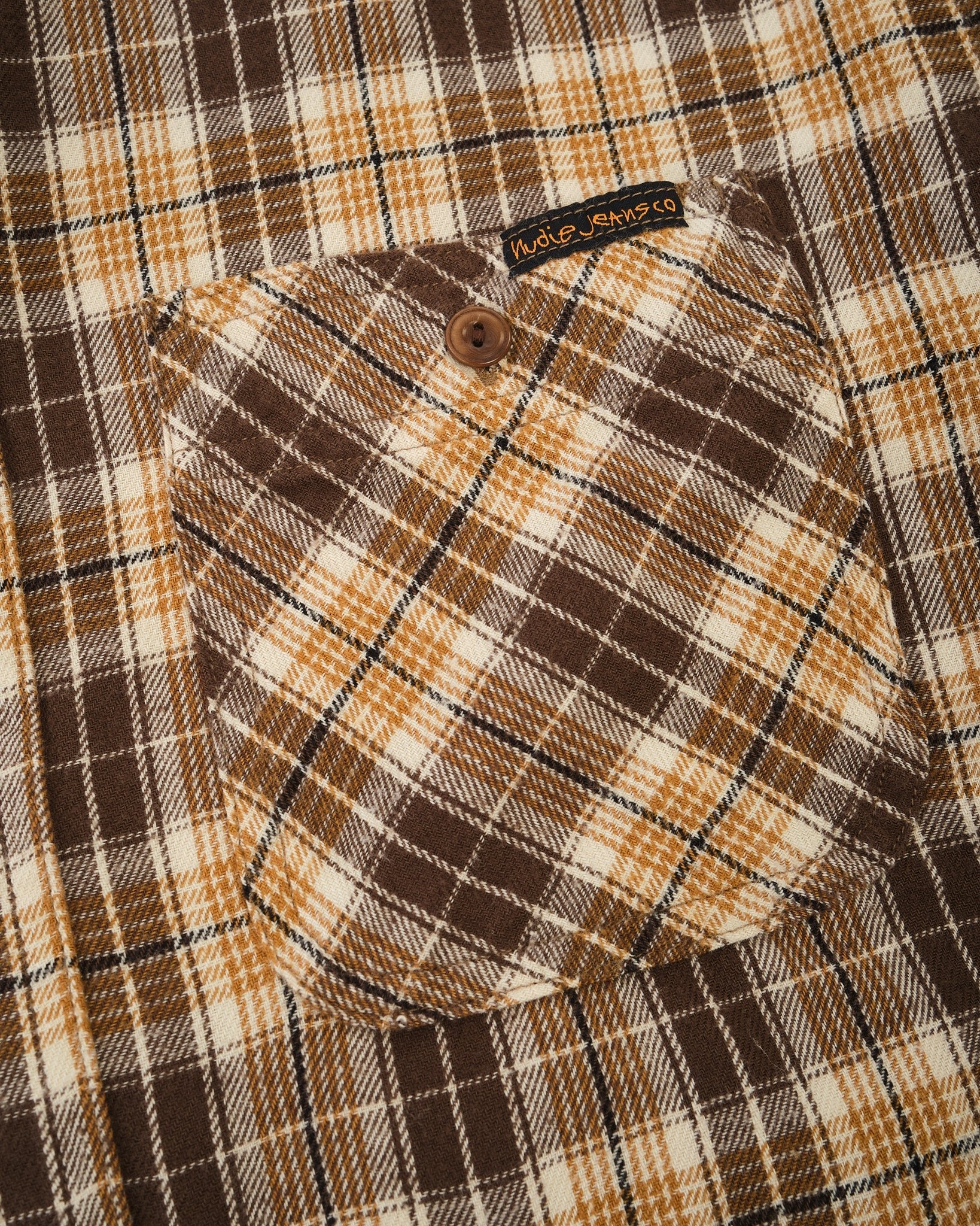 The Julian Worker Shirt in Check Brown is Nudie’s take on rugged utility, softened by a premium fabric blend. Made from organic cotton and European Flax® certified linen, it strikes the perfect balance between breathable comfort and structured feel. The check pattern adds vintage workwear charm, while corozo buttons give it a refined finish. With a regular fit and timeless styling, Julian is a reliable layering piece that’s built for both weekday tasks and weekend ease.