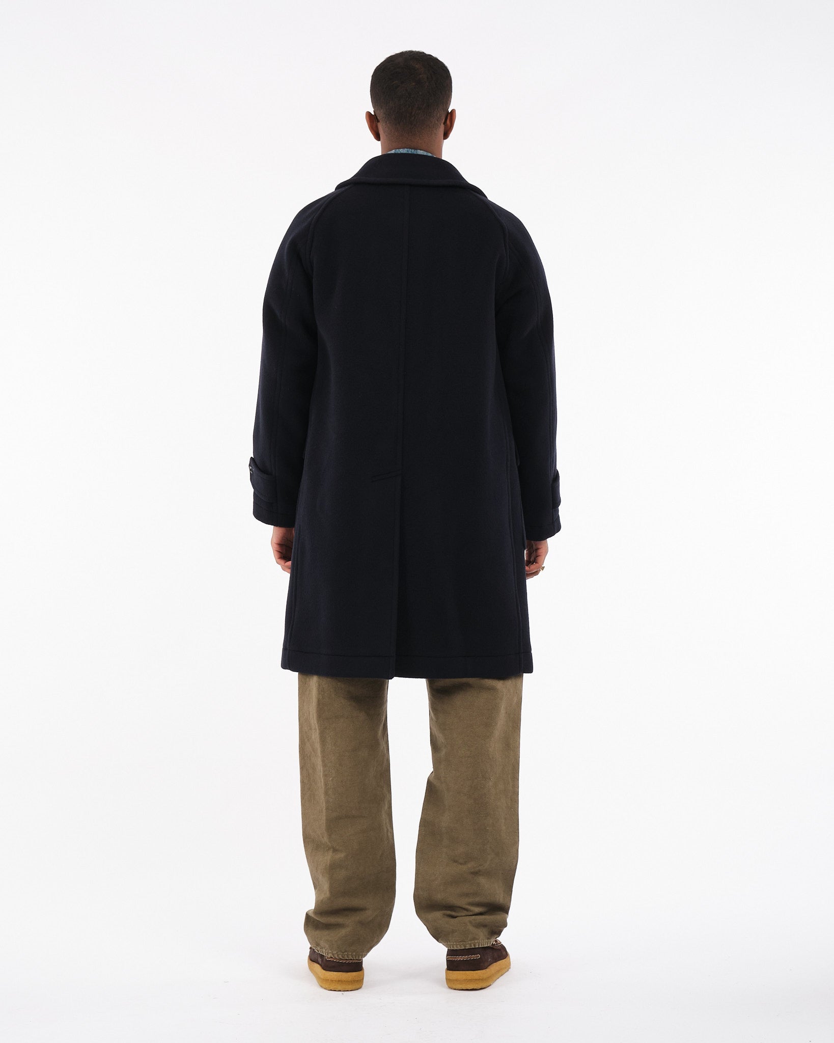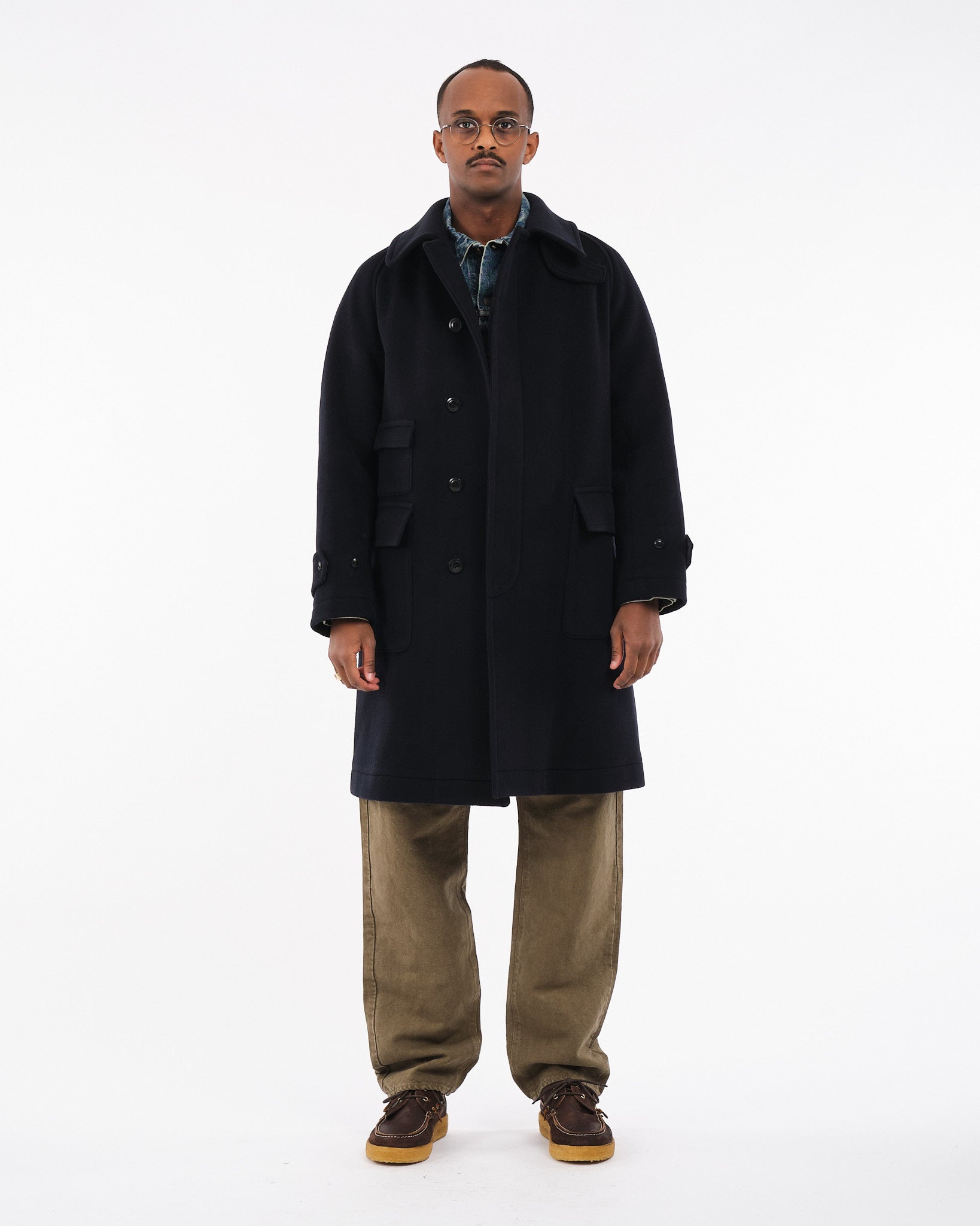 De KAPTAIN SUNSHINE Traveller Coat (KS25FCO03) in Navy is de perfecte combinatie van luxe en functionaliteit. Gemaakt van een omgekeerde dubbele doek melton, is deze jas geweven met ultrafijne 16,5 micron Super140's wolvezels, wat zorgt voor de ideale balans van stevigheid en lichtheid. De stof is geverfd met katoen om een rijke, diepe kleur te bereiken, terwijl het dichte weven ervoor zorgt dat de jas zacht, glanzend en elegant soepel blijft.