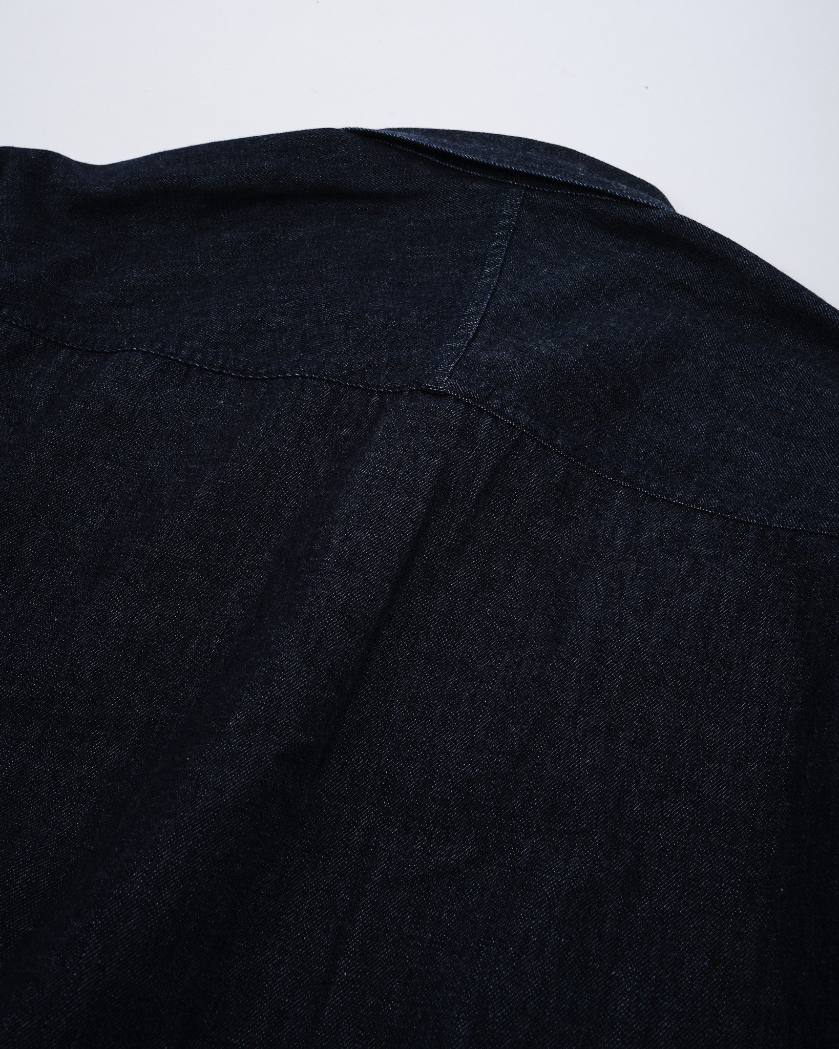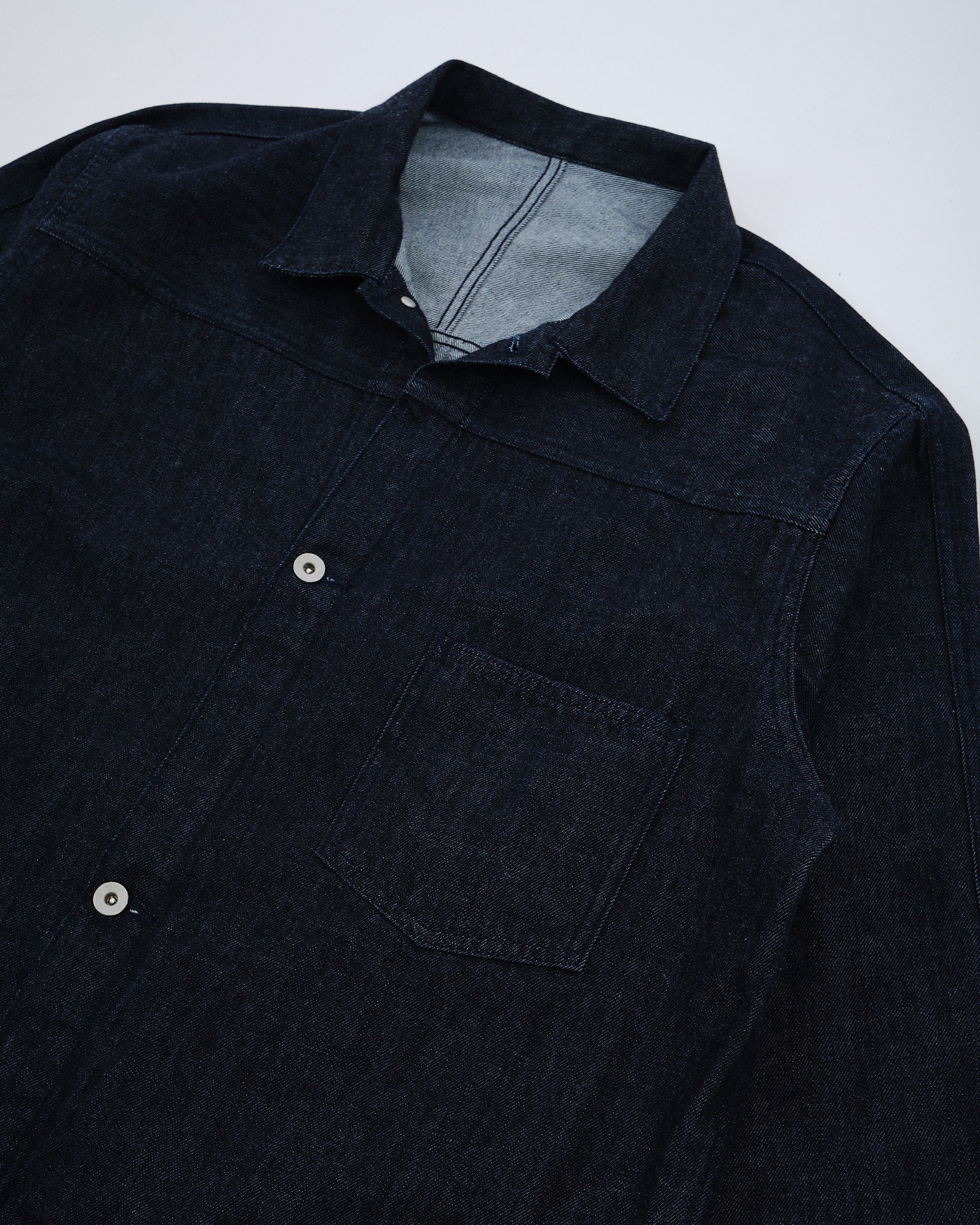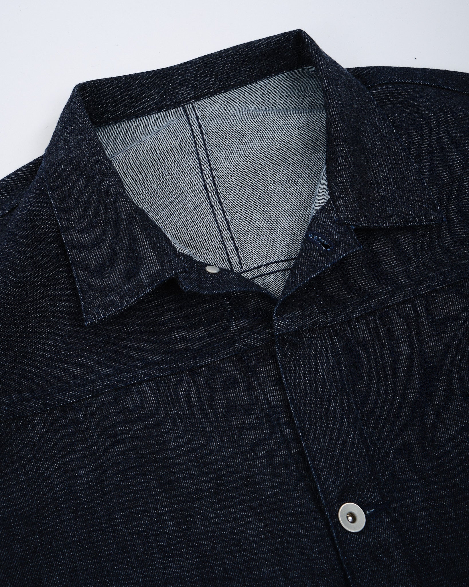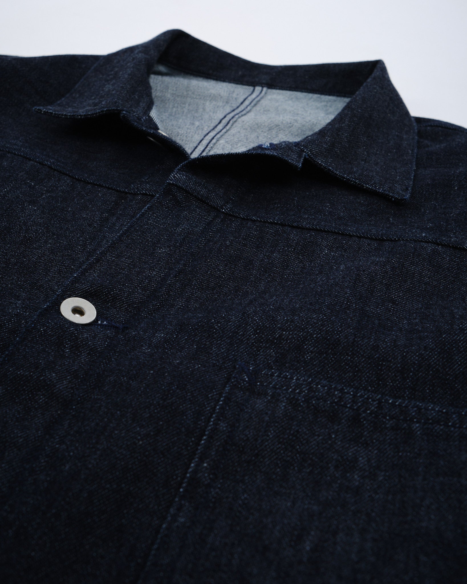 Geïnspireerd door denim jassen uit de jaren 40 met een vereenvoudigd, oorlogstijd ontwerp.
