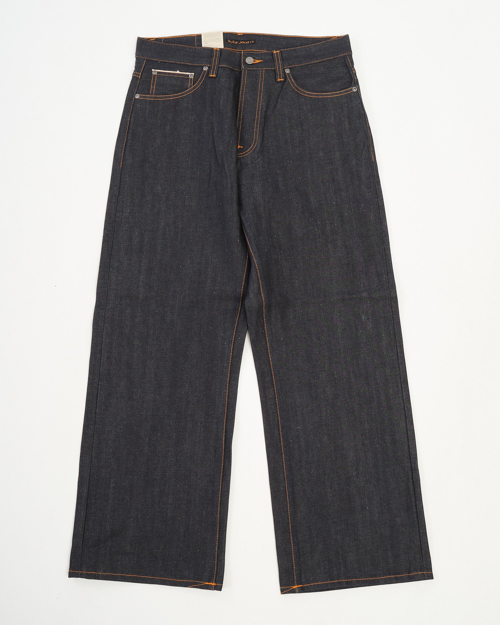 The Loud Larry in Dry Selvage is Nudie Jeans Co’s boldest silhouette, cut from 13.75 oz organic Japanese selvage denim from Kaihara. This rigid denim has a greencast tone that promises a distinct fade with wear, enhanced by classic orange stitching and antique silver trims. A high waist and dramatically wide legs offer a loose, vintage-inspired fit that’s both statement-making and steeped in denim tradition. Finished with a jacron patch and button fly, Loud Larry is made for those who want their jeans loud and proud.