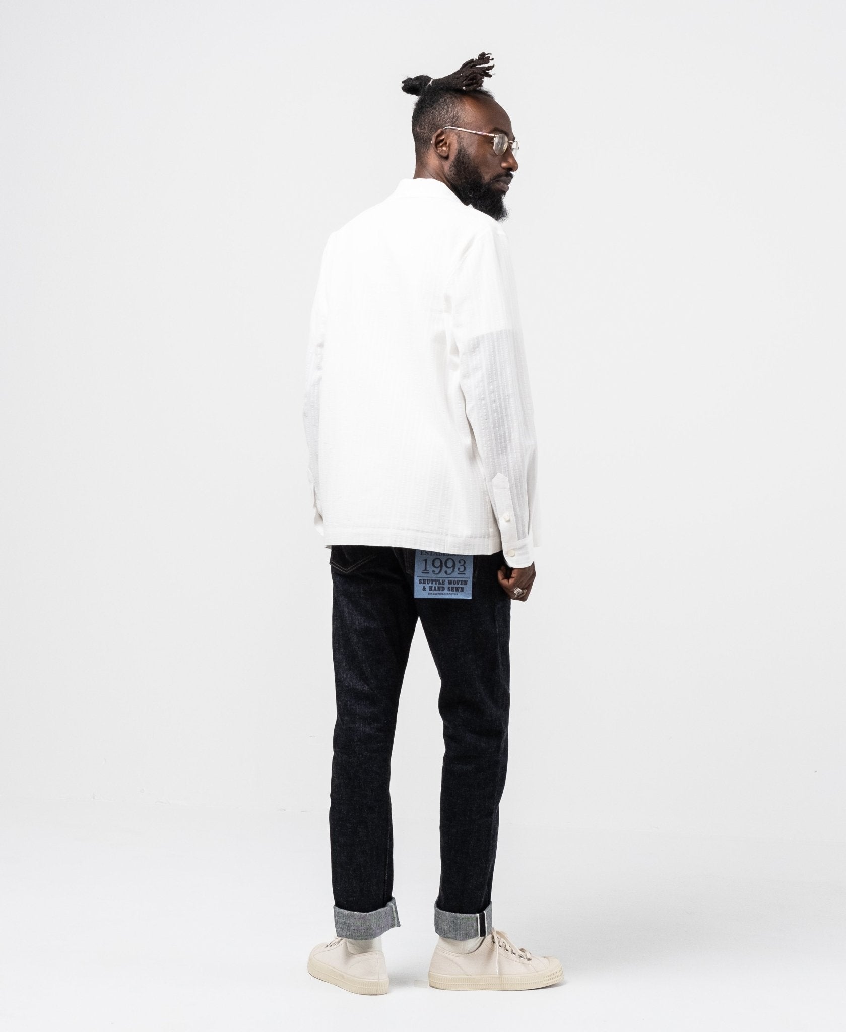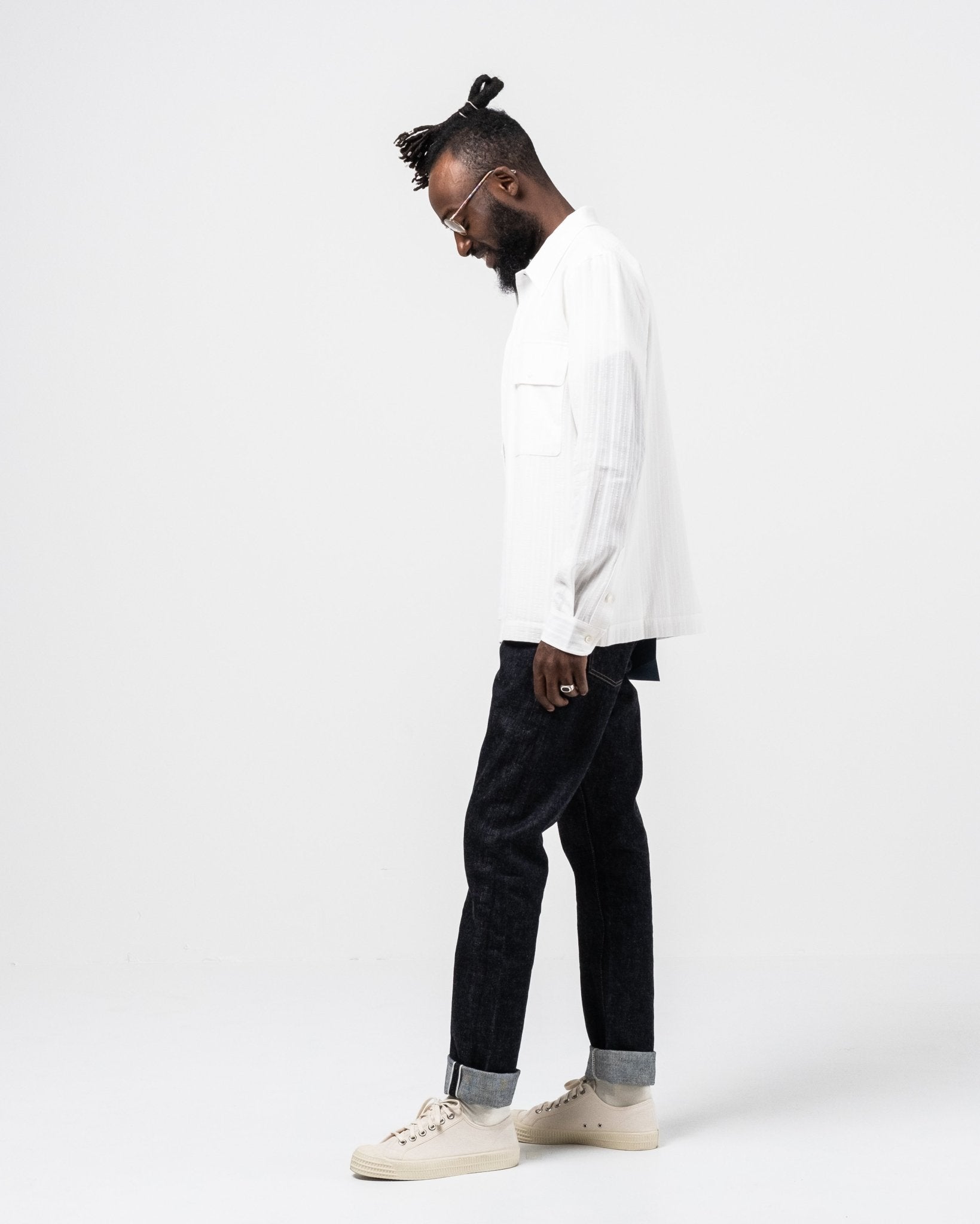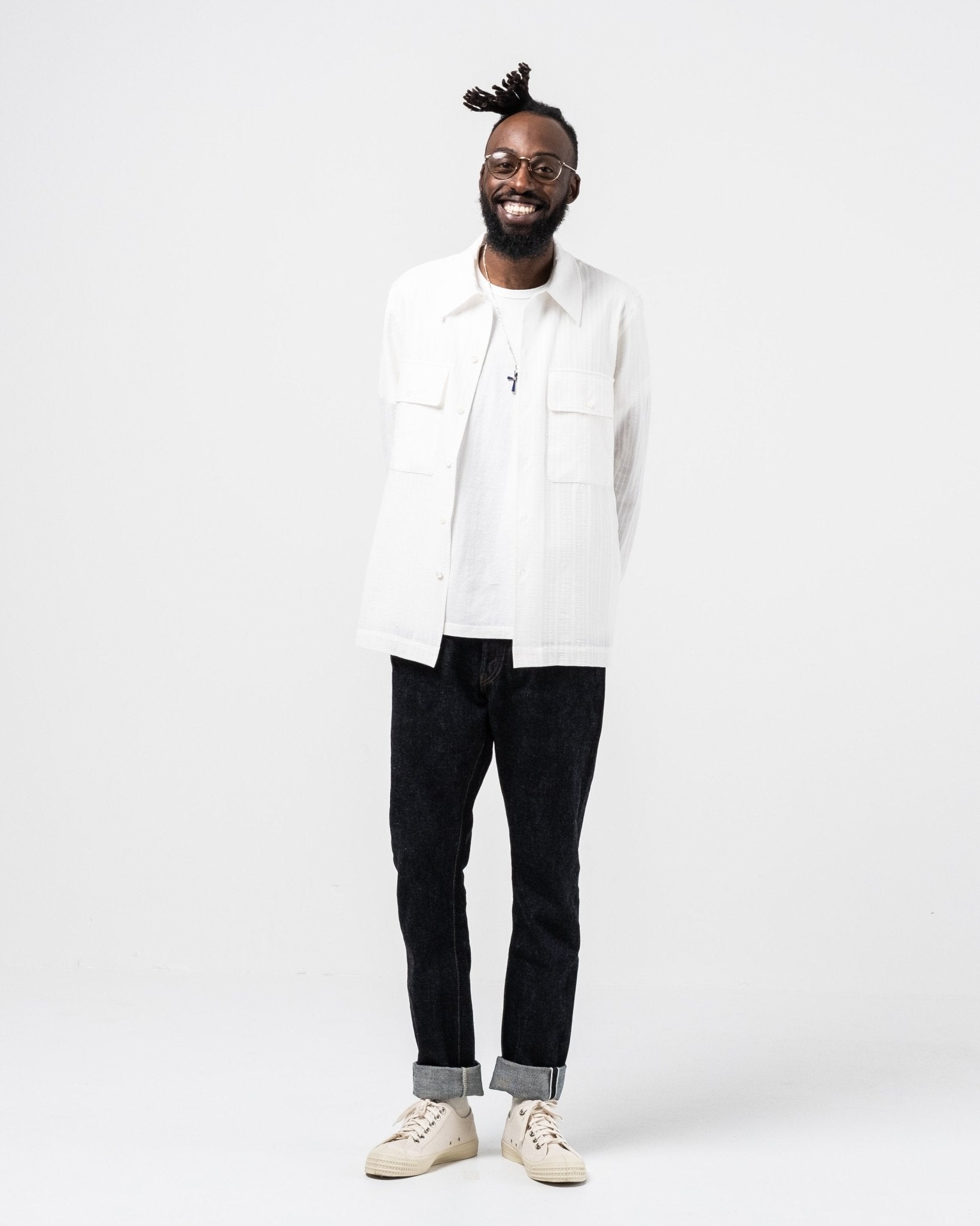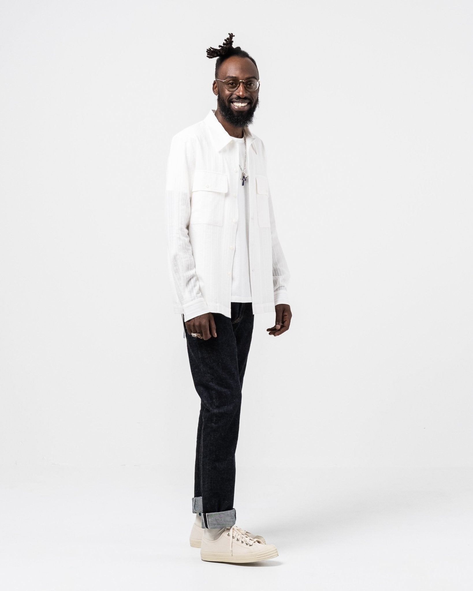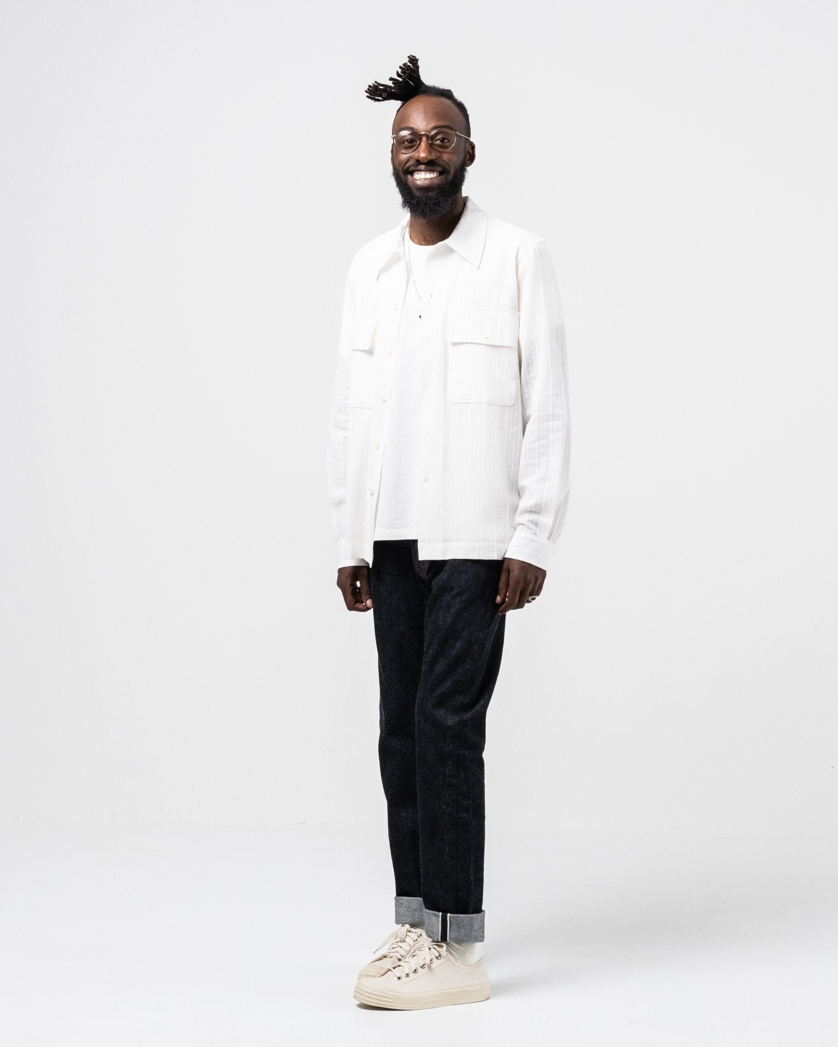 Lukey Shirt Formal White van Séfr. Militair geïnspireerd overhemd met twee borstzakken, brede kraag en parelmoeren knopen. Licht en comfortabel stof in 69% katoen, 25% linnen en 6% polyamide. Gemaakt in Letland.