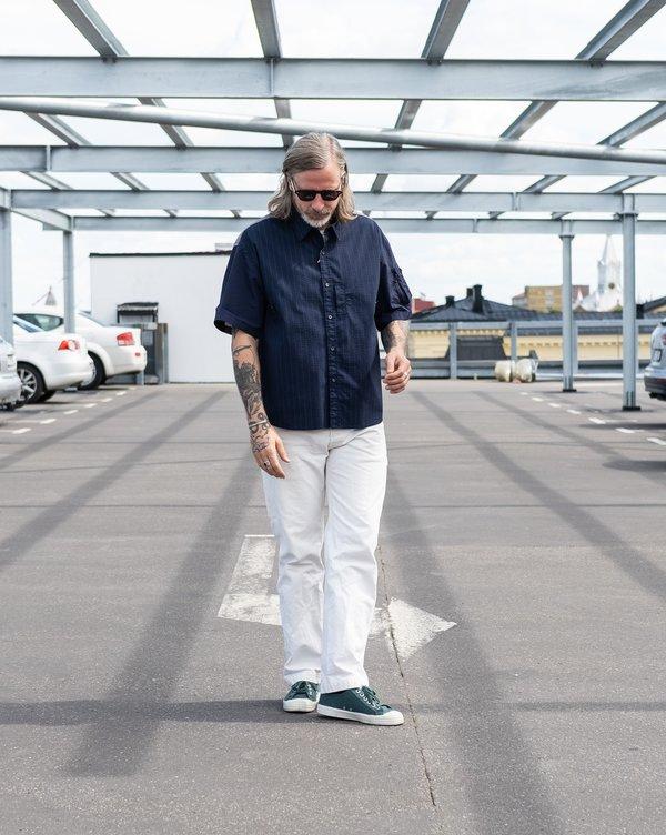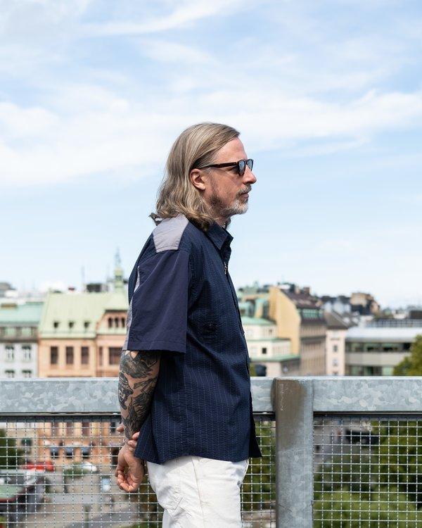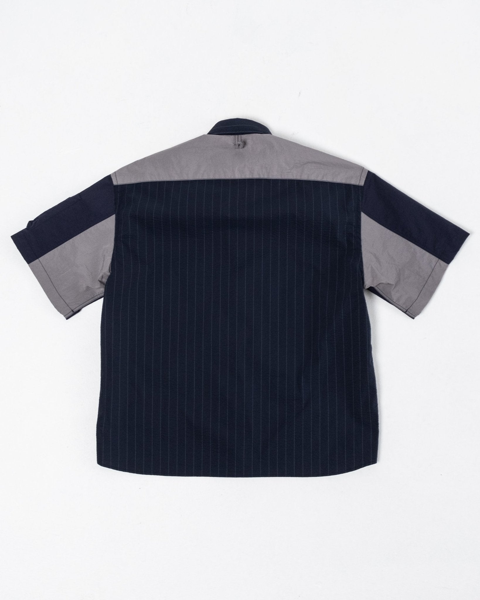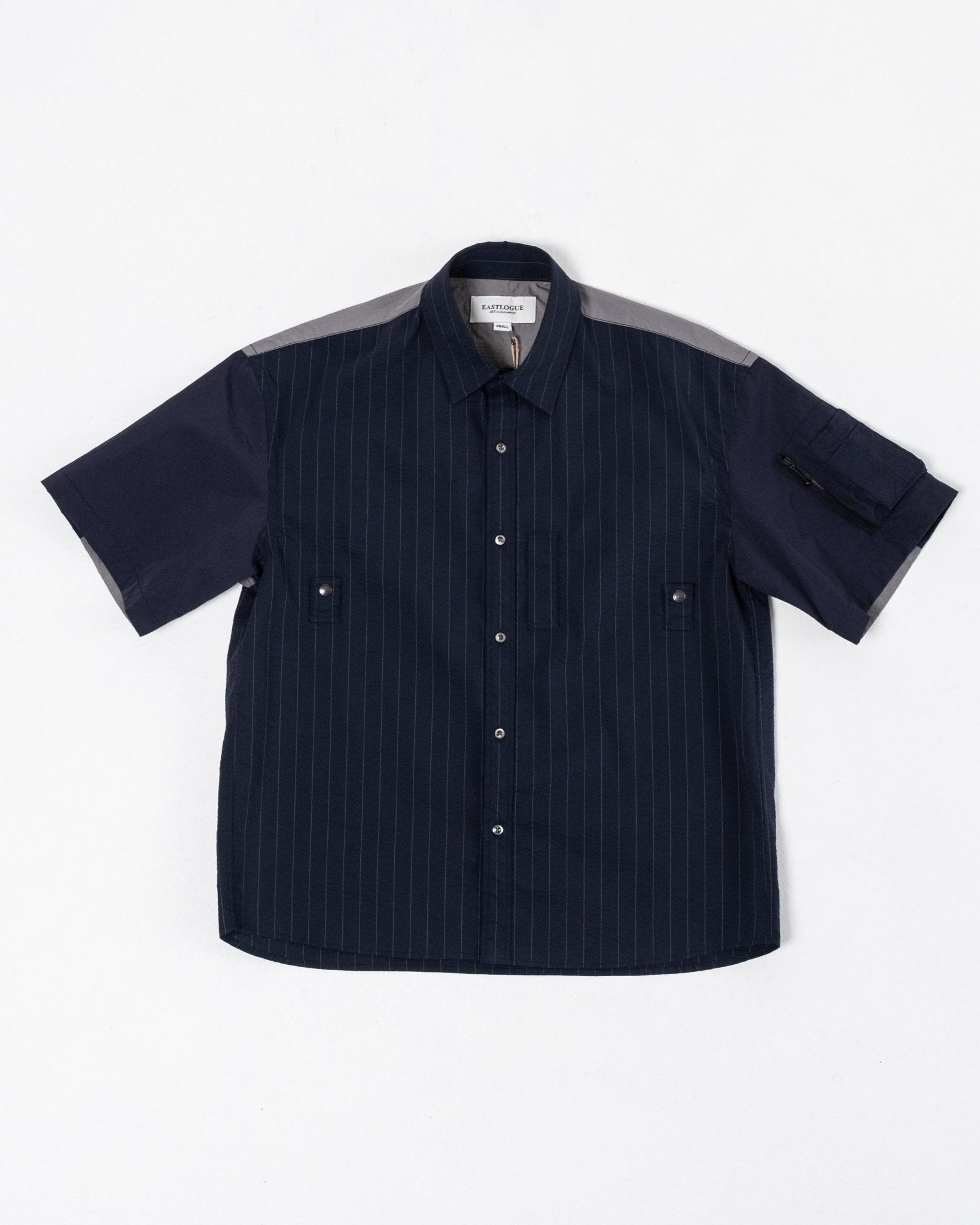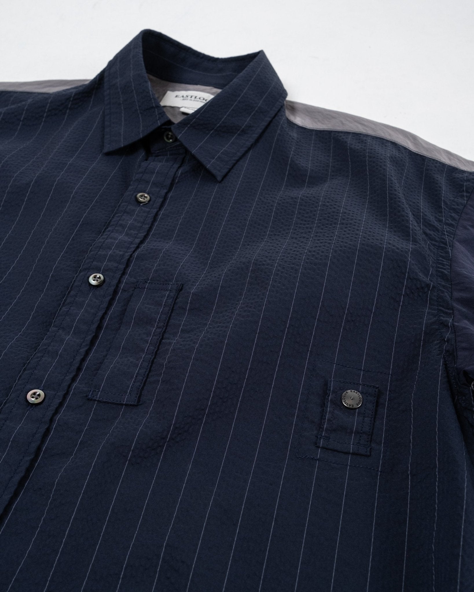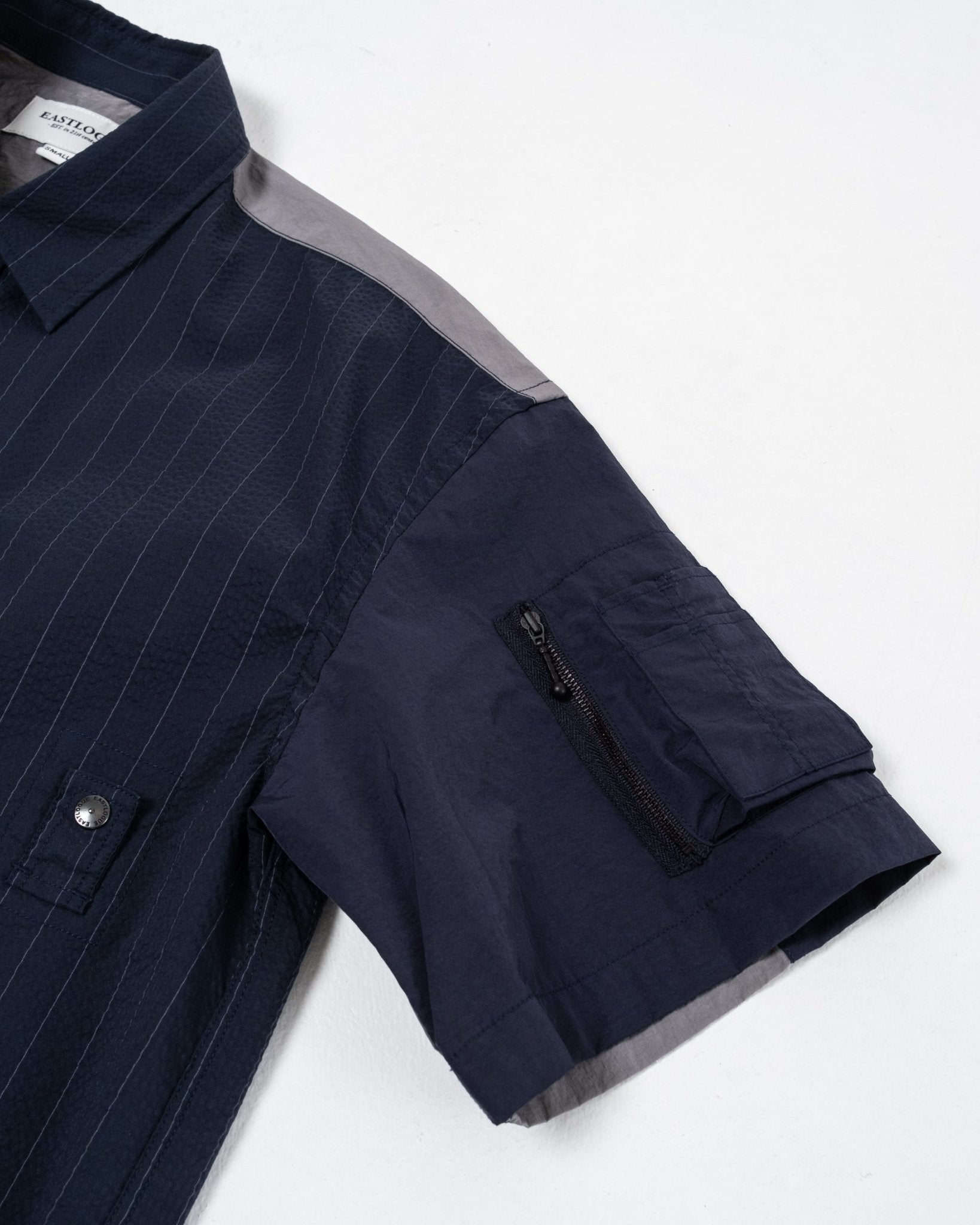 MA-1 Half Shirt Navy Seersucker van Eastlogue. Korte mouwen shirt van 67% katoen en 23% polyester. Sluiting met knopen aan de voorkant en een zak op de mouw. Gemaakt in Zuid-Korea.