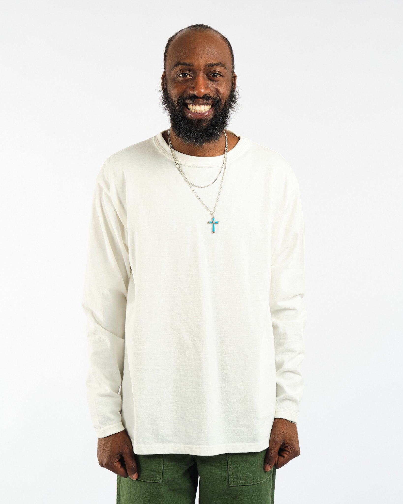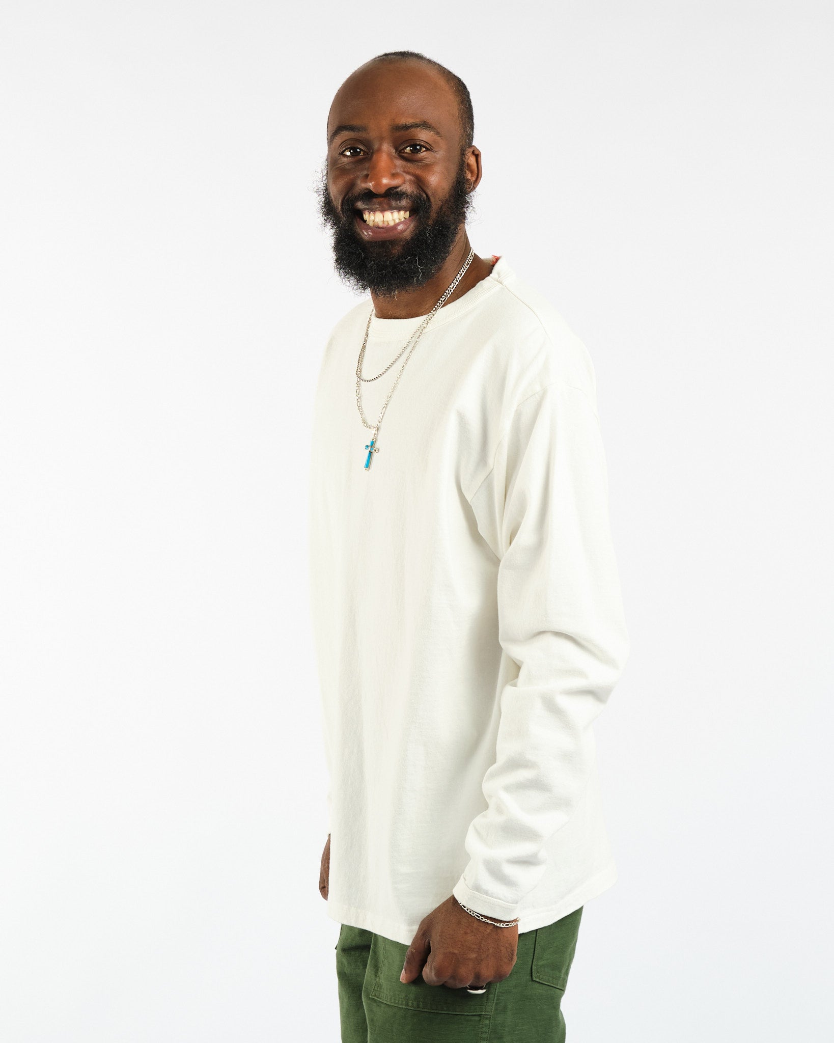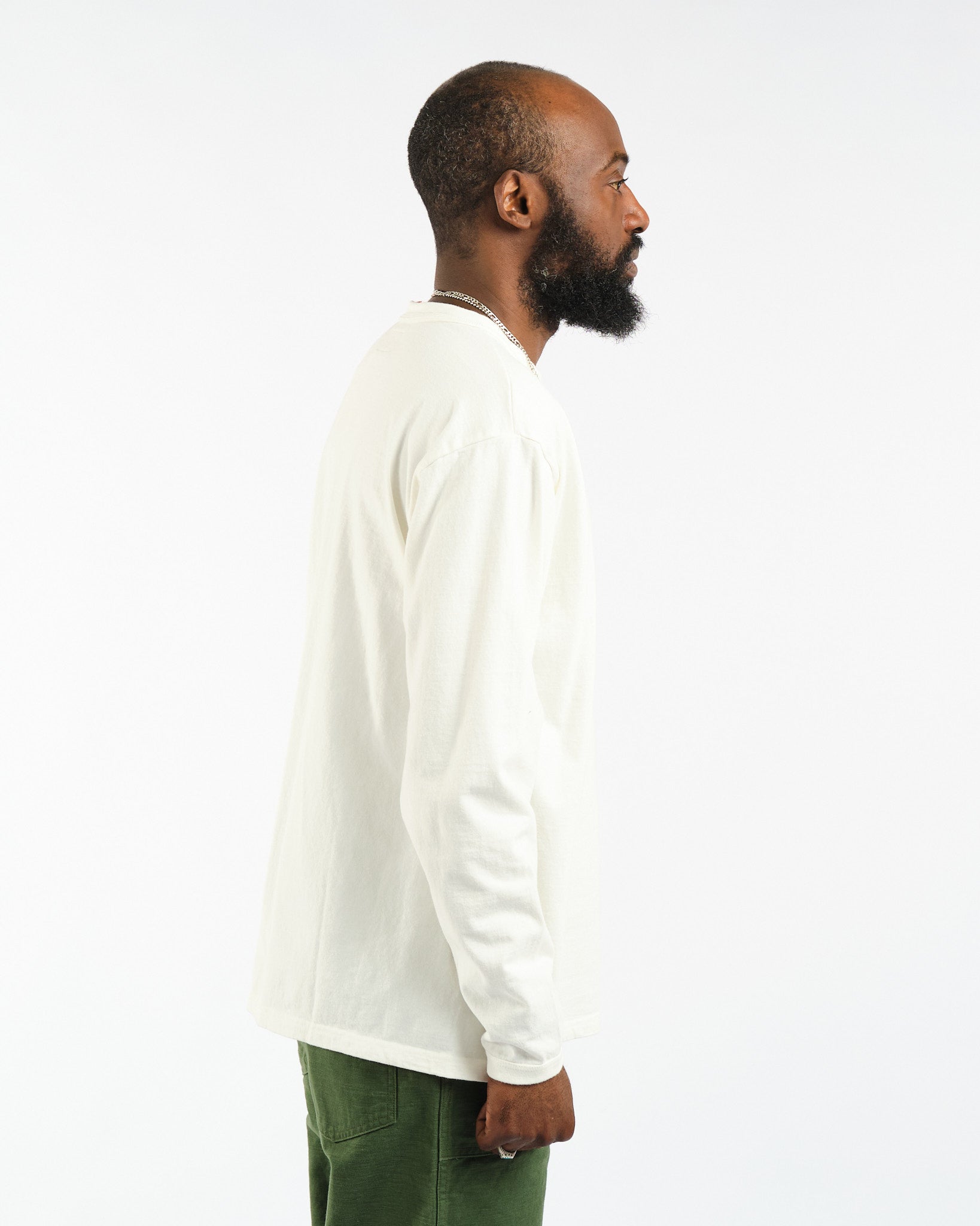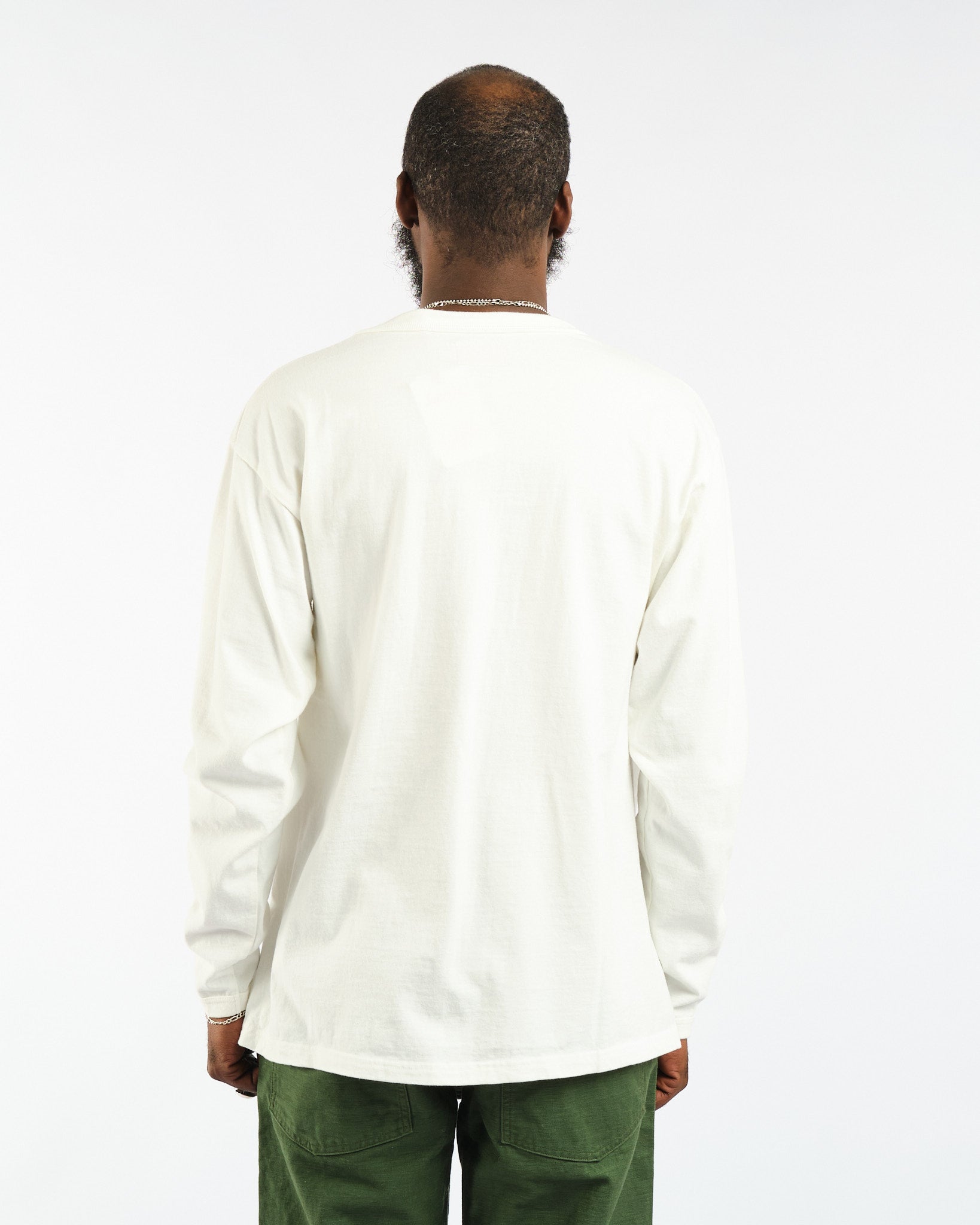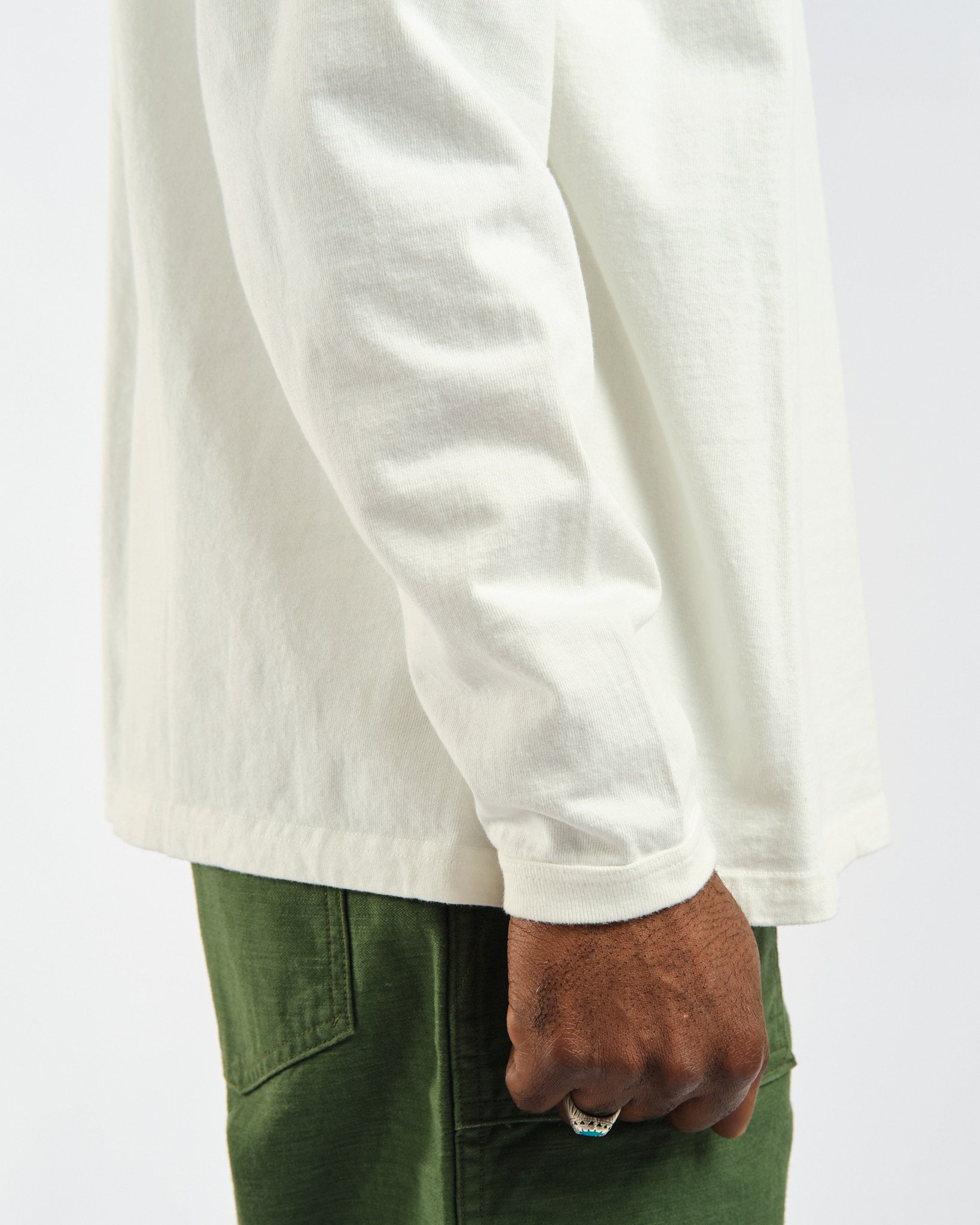 Makaha LS T-Shirt Off White van Sunray Sportswear. Sunray T-shirts hebben een traditionele pasvorm geïnspireerd door het gevoel van de jaren 50. Ontspannen, vierkanter en iets korter dan een moderne pasvorm. De kraag, rib-ontwerp en stoffen zijn ook traditioneel. Sunray heeft ontwerpbescherming op het nekdetail van de Makaha T-shirts. 300 g. Gemaakt in Japan.