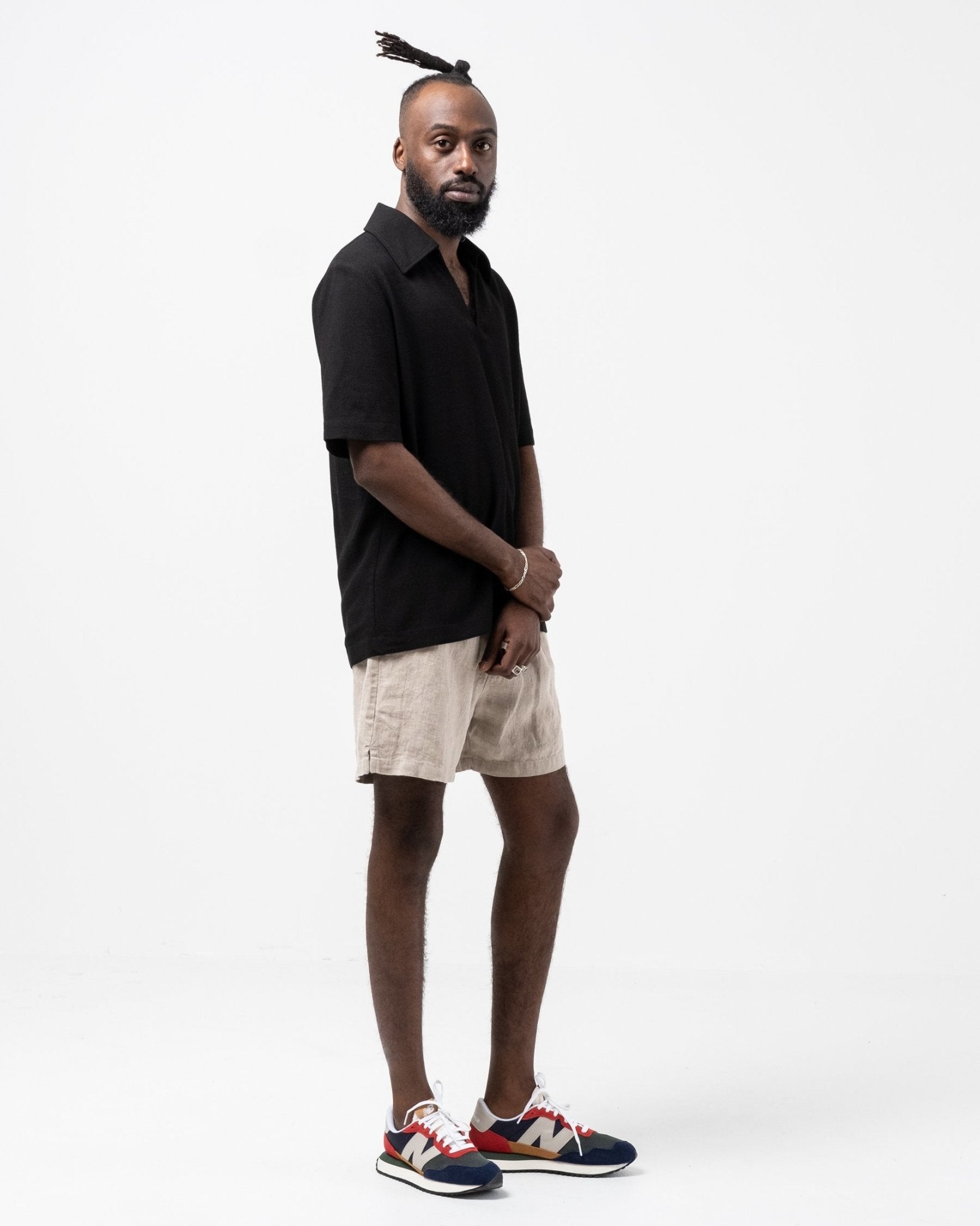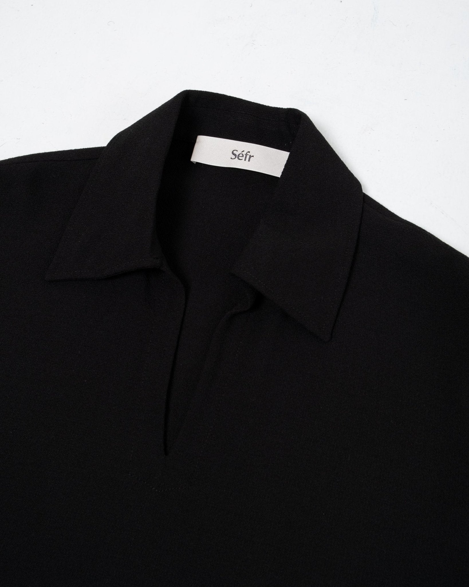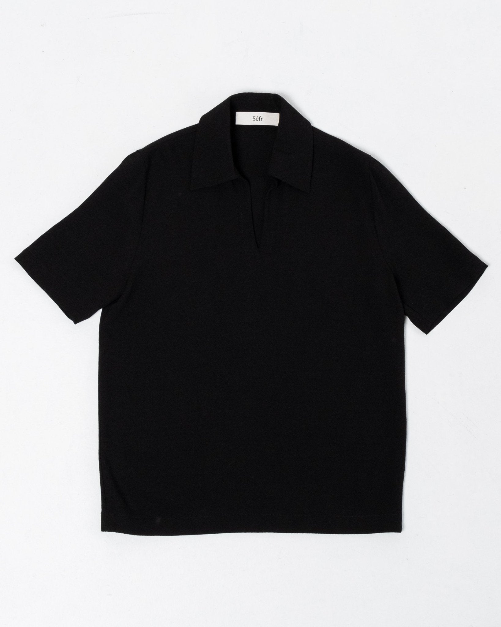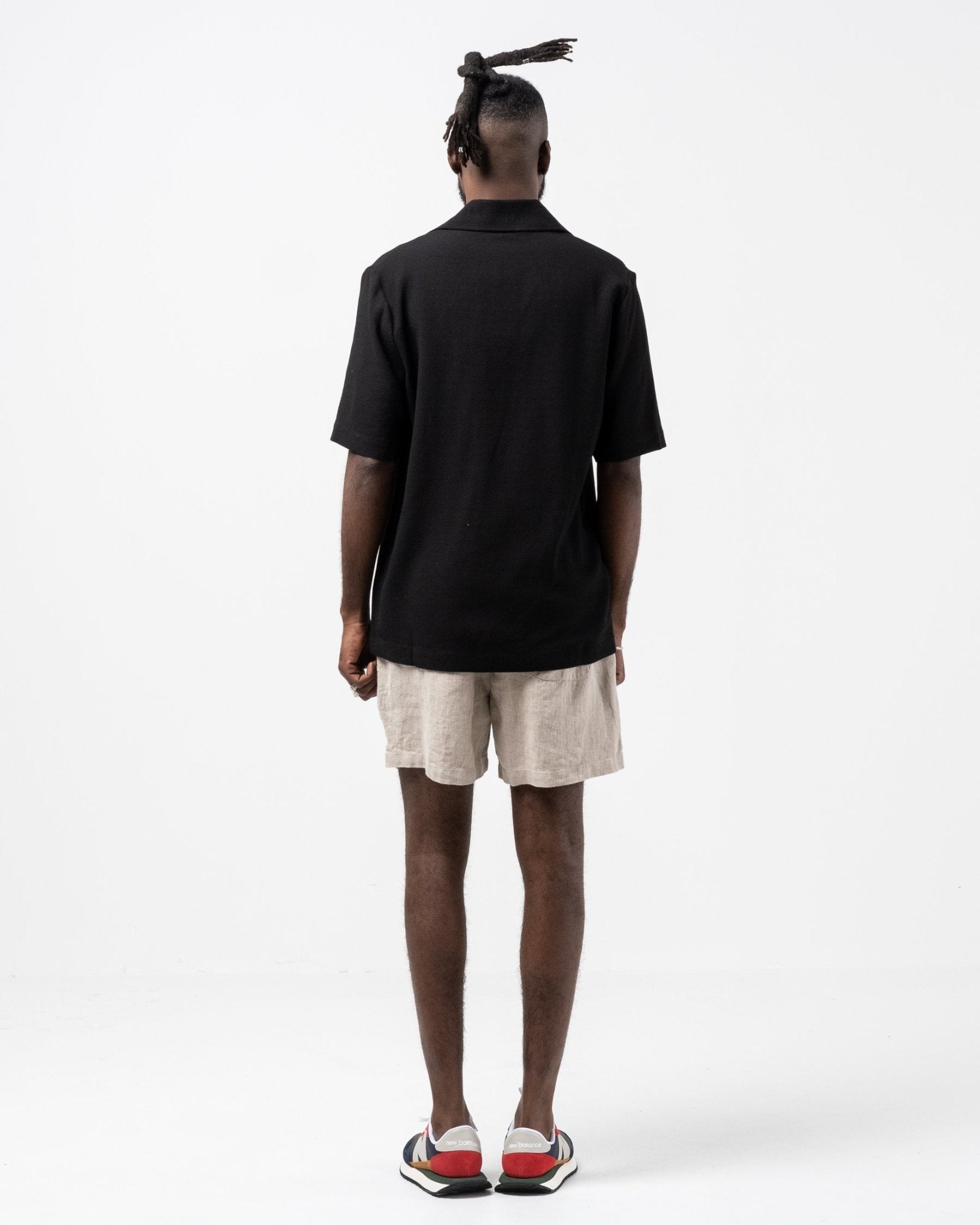Mate SS Shirt Black van Séfr. Korte mouwen overhemd met een brede kraag. Ontspannen pasvorm met een rechte zoom. 60% viscose en 40% wol. Gemaakt in Letland.