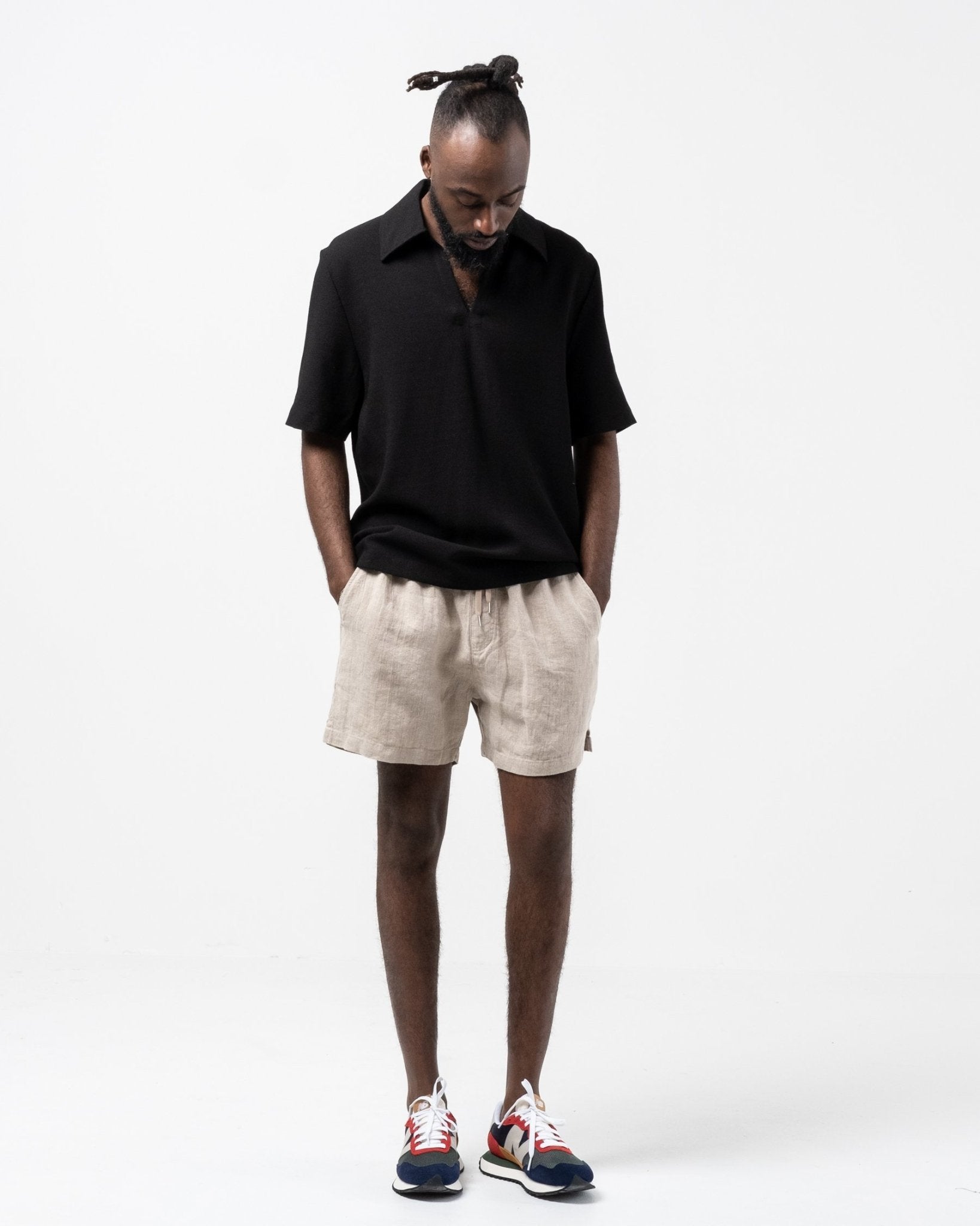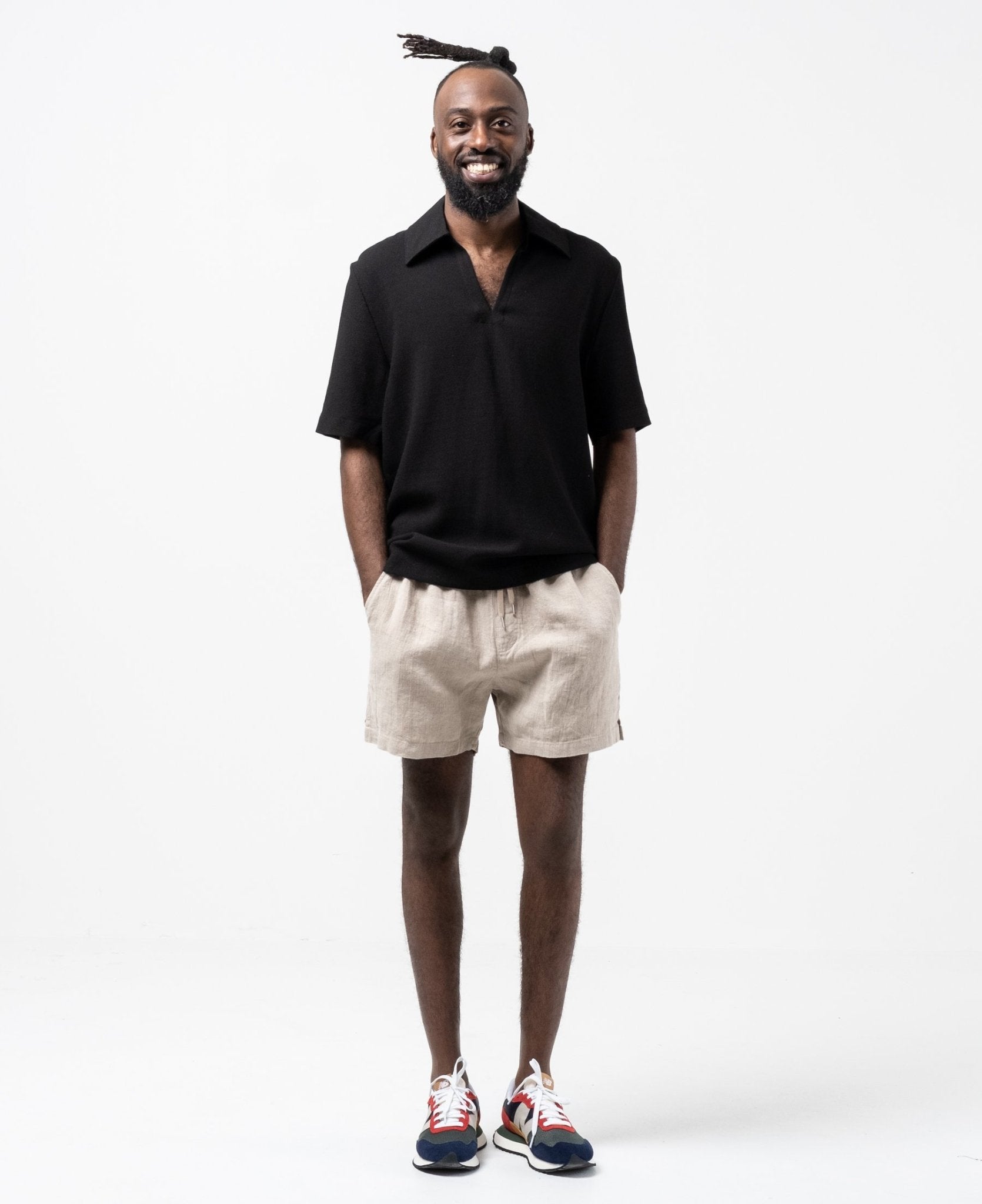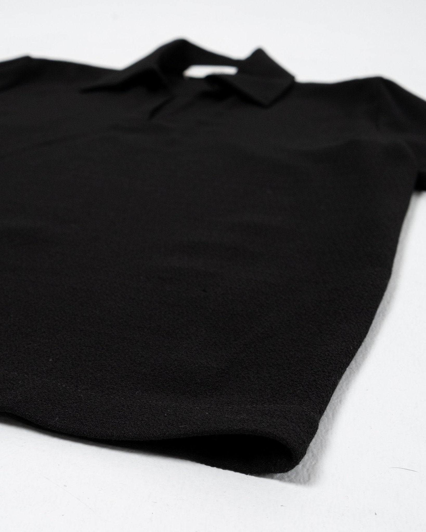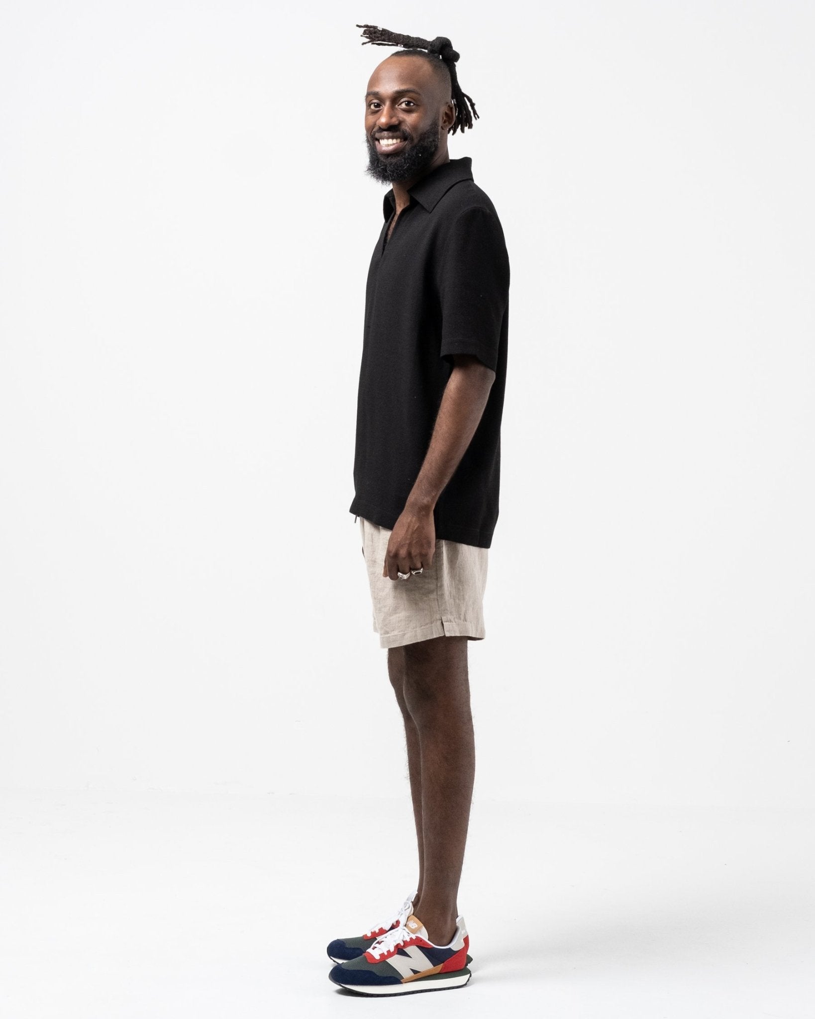 Mate SS Shirt Black van Séfr. Korte mouwen overhemd met een brede kraag. Ontspannen pasvorm met een rechte zoom. 60% viscose en 40% wol. Gemaakt in Letland.