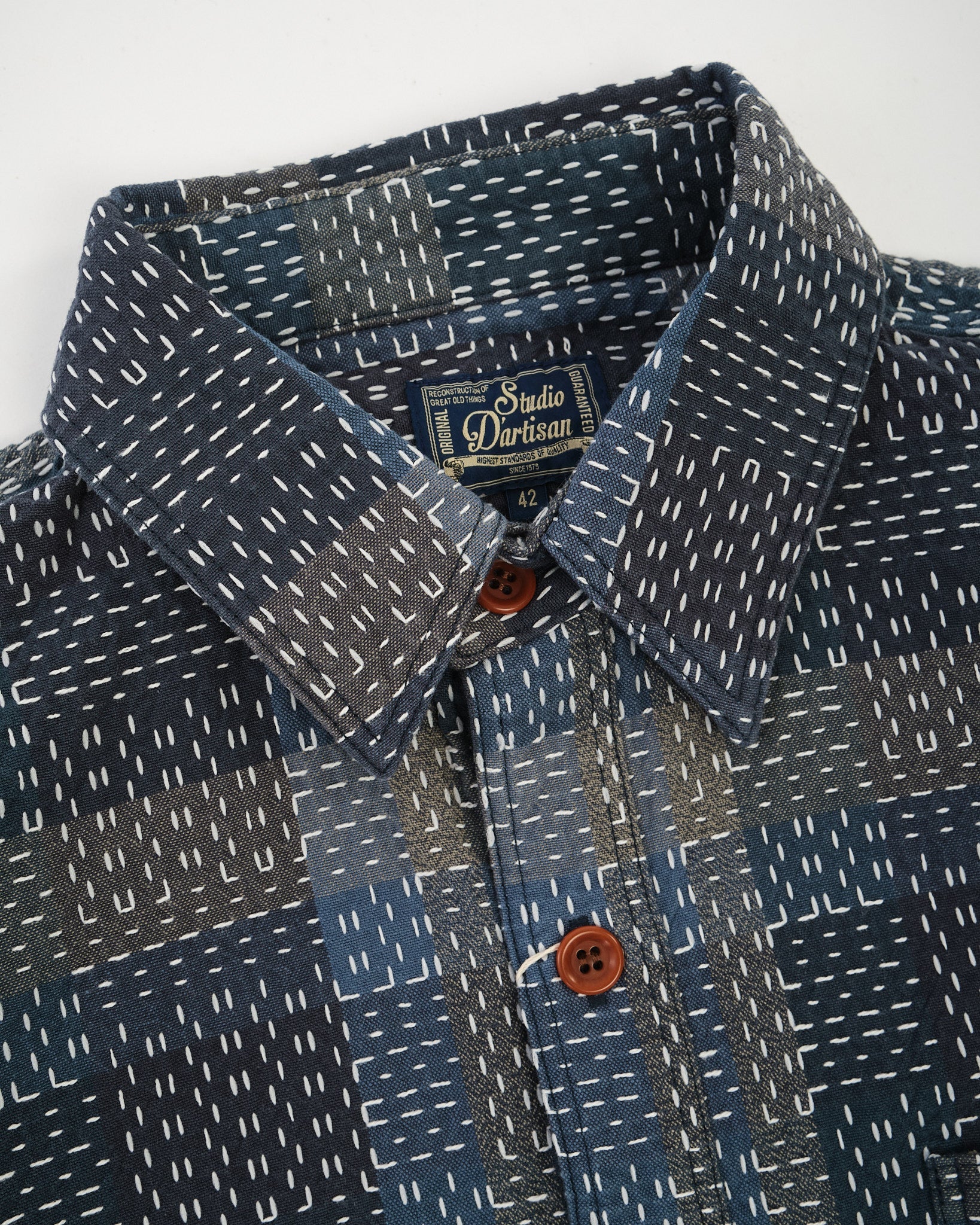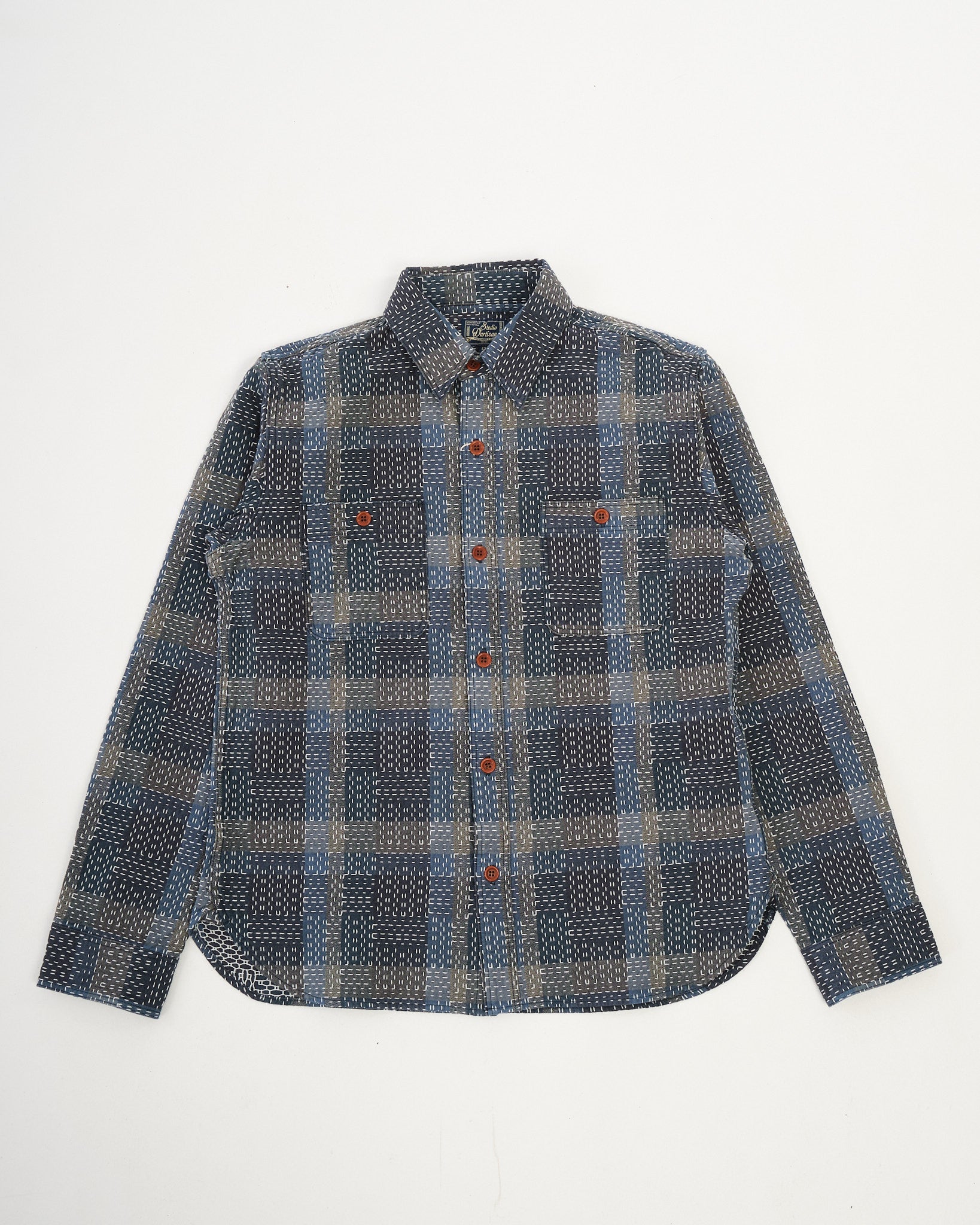Het STUDIO D'ARTISAN Noragi Sashiko Shirt (5651) is een moderne interpretatie van traditionele Japanse werkkleding, geïnspireerd door Noragi, de robuuste kleding gedragen door arbeiders in vroegere eeuwen. Ontworpen met sashiko stiksels zowel verticaal als horizontaal, toont dit shirt een unieke handgemaakte esthetiek die eer betoont aan Japan's rijke textielerfgoed.