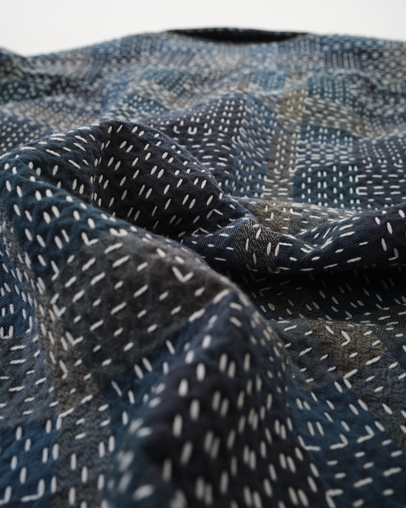 Om de warmte van handgestikte stoffen na te bootsen, variëren de stikrichting en type over het kledingstuk, wat zijn organische, getextureerde gevoel versterkt. Na het wassen krimpt de stof op natuurlijke wijze, resulterend in een complex, oneffen oppervlak dat diepte en karakter toevoegt aan het stuk.