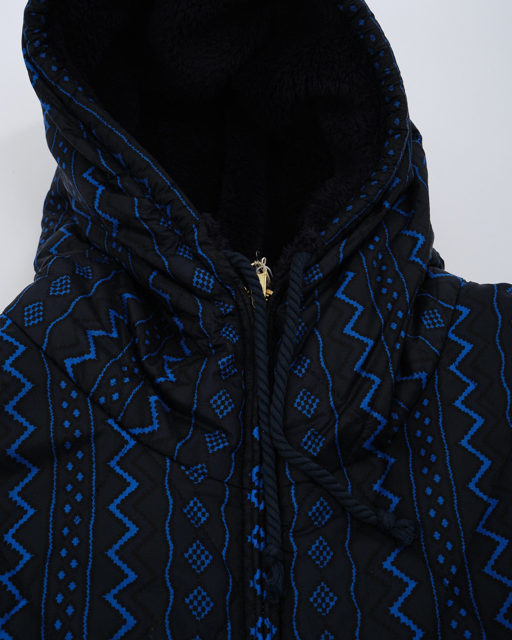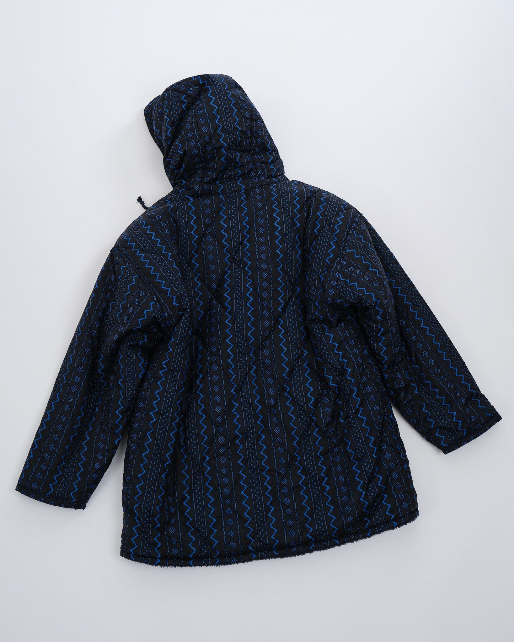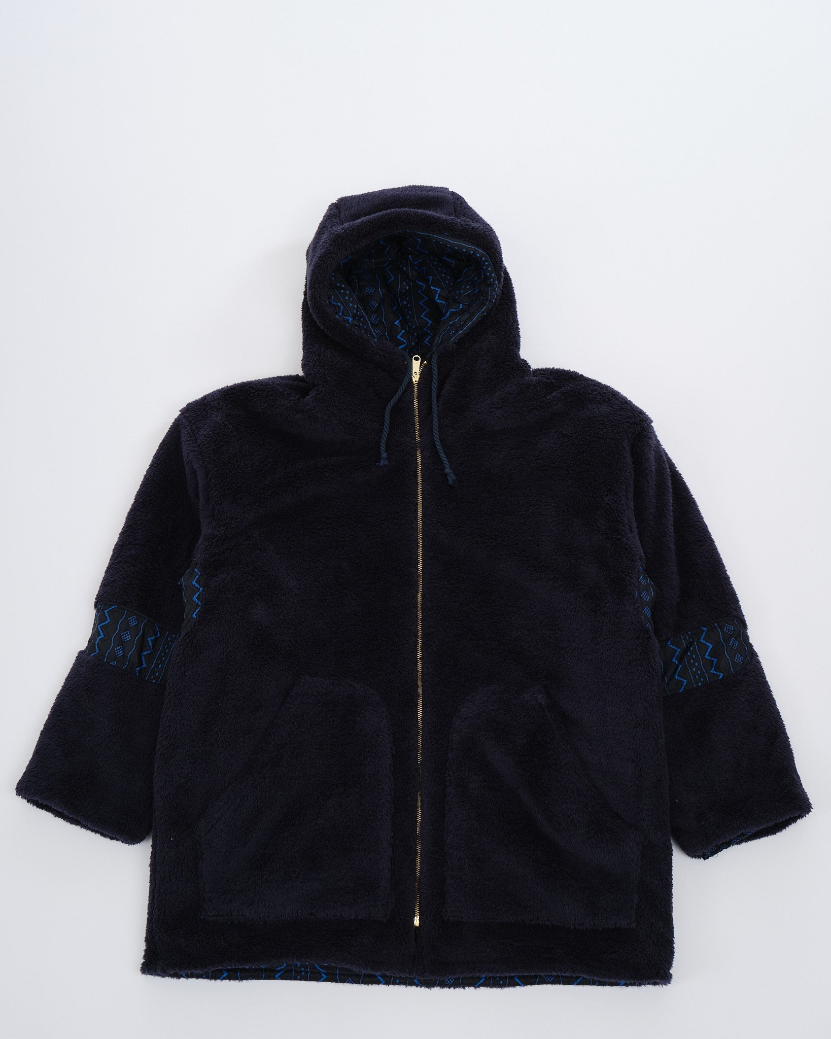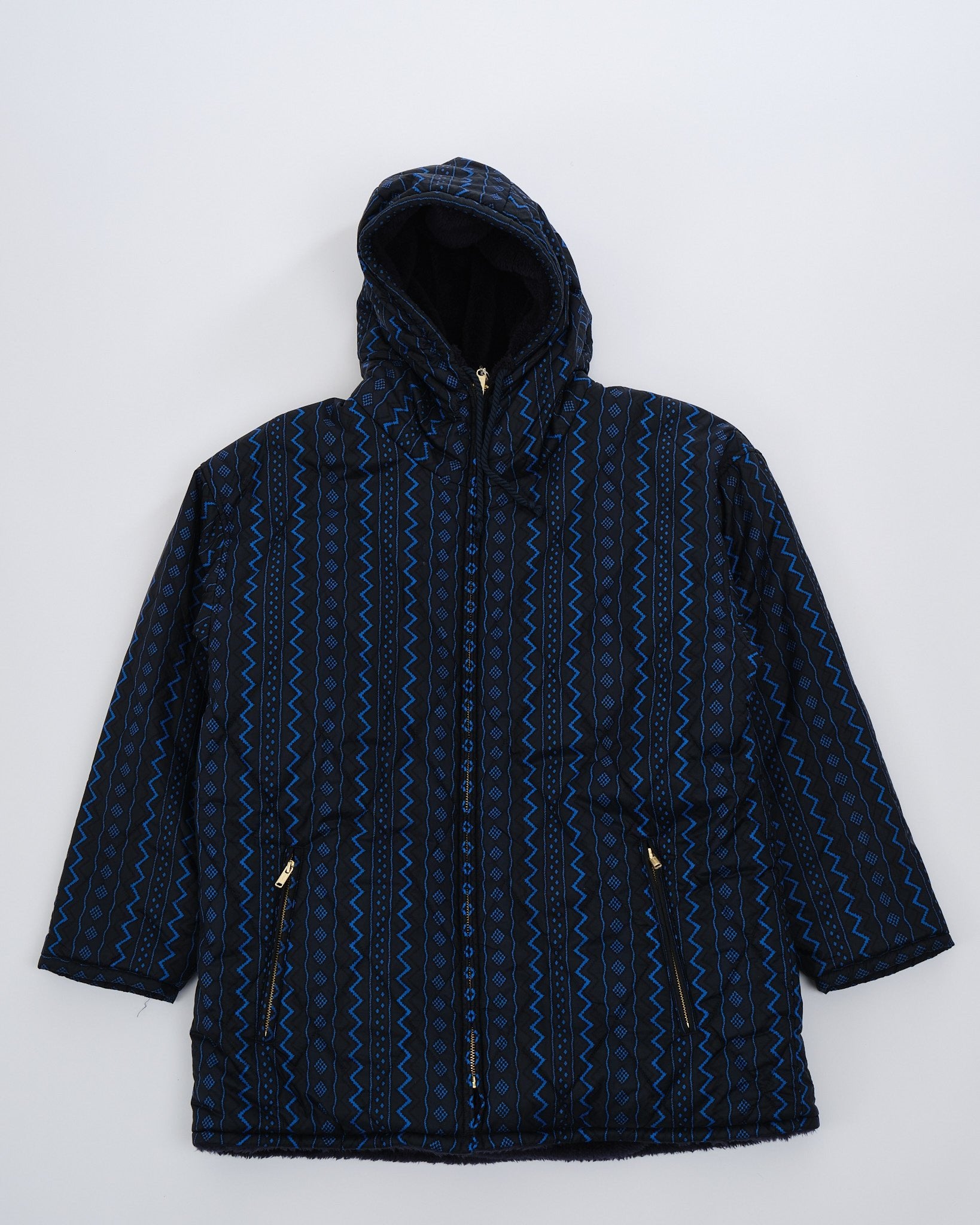 Dit is een volledig omkeerbare, zwart en marine geometrische jas. De ene kant is gevoerd met een pluizige zwarte stof, en de andere kant is gevoerd met een marine en zwart geometrische print. Twee zakken aan beide kanten van de jas. Normale pasvorm. Gemaakt in China.